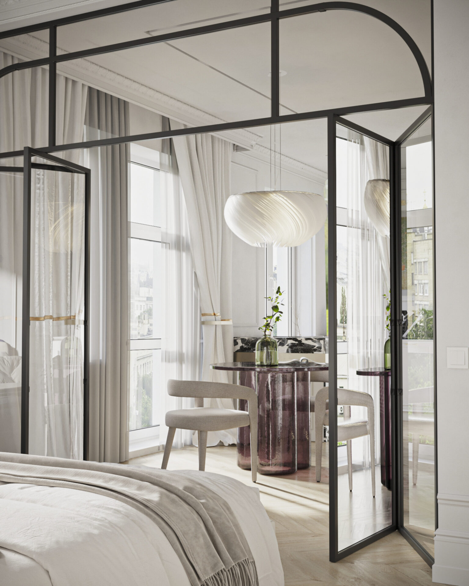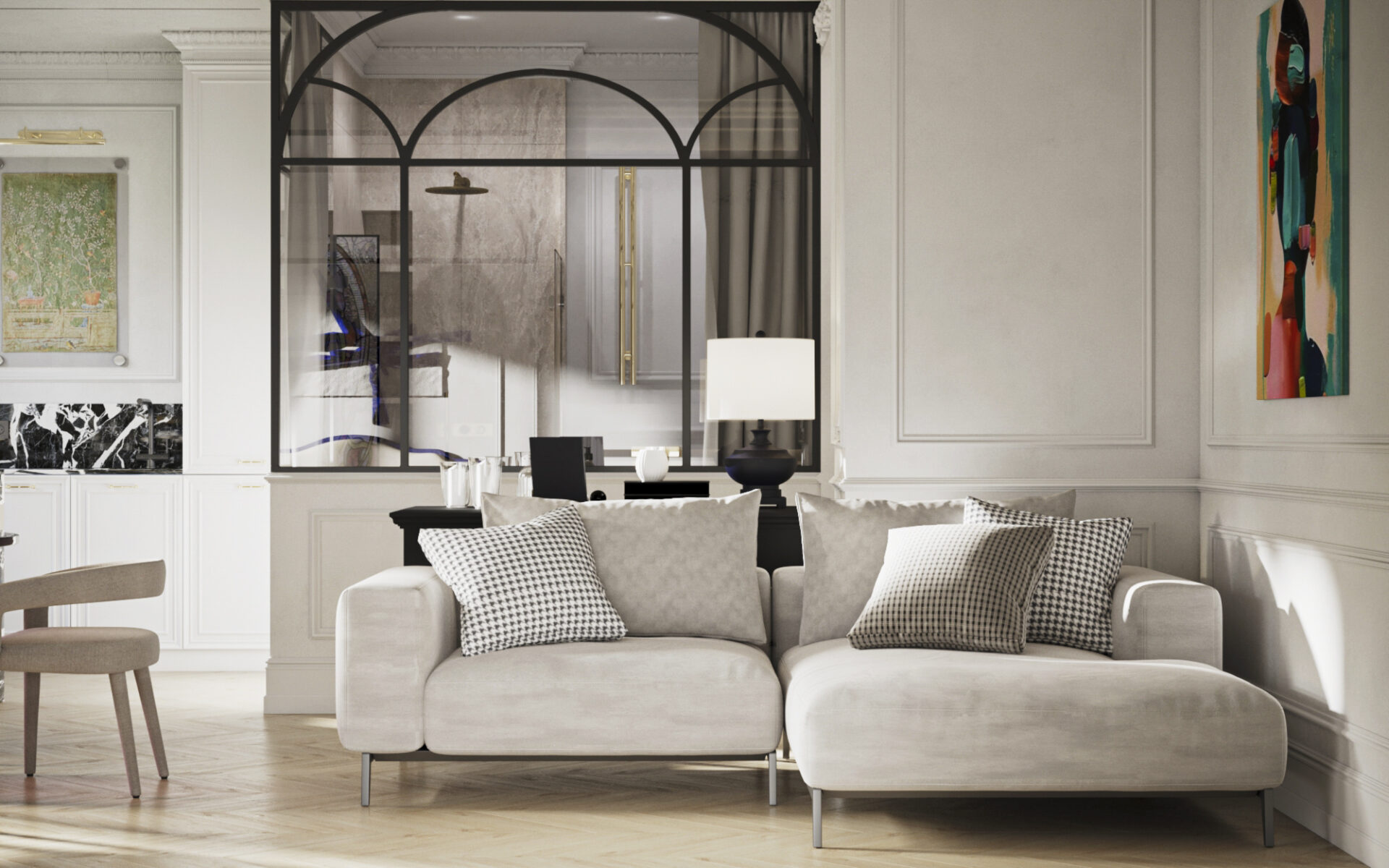 Квартиру 1959 года постройки в г. Минске мы изменили до неузнаваемости, объединив всё пространство воедино. Гостиная и спальня дают четкое ощущение общего пространства, но при этом сохранена приватность спальни. Изысканные стеклянные двери, с открытием по принципу ставень, еще больше погружают в камерную атмосферу пространства.