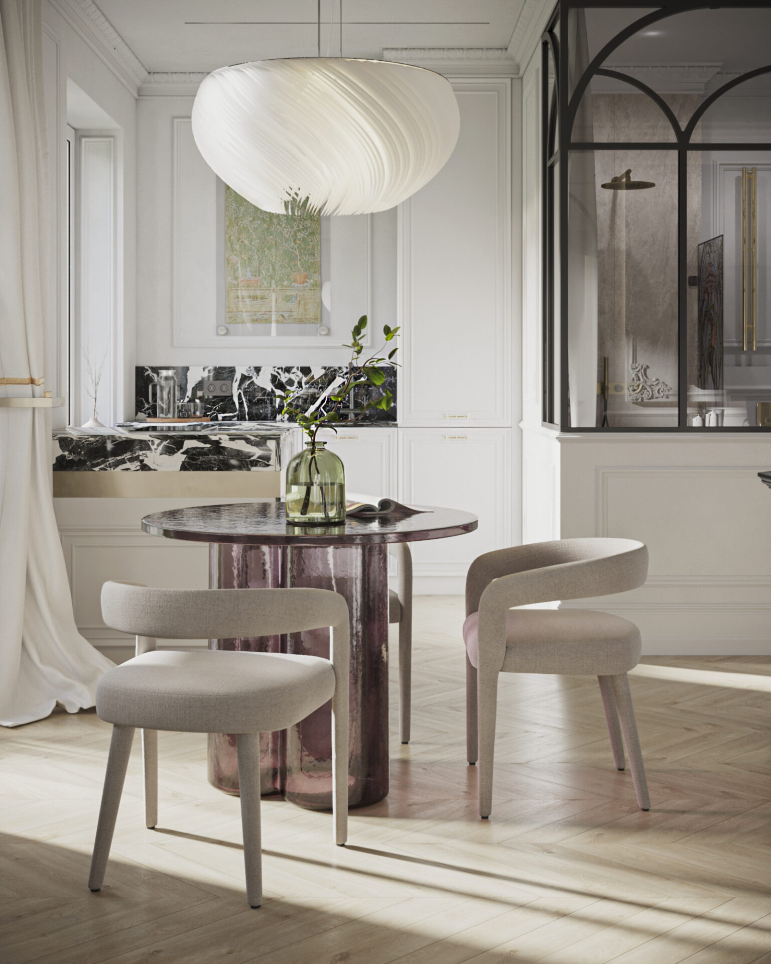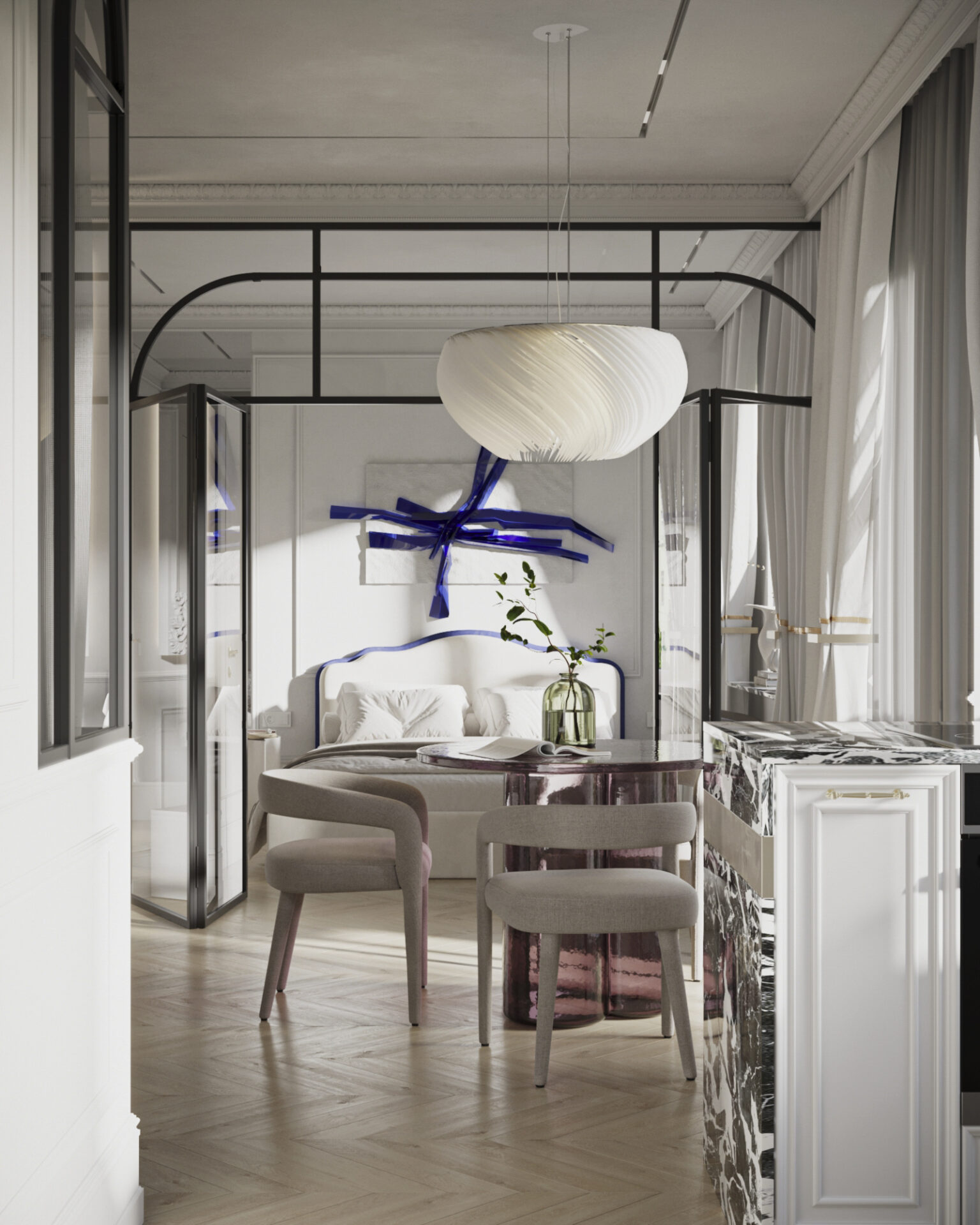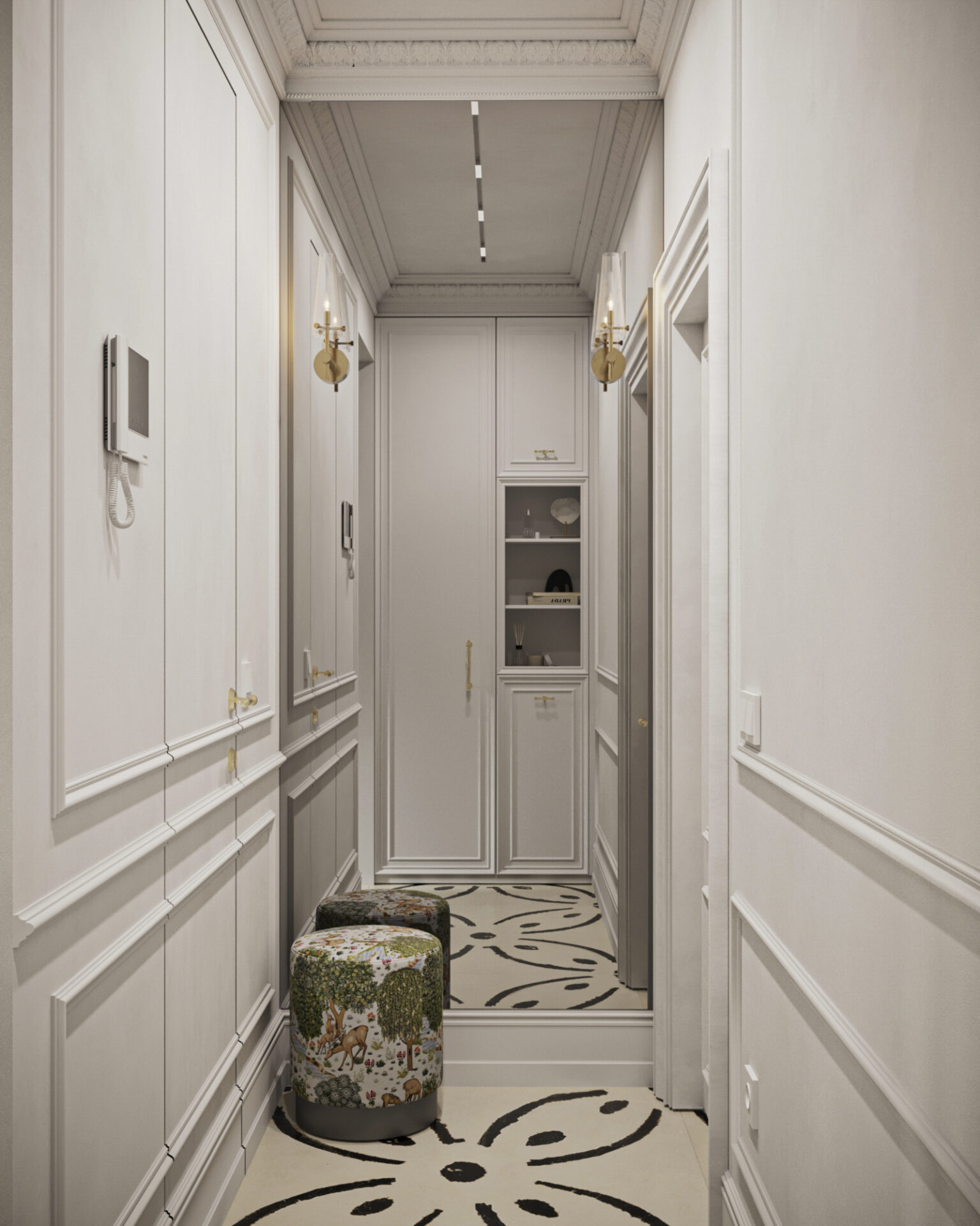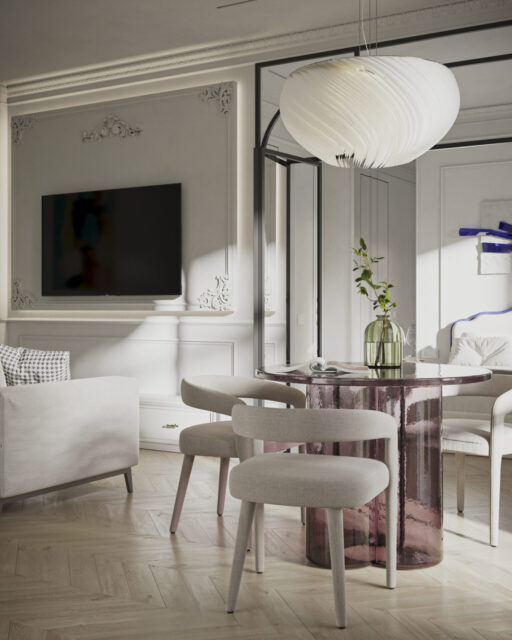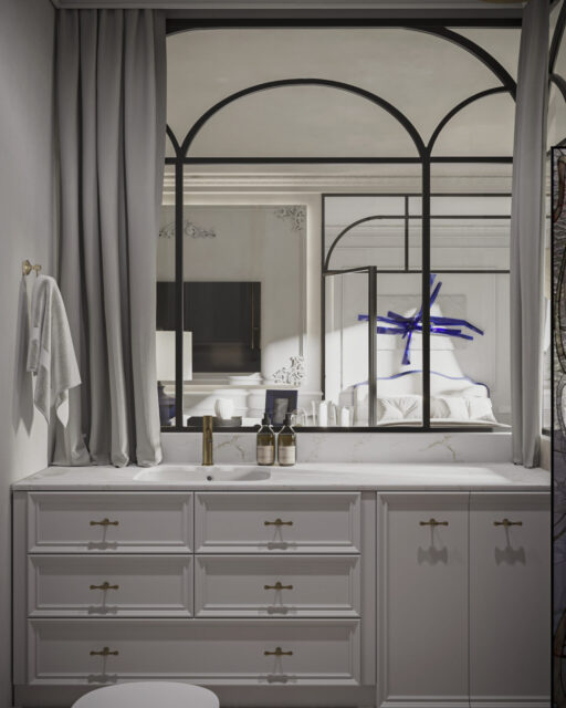 В помощью архитектурного декора, мрамора, стекол разных цветов, высоких потолков, арт объектов нам удалось создать атмосферу французского гранд-отеля по площади 45 м.кв..