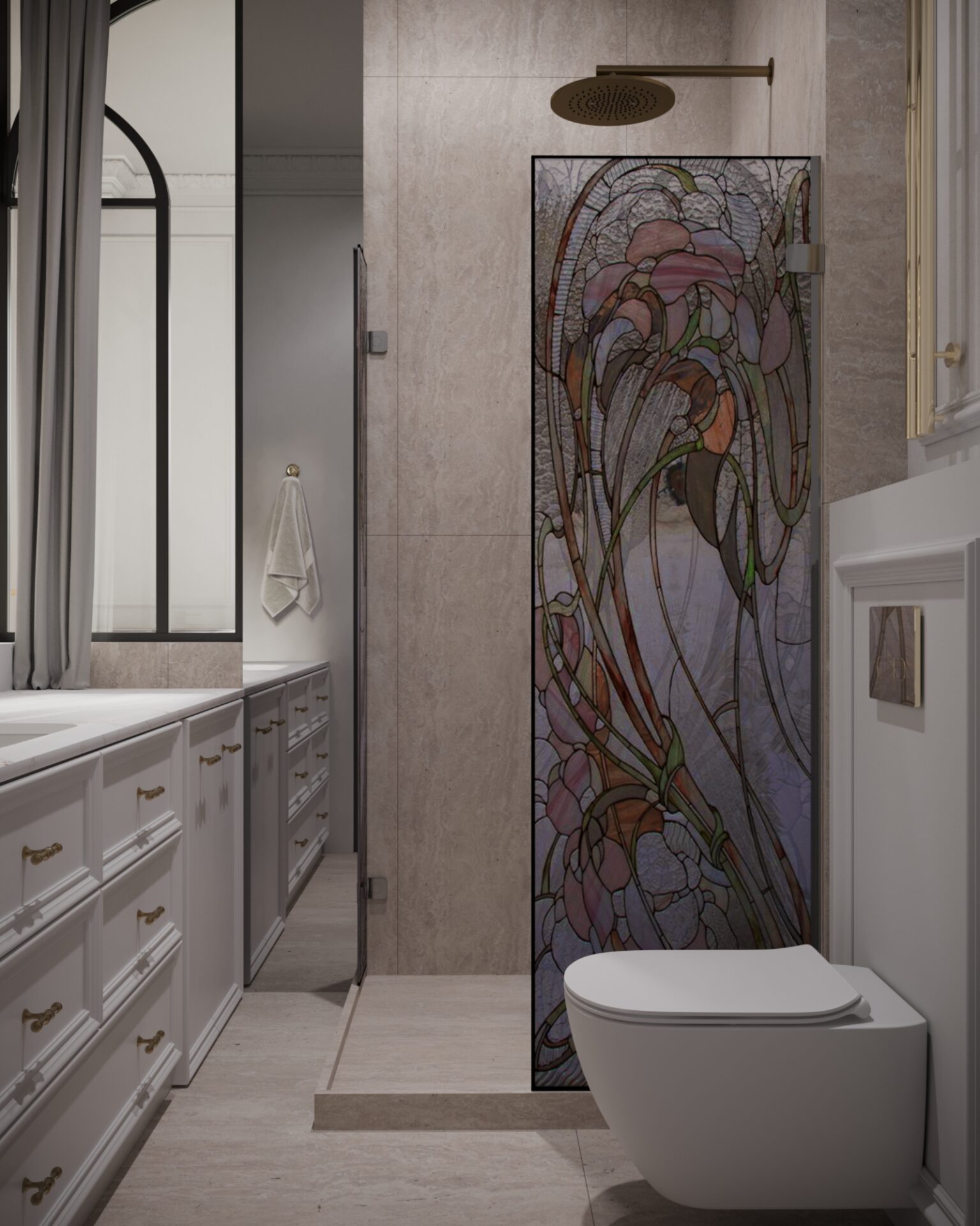 Не смотря на то, что ванная комната граничит с гостиной, мы кокетливо приоткрыли ее стеклянной перегородкой, что добавляет шарм и интригу.