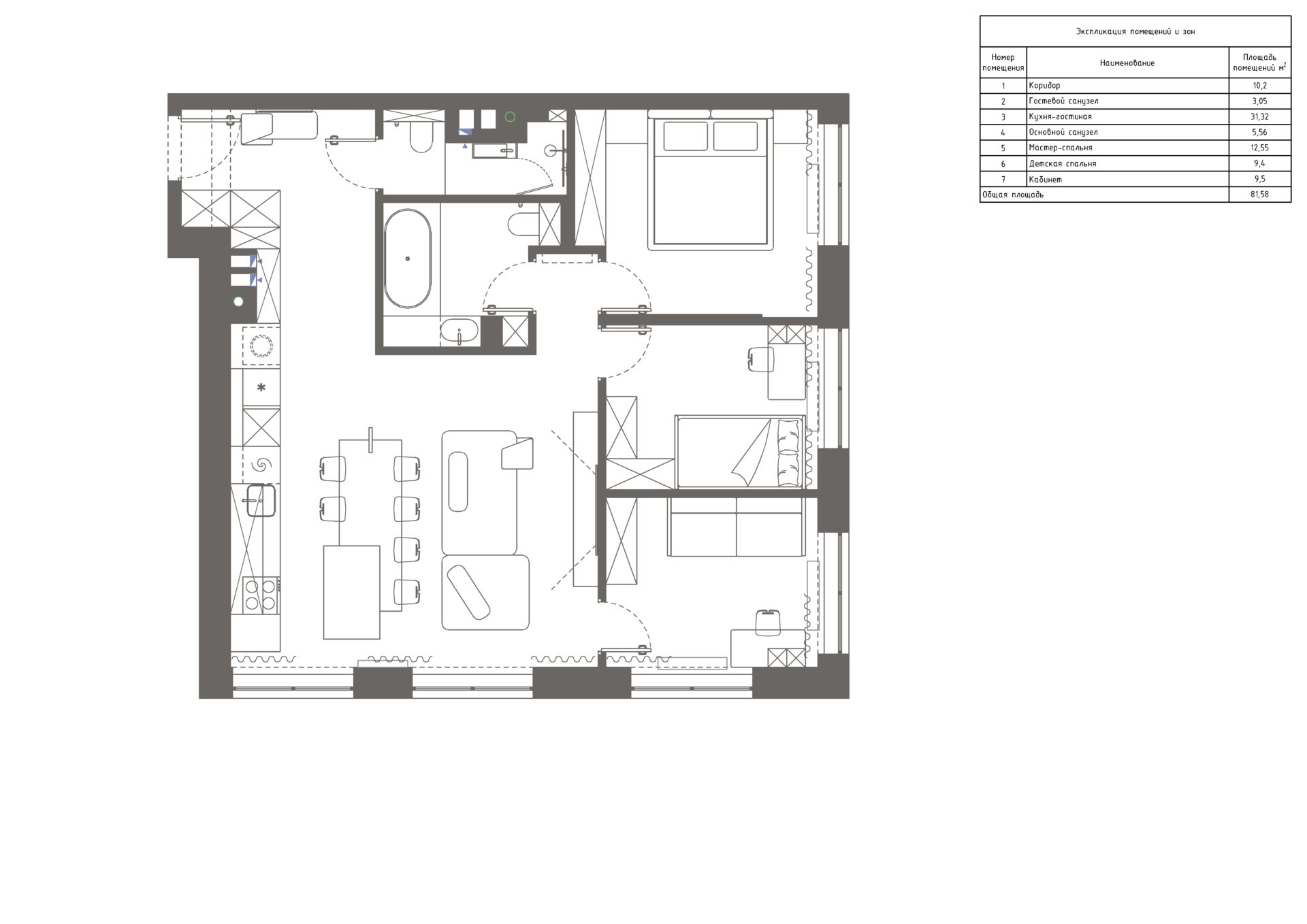 Нам удалось скомпоновать все пожелания клиента в грамотную планировку, учитывая нормы эргономики, расположение помещений относительно сторон света, а также жесткие нормы согласования перепланировок.