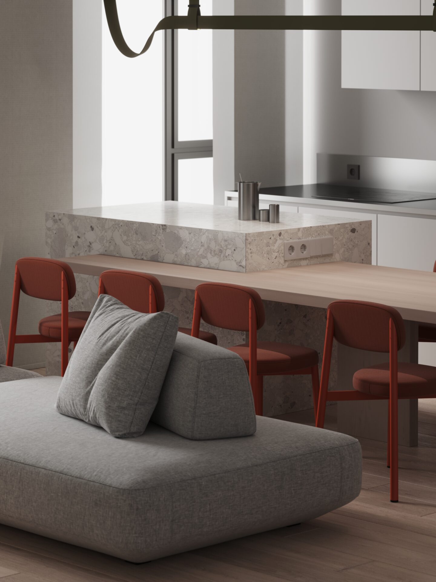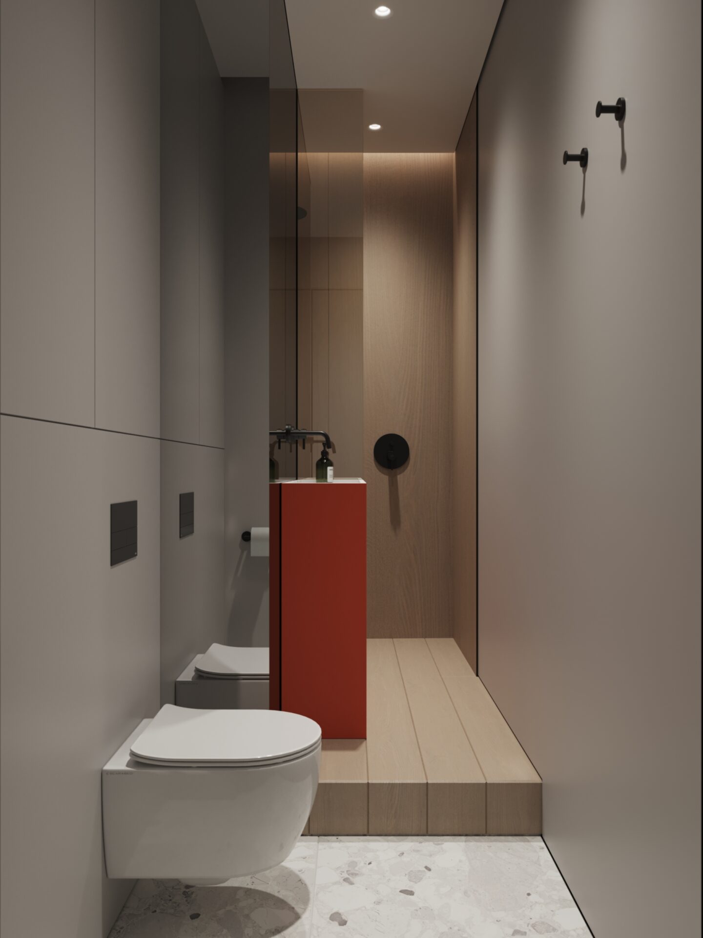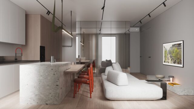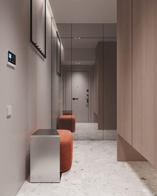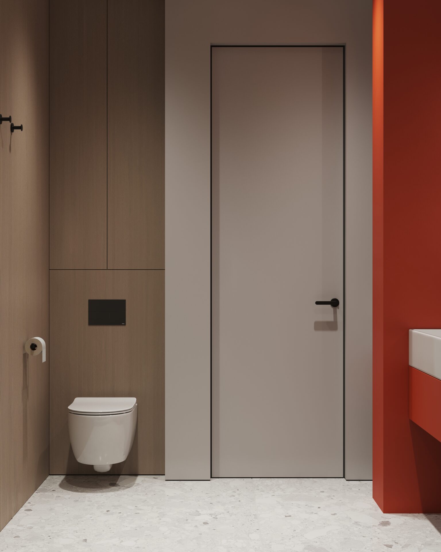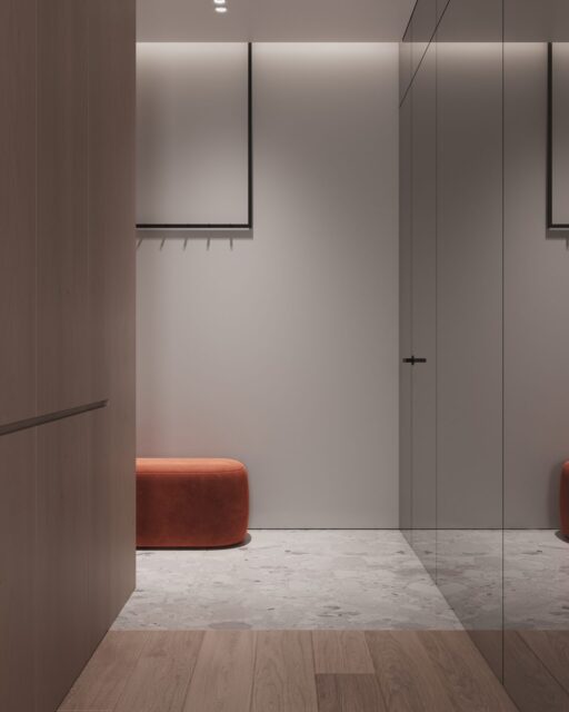 Ненавязчивые акценты оранжевого цвета не дают заскучать среди сочетания текстур каменного террацо, приглушённых оттенков дерева и фоновых серых оттенков стен.