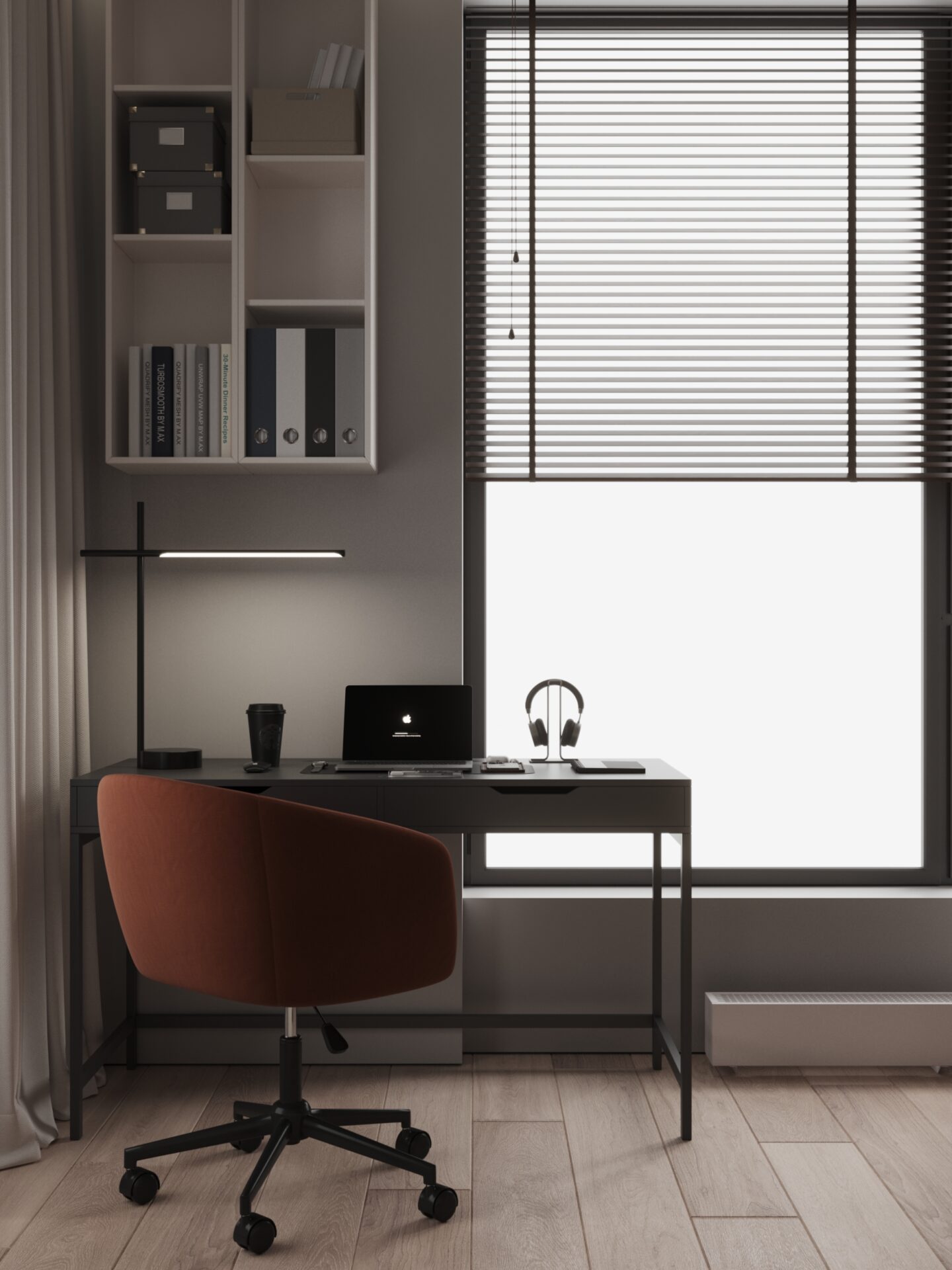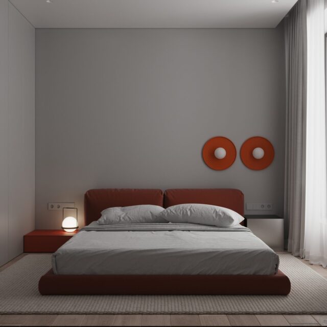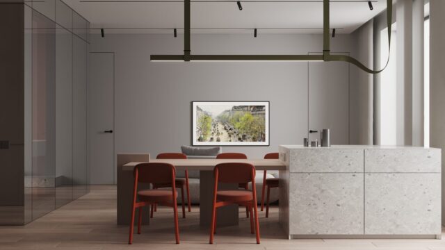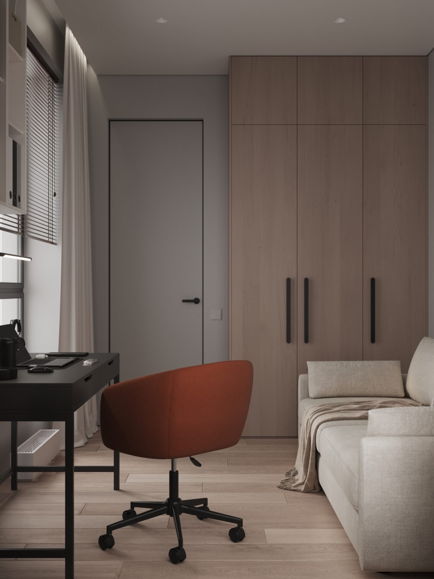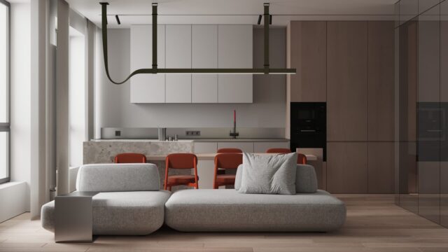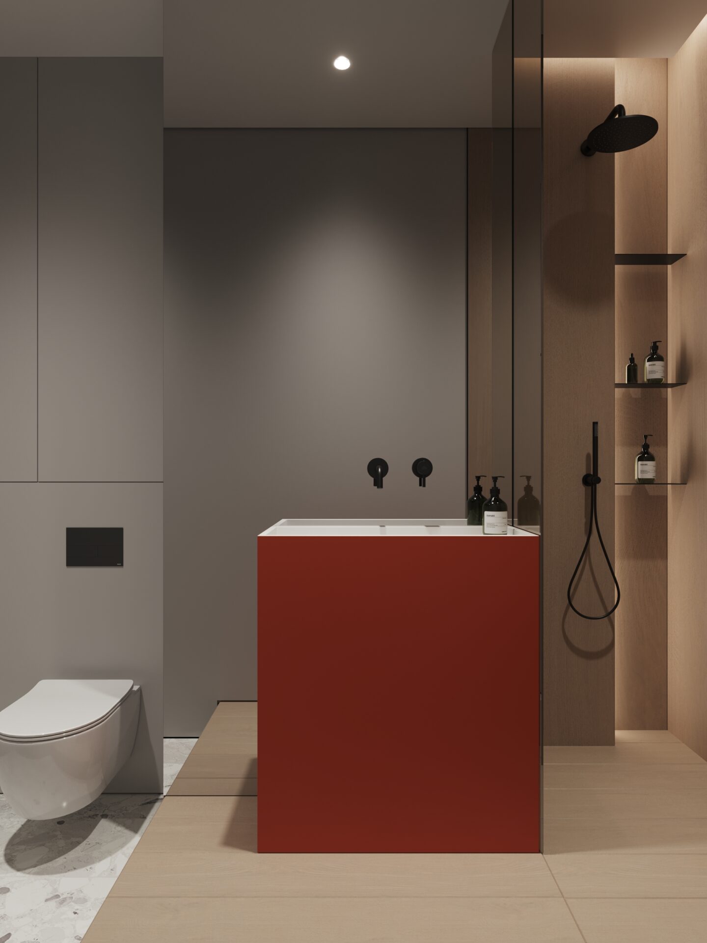 Ненавязчивые акценты оранжевого цвета не дают заскучать среди сочетания текстур каменного террацо, приглушённых оттенков дерева и фоновых серых оттенков стен.