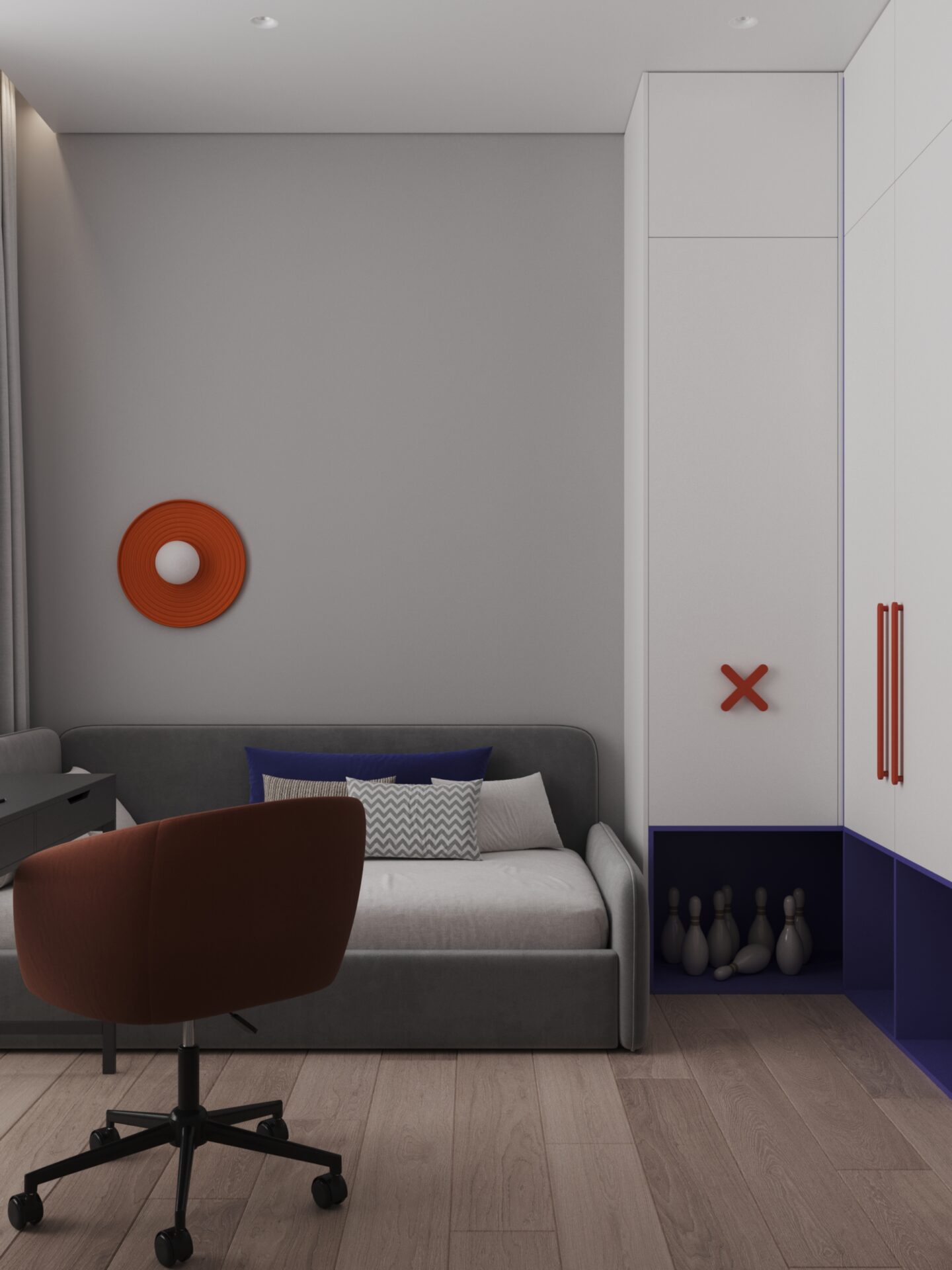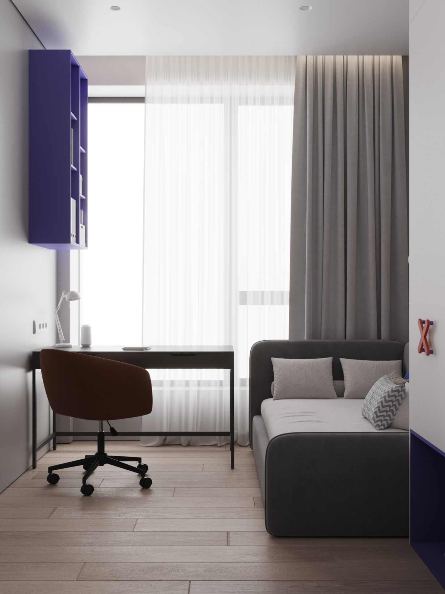 Навигация продумана таким образом, что при входе в квартиру вы попадаете в зоны общего пользования, а приватная зона находится противоположном углу. Мастер-спальня, детская и кабинет выходят на восток, а гостиная на запад, что поддерживает естественные биоритмы клиентов.