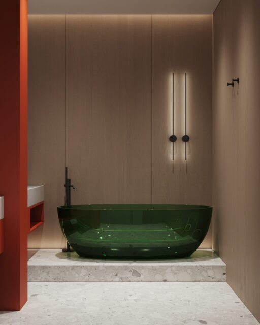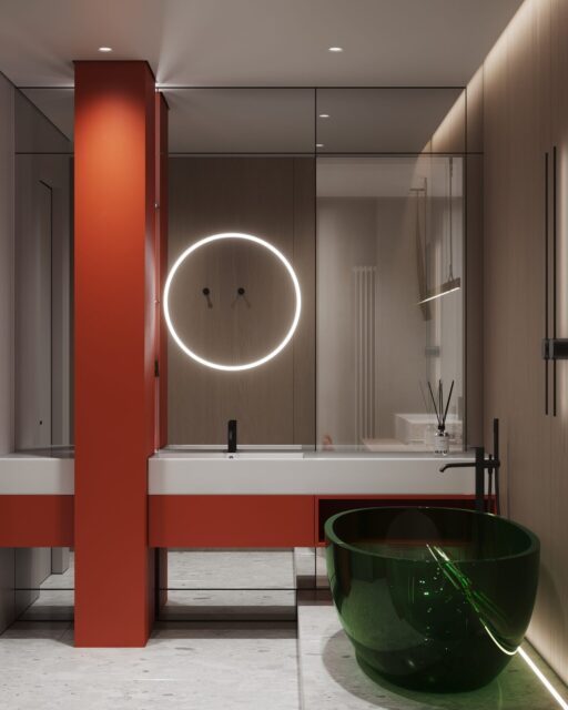 Санузлы разделены на гостевой и мастер-санузел не только перегородками, но и входами. В гостевой санузел вход из общей зоны квартиры, в мастер-санузел из приватной. Блок санузлов образует собой выступающий куб в зоне кухни-гостиной. Нам удалось нивелировать такую геометрию за счёт стеклянных панелей на стенах санузлов, а также дополнительно замаскировать двери «невидимки», ведущие в них. Кроме того, это визуально увеличило пространство как минимум в 2 раза, а расположение зеркал напротив окон даёт ещё больше света в дневное время суток и добавляет уюта в ночное время при приглушённом декоративном освещении. Зеркальные панели выполнены из тонированного зеркала для того, чтобы замаскировать оконный проём в мастер-санузел. Двойное остекление в этом проёме дает эффект зеркала, но при этом пропускает некоторое количество дневного света прямо из окон гостиной в санузел.