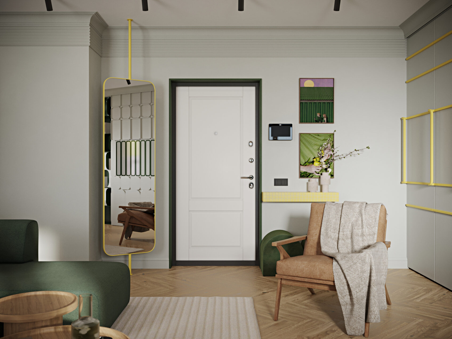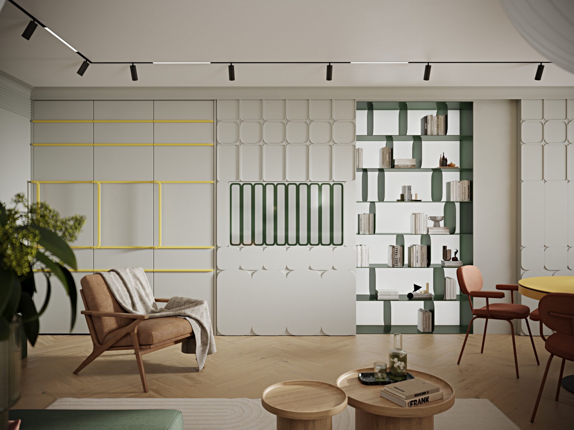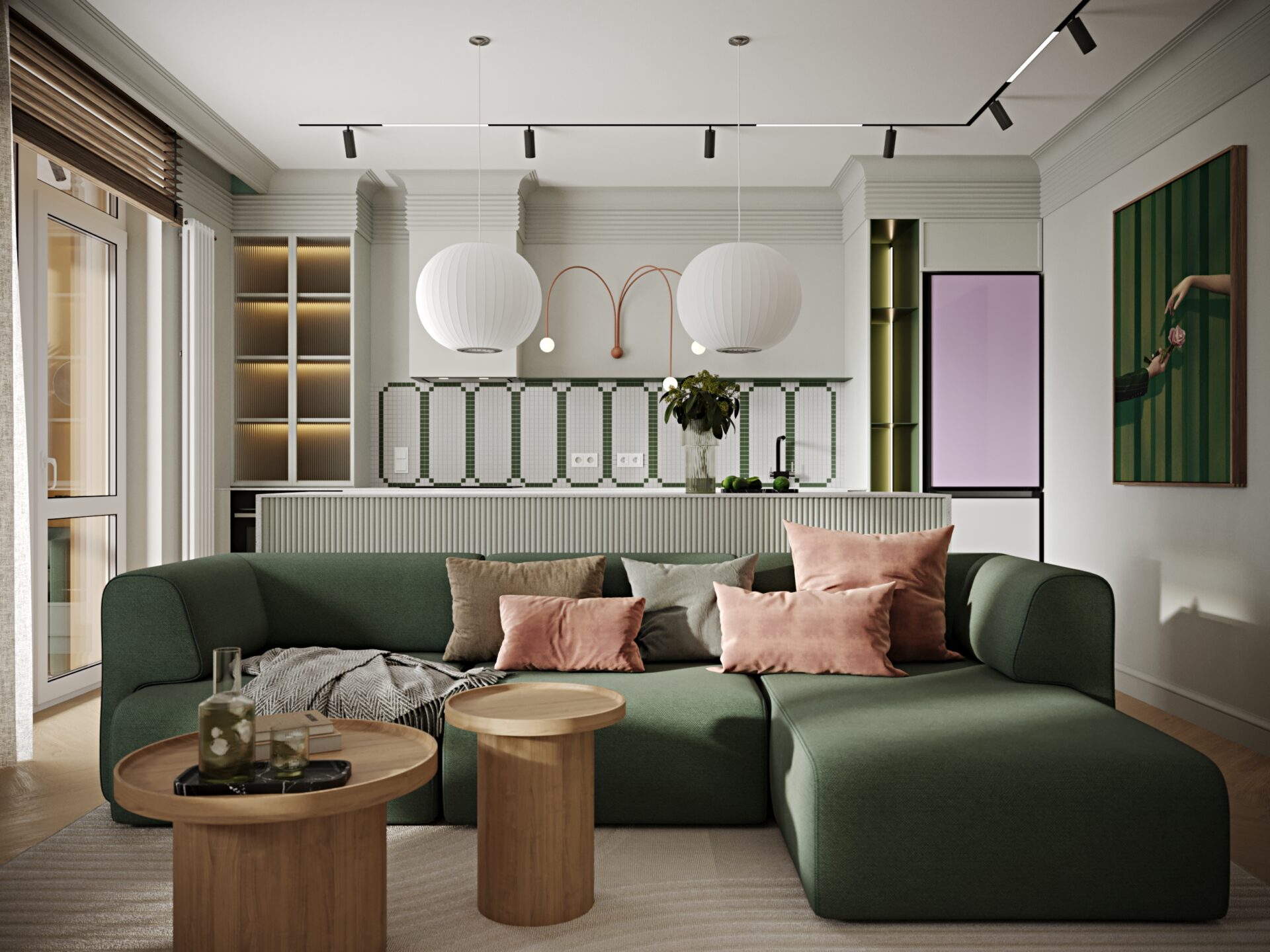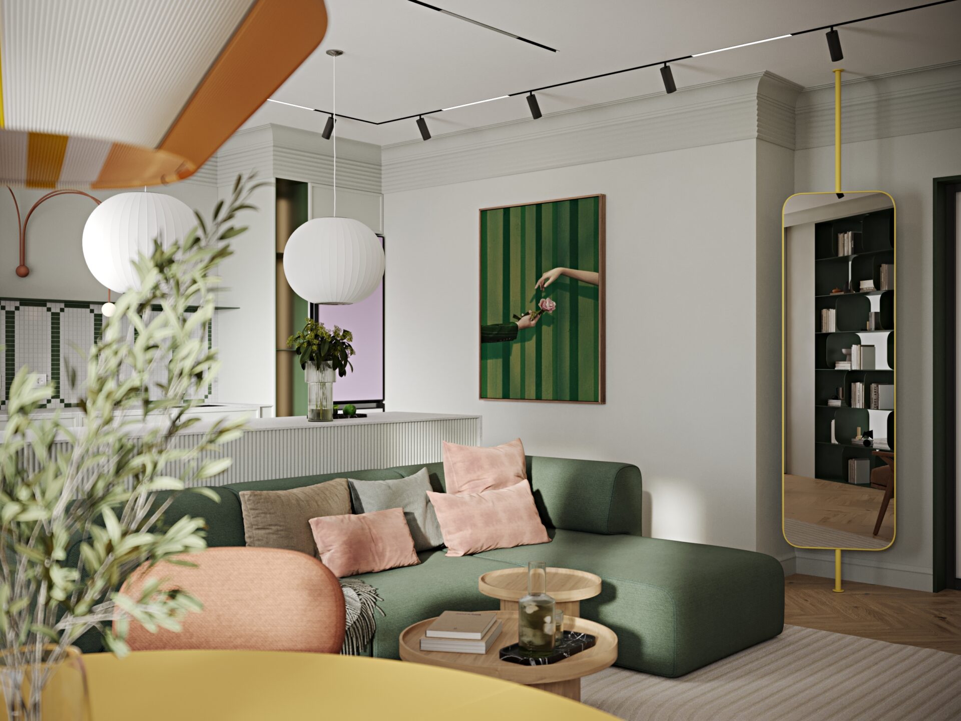 Основной задачей в работе над проектом квартиры в ЖК Левада было создание нетривиального цветного интерьера с индивидуальными, смелыми деталями. При этом важно было сохранить баланс между спокойной натуральностью и насыщенными акцентами.