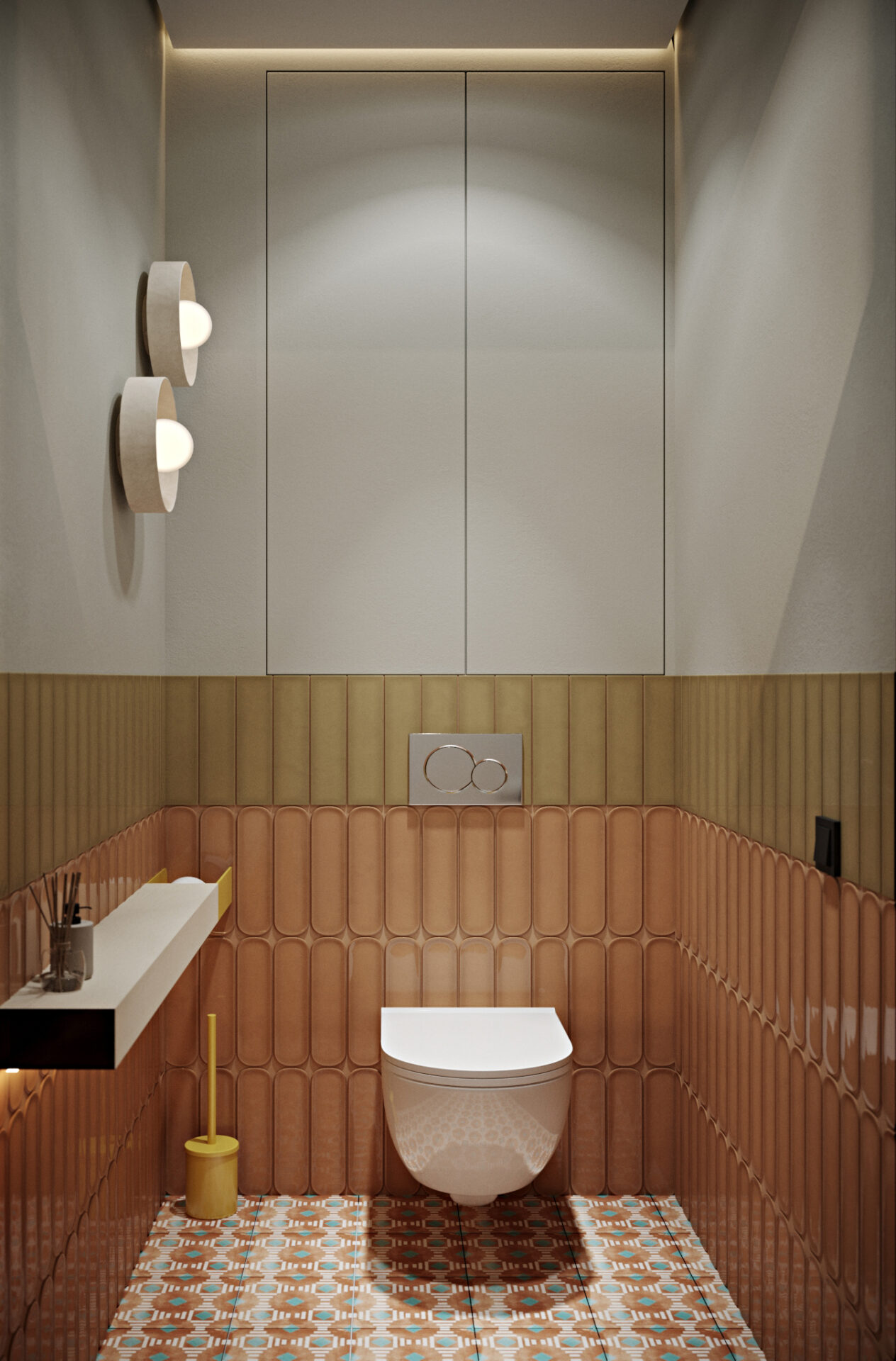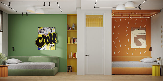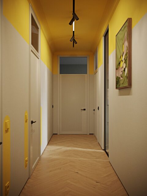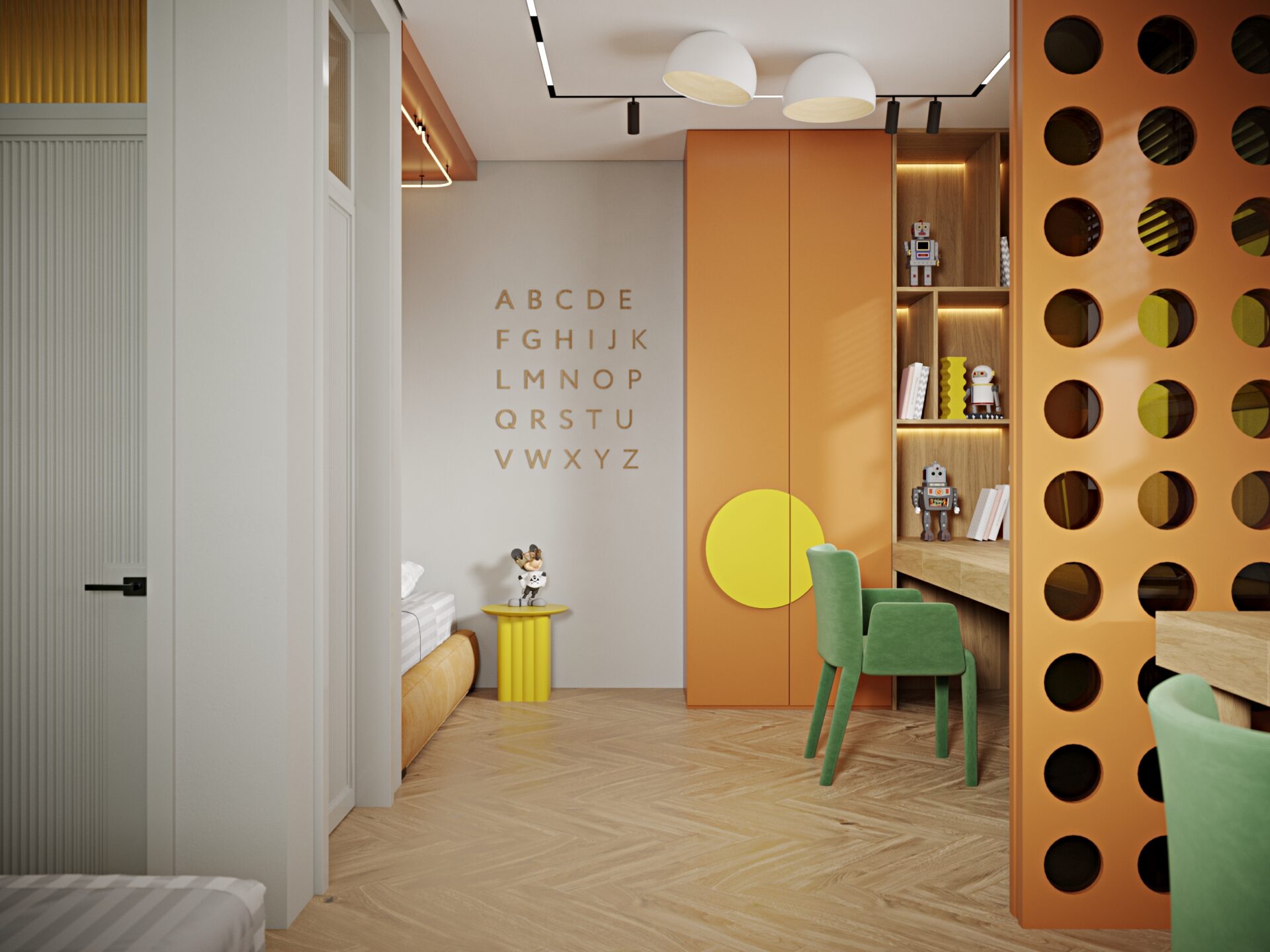 Яркие, акцентные цвета проекта поддерживаются в столовой зоне, детской, спальне и санузлах, а дизайн коридора никого не оставит равнодушным.