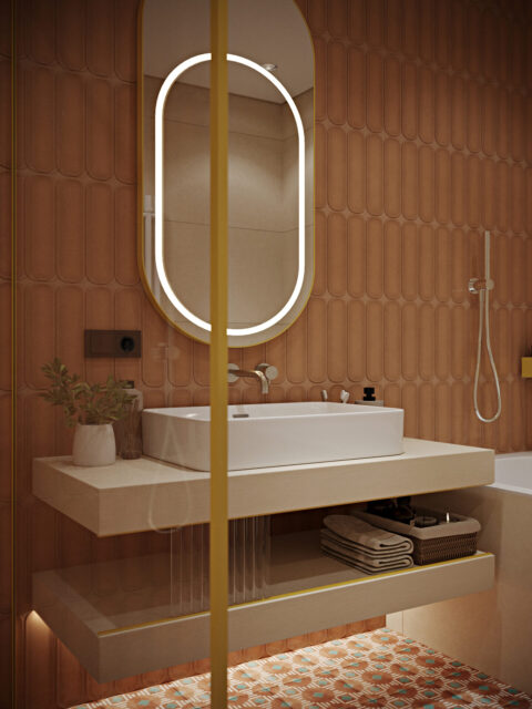 Самой первой деталью для интерьера стал принт, который затем силуэтами, формой, цветом тонкой нитью прослеживается во многих деталях всего проекта. Его можно увидеть в зоне кухни, выложенным мелкоформатной плиткой, и на заставке телевизора (кстати, попробуйте его найти 😉).