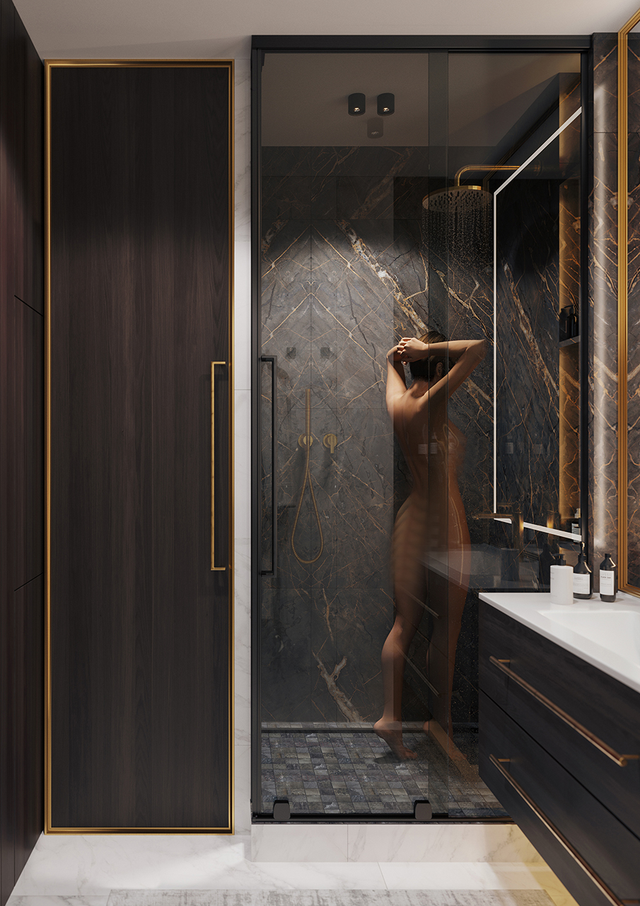 Санузлы сделали более сдержанными, но не менее эффектными. Возле душевой предусмотрели вместительный пенал с бытовой техникой.