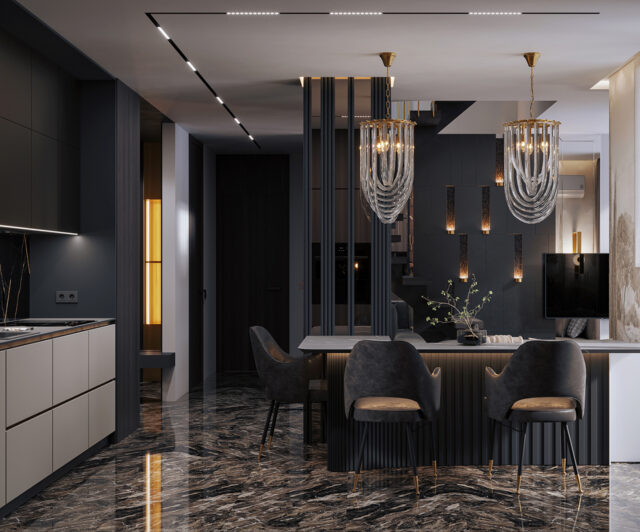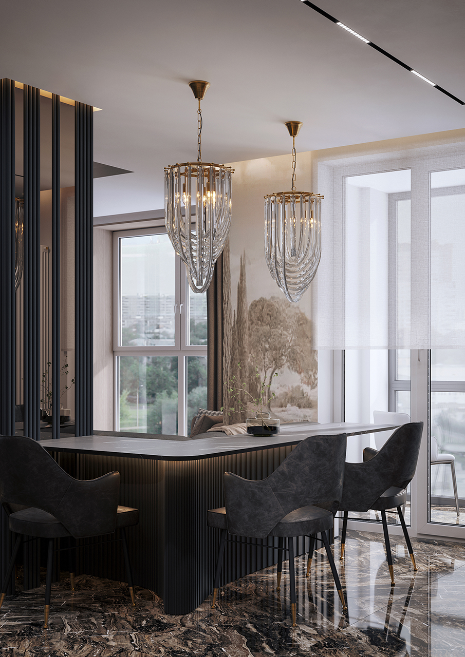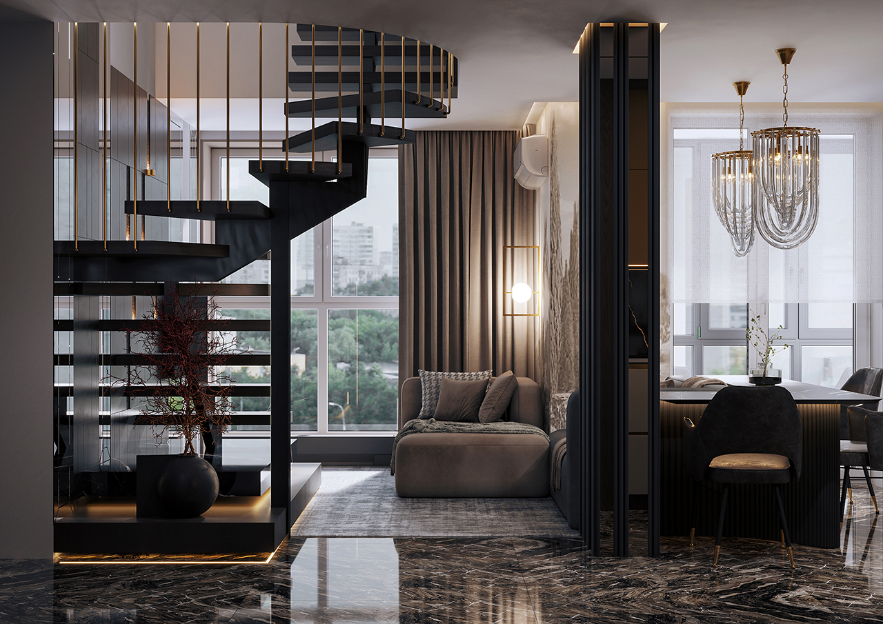 Желание клиента — роскошный утонченный интерьер, поэтому за основу концепции легла идея «шкатулки»: интерьер с обилием декора, темных элементов, золота и камня. Квартира для такой масштабной задумки довольно миниатюрная, но тем интереснее была работа над проектом.
