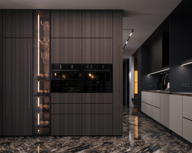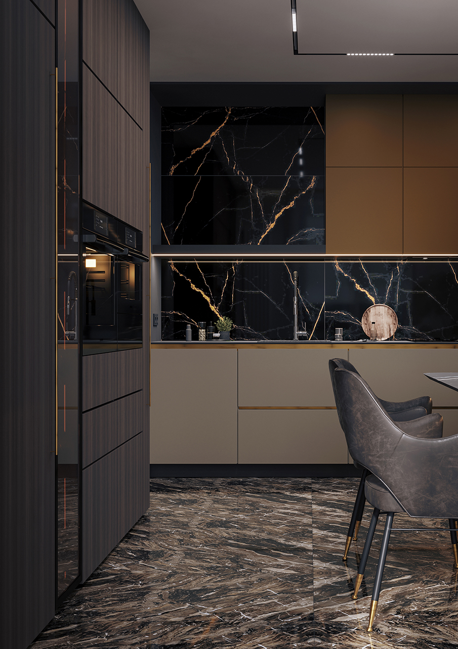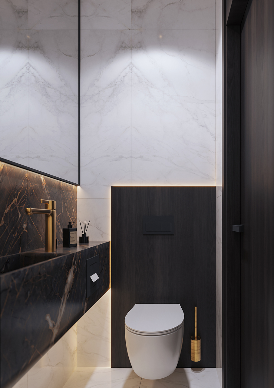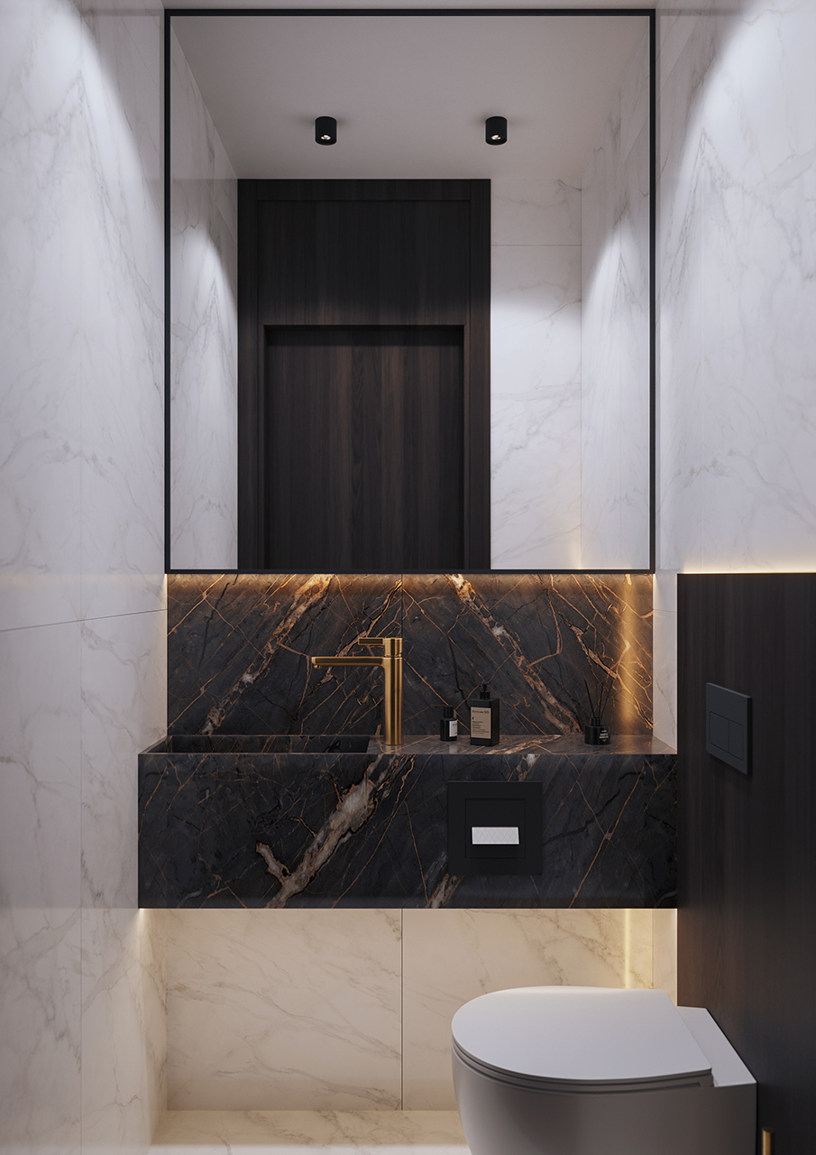 Желание клиента — роскошный утонченный интерьер, поэтому за основу концепции легла идея «шкатулки»: интерьер с обилием декора, темных элементов, золота и камня. Квартира для такой масштабной задумки довольно миниатюрная, но тем интереснее была работа над проектом.
