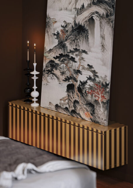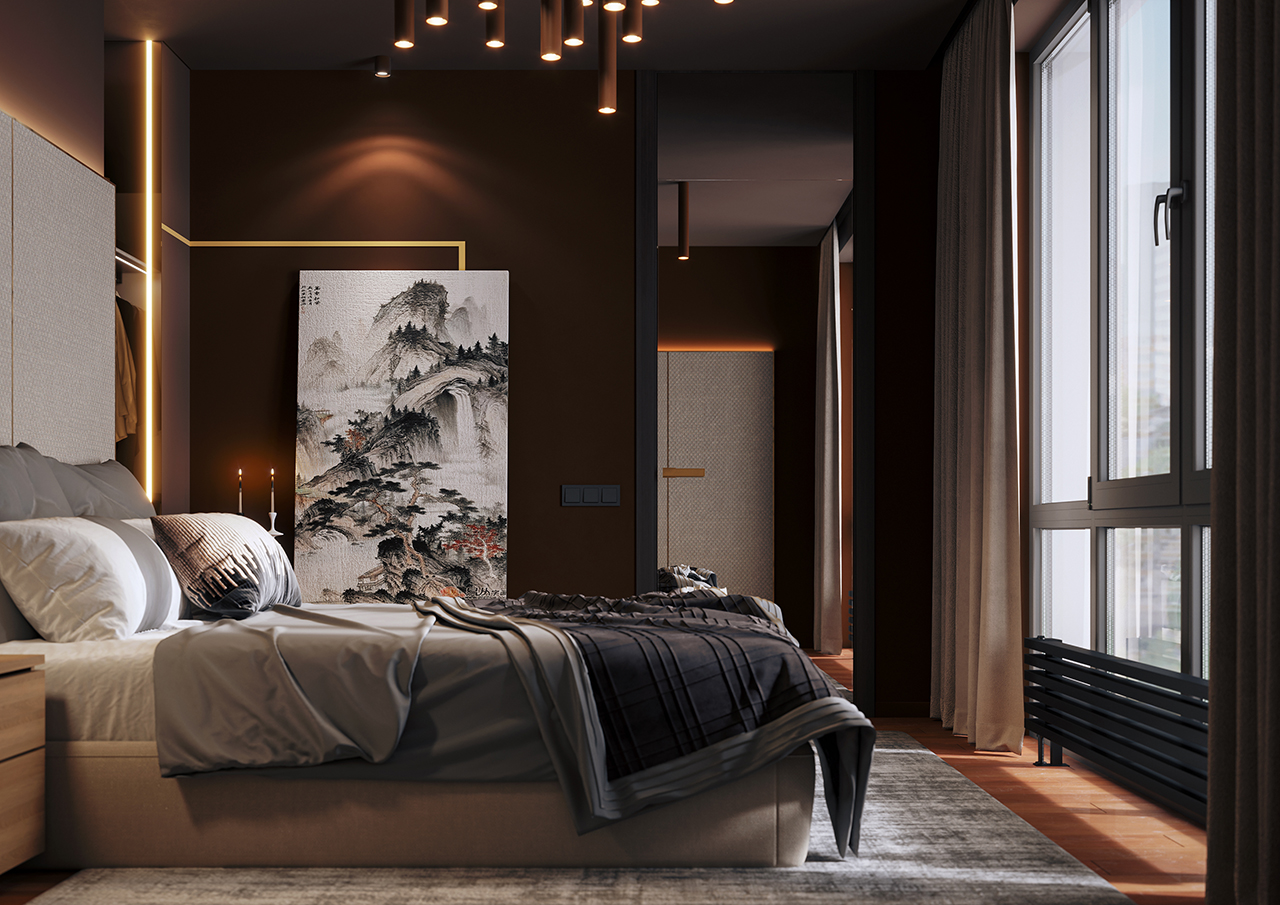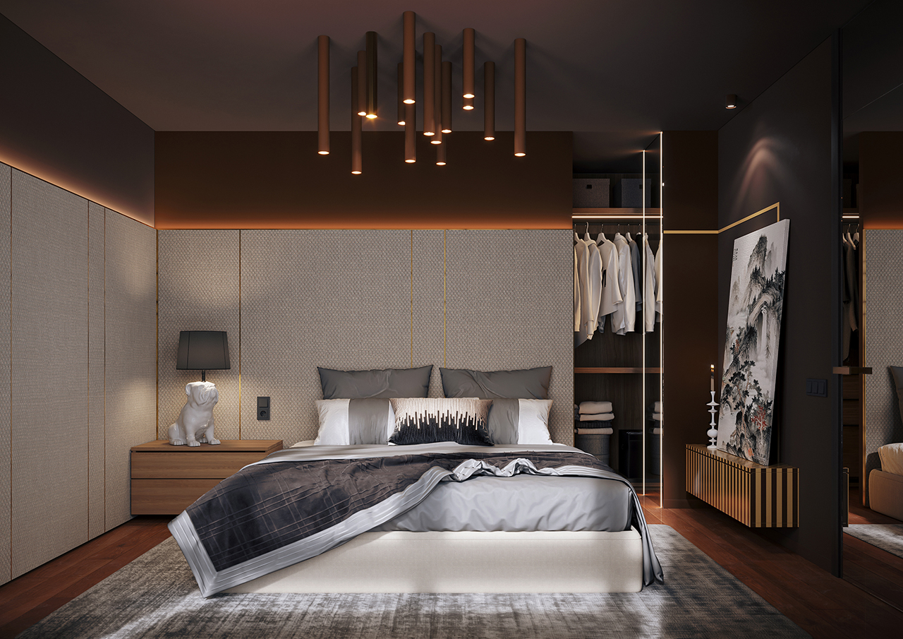 На втором этаже разместилась спальня хозяина с гардеробной зоной за изголовьем кровати. Потолок и стены мы выкрасили в один цвет. Мягкие текстильные панели создают атмосферу уюта и служат дополнительной звукоизоляцией. Тумба в полоску добавила нужный акцент и объединила все элементы спальни между собой.