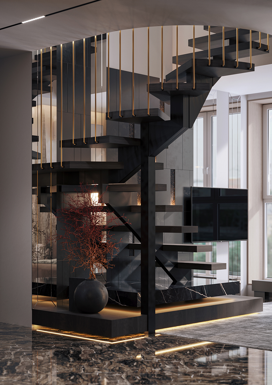 Самым, пожалуй, сложным узлом стала лестница. Застройщик оставил нам круглое отверстие в перекрытии, что ограничивало в разработке архитектуры этого элемента. Еще и заходить на лестницу мы можем только с одной стороны… Но мы справились: лестница стала акцентным элементом и изюминкой проекта. Тщательно рассчитали все высоты, поэтому ходить рядом будет комфортно. Первые ступени сделали в виде подиума, на котором можно разместить подушки или декор.