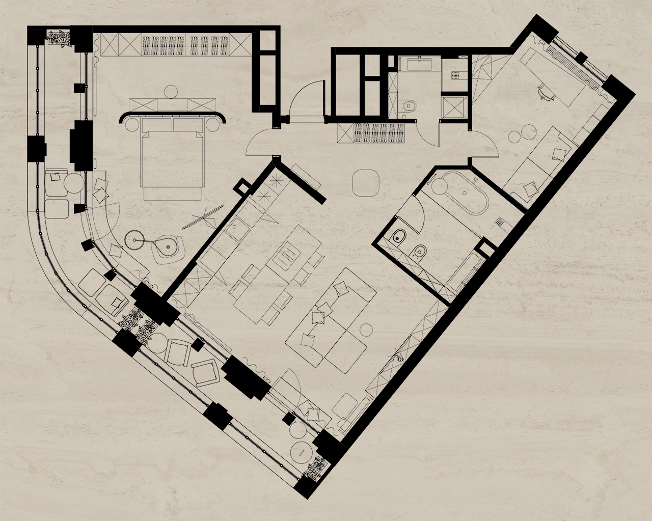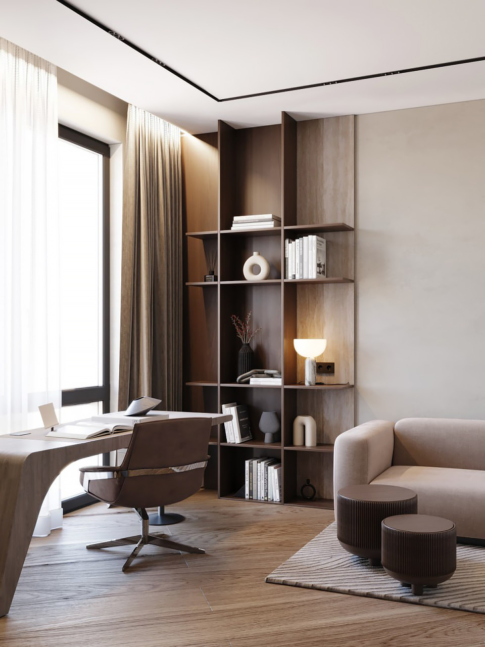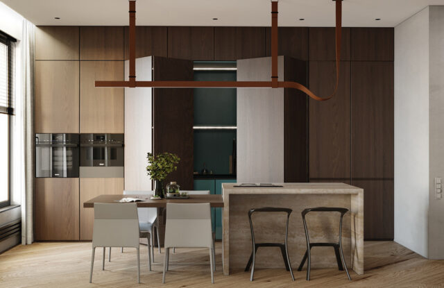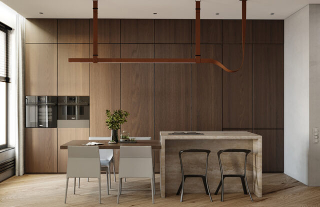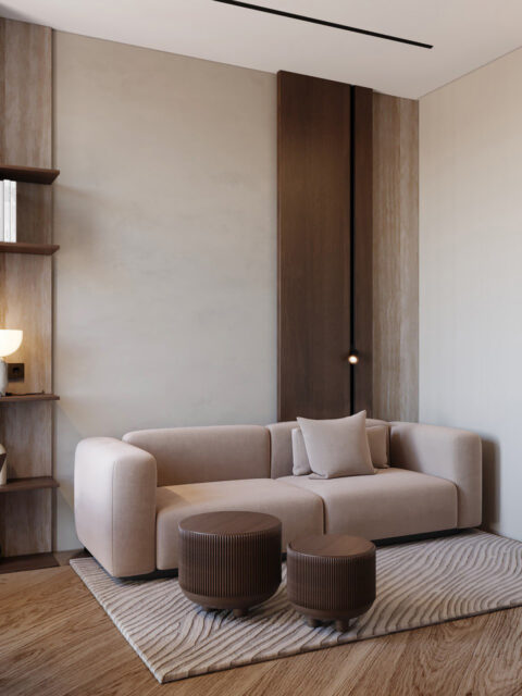 Интерьер был выполнен в коричнево-бежевых оттенках, с использованием травертина в отделке, выбор которого не случаен. Текстура этого материала напоминает разводы мокрого песка на берегу моря. Мы также использовали много дерева – это отсылка к корабельным палубам особенно заметна в кабинете. Незаменимым элементом в этой комнате стал криволинейный стол, который заставляет погрузиться в атмосферу моря своими изгибами, напоминающими плавание корабля по волнам.