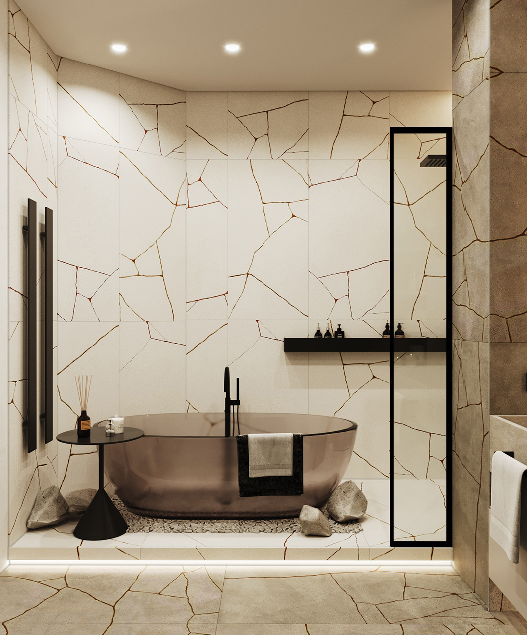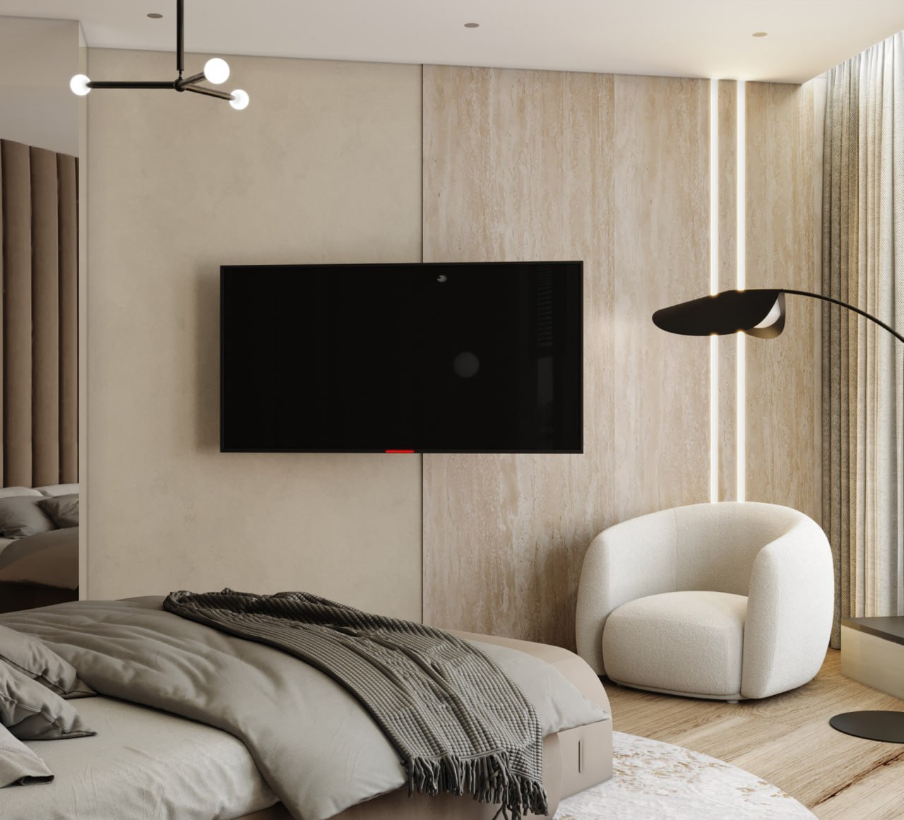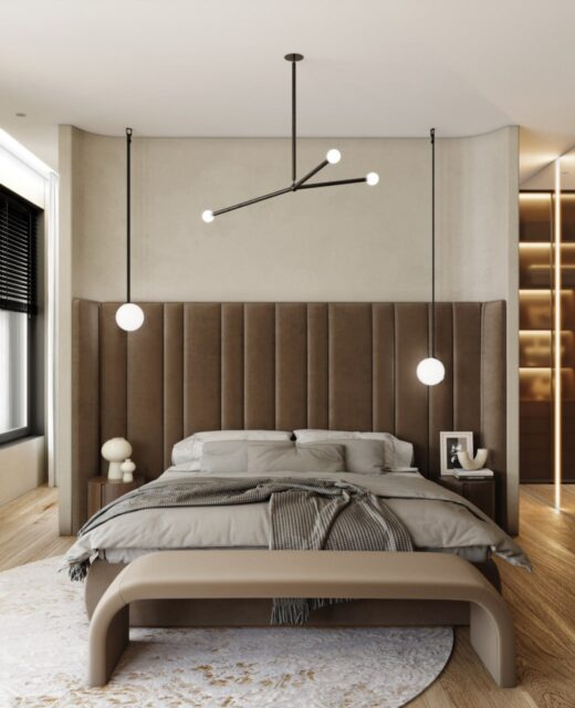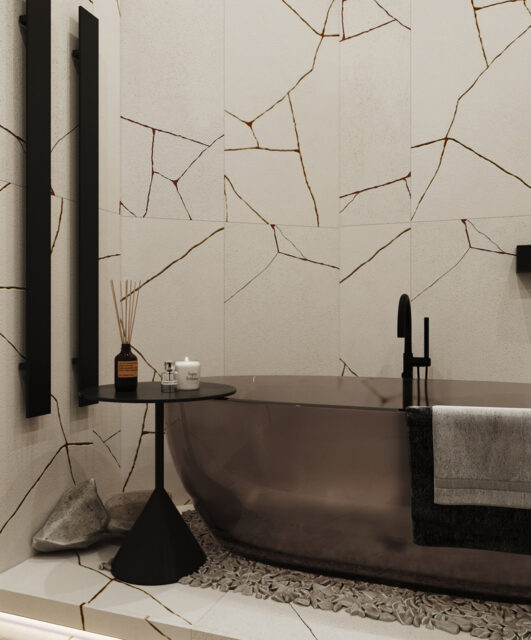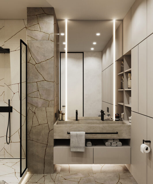 Интерьер был выполнен в коричнево-бежевых оттенках, с использованием травертина в отделке, выбор которого не случаен. Текстура этого материала напоминает разводы мокрого песка на берегу моря. Мы также использовали много дерева – это отсылка к корабельным палубам особенно заметна в кабинете. Незаменимым элементом в этой комнате стал криволинейный стол, который заставляет погрузиться в атмосферу моря своими изгибами, напоминающими плавание корабля по волнам.