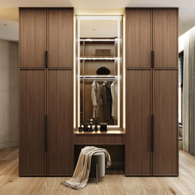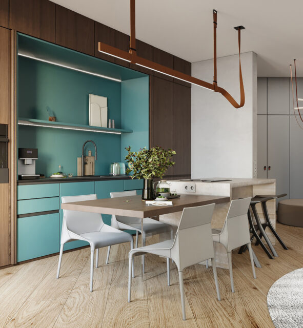 Что касается цветовой палитры, в основном мы выбрали спокойные оттенки, располагающие к отдыху и расслаблению. Однако, в общей зоне мы добавили яркий элемент – рабочую поверхность кухни в бирюзовом цвете. Эту часть мы сделали скрытой, с помощью раздвижных дверей можно создавать разные сценарии: от яркого акцента до спокойной атмосферы в окружении натуральных материалов.