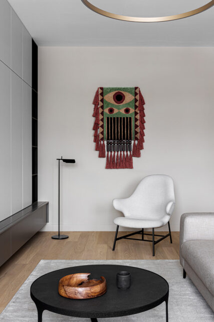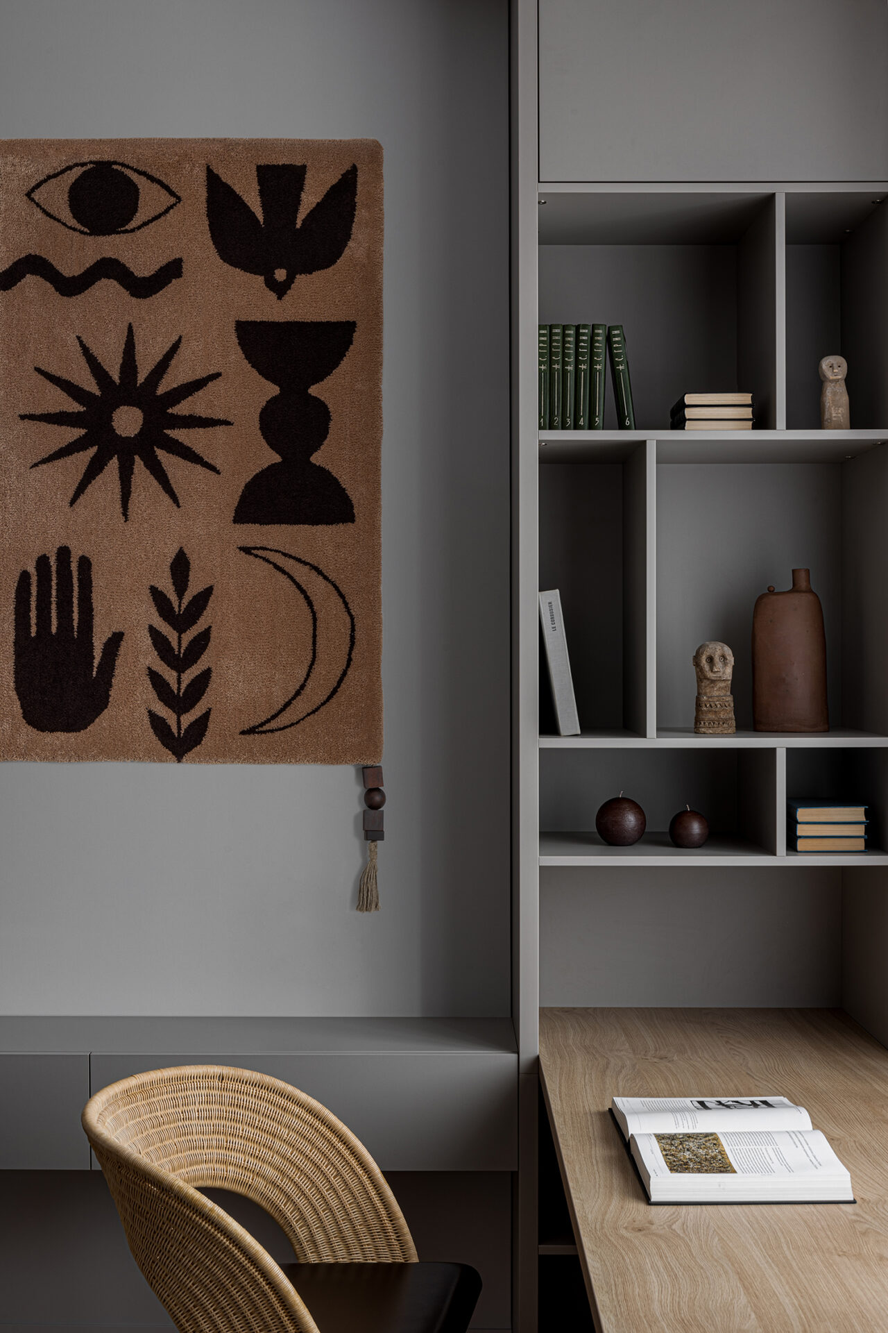 В качестве акцентного искусства в проект подобрали настенные панно в этническом стиле из натуральной шерсти авторства Сергея Ашухи, которые задали своё неповторимое настроение и добавили в историю элемент интриги.