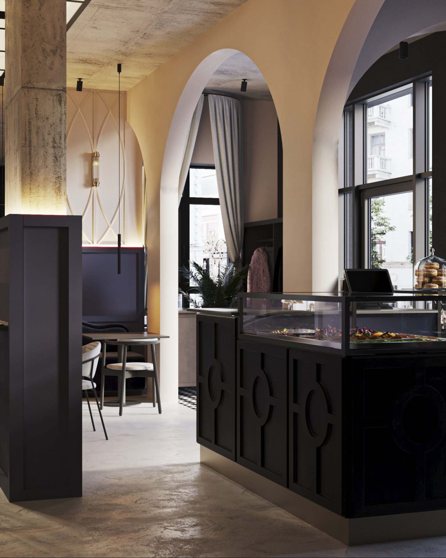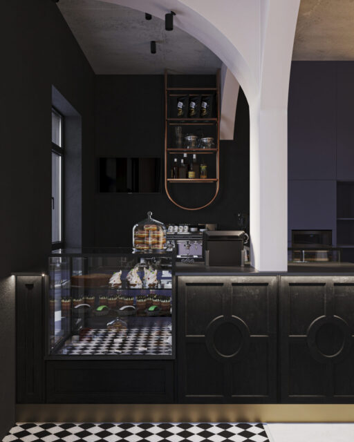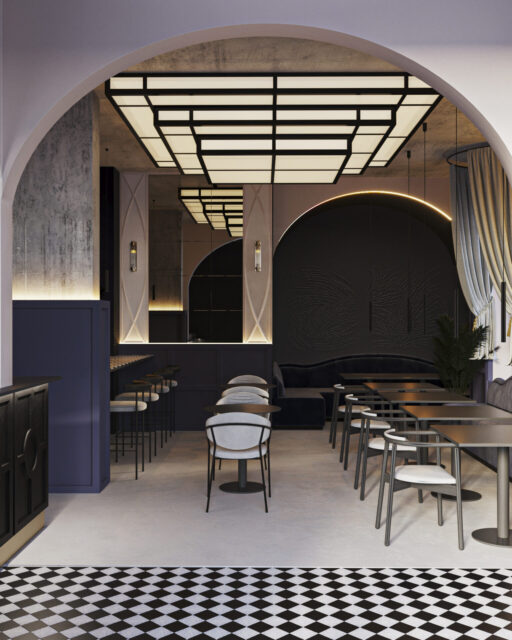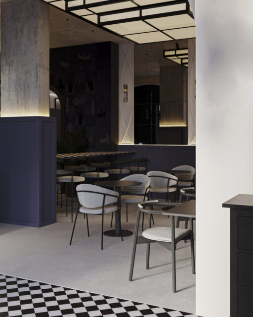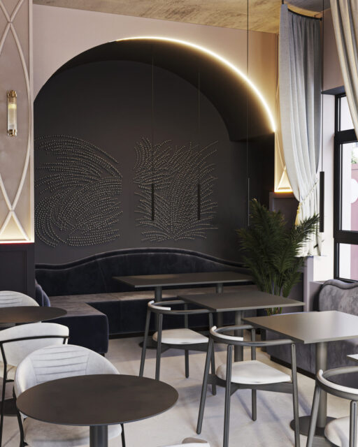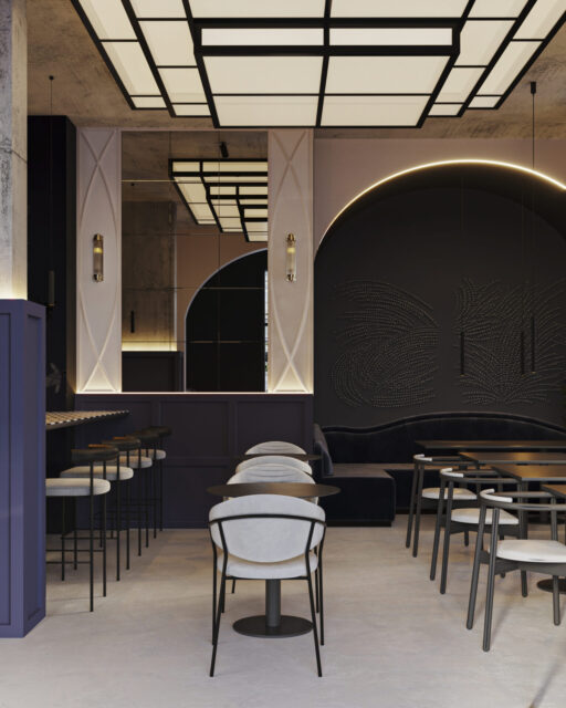 Для этого входную группу и кофе бар, мы отдели арочными сводами. Одну из зон посадки тоже поддержали аркой. Мы решили использовать прием color bloсking –сочетание всего двух цветов. Весь зал оформили на контрасте стен из темного обволакивающего глубокого темно синего цвета и мягкого сливочного цвета.
