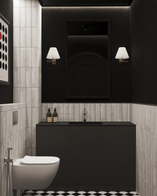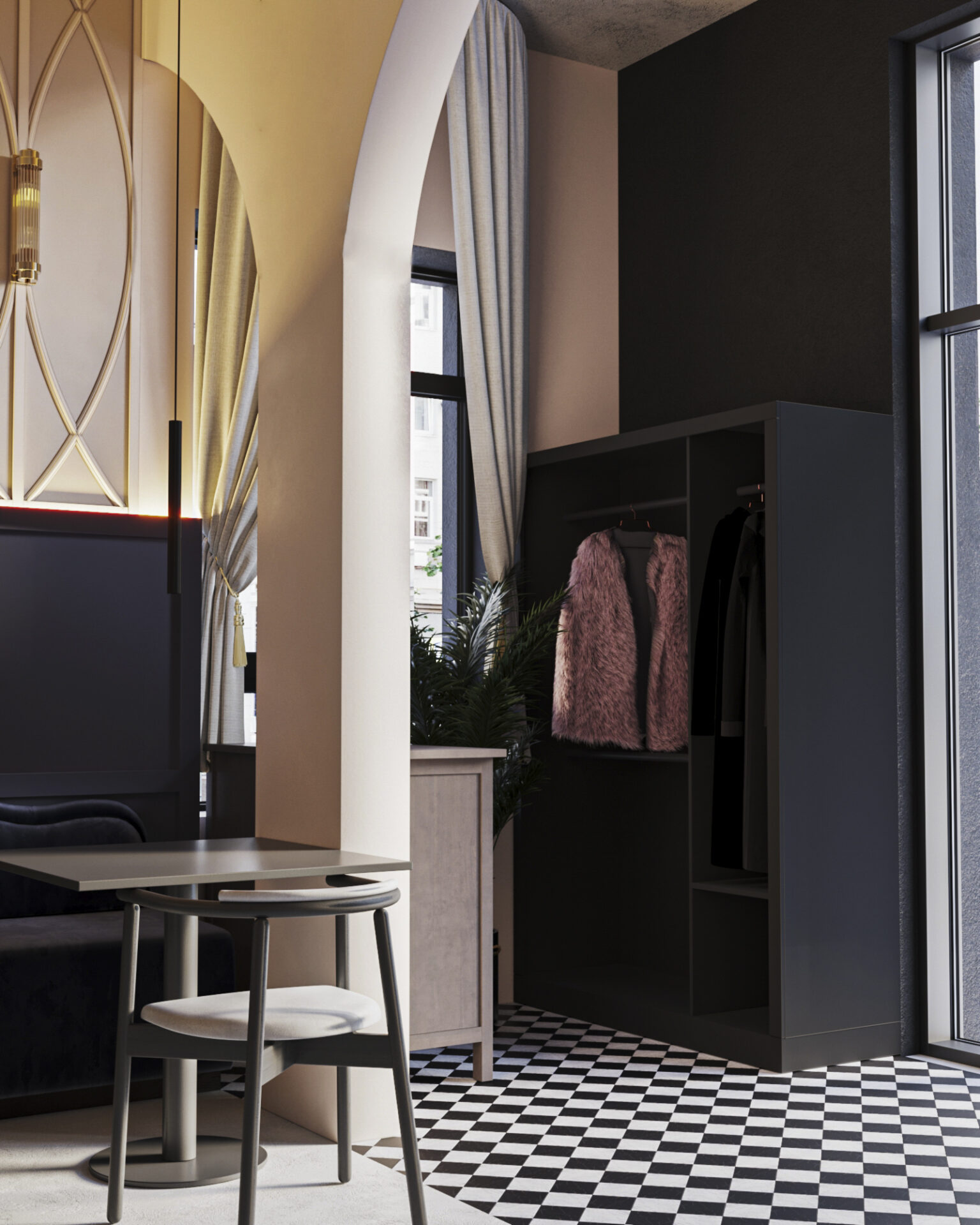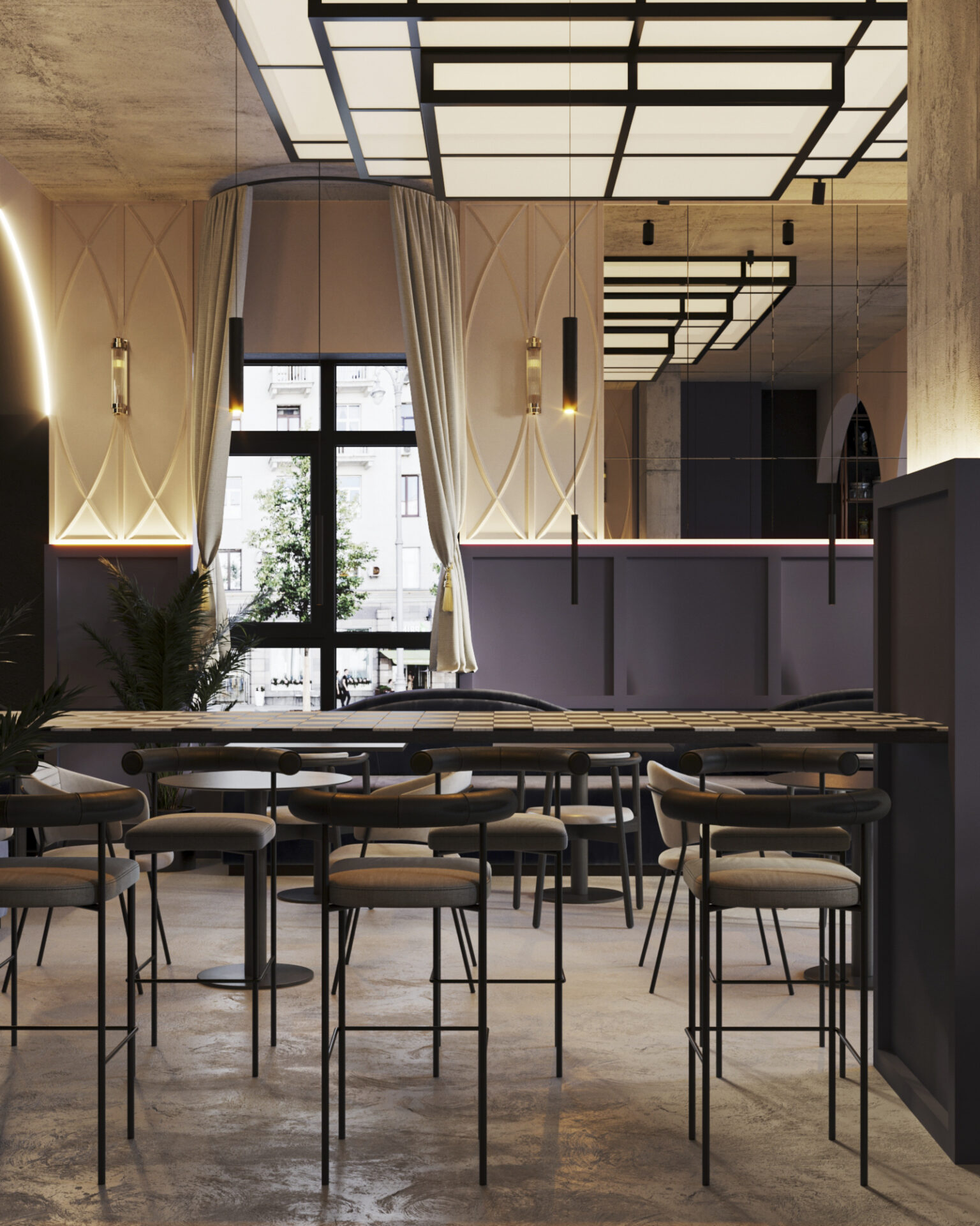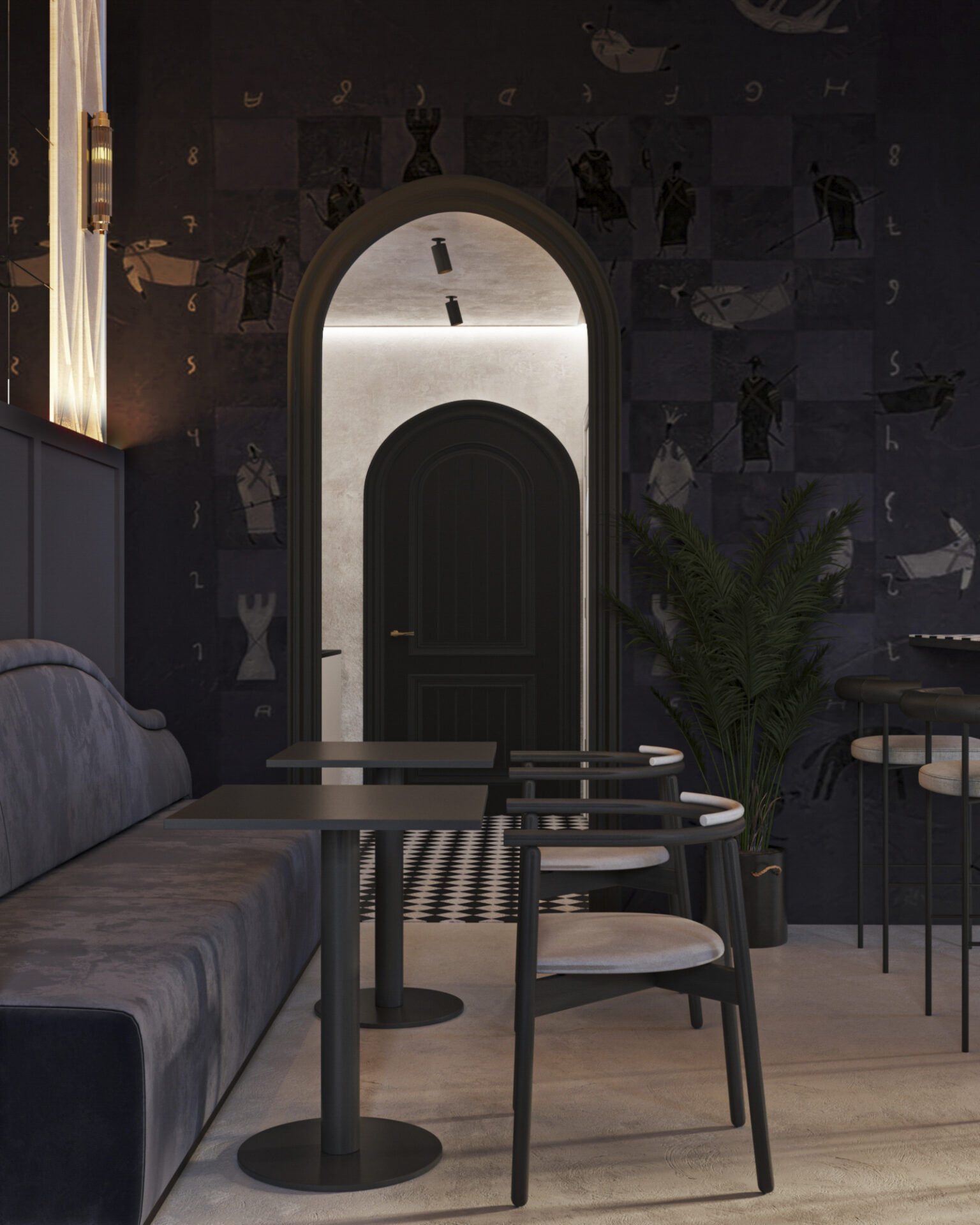 Для этого входную группу и кофе бар, мы отдели арочными сводами. Одну из зон посадки тоже поддержали аркой. Мы решили использовать прием color bloсking –сочетание всего двух цветов. Весь зал оформили на контрасте стен из темного обволакивающего глубокого темно синего цвета и мягкого сливочного цвета.