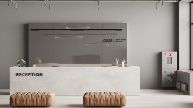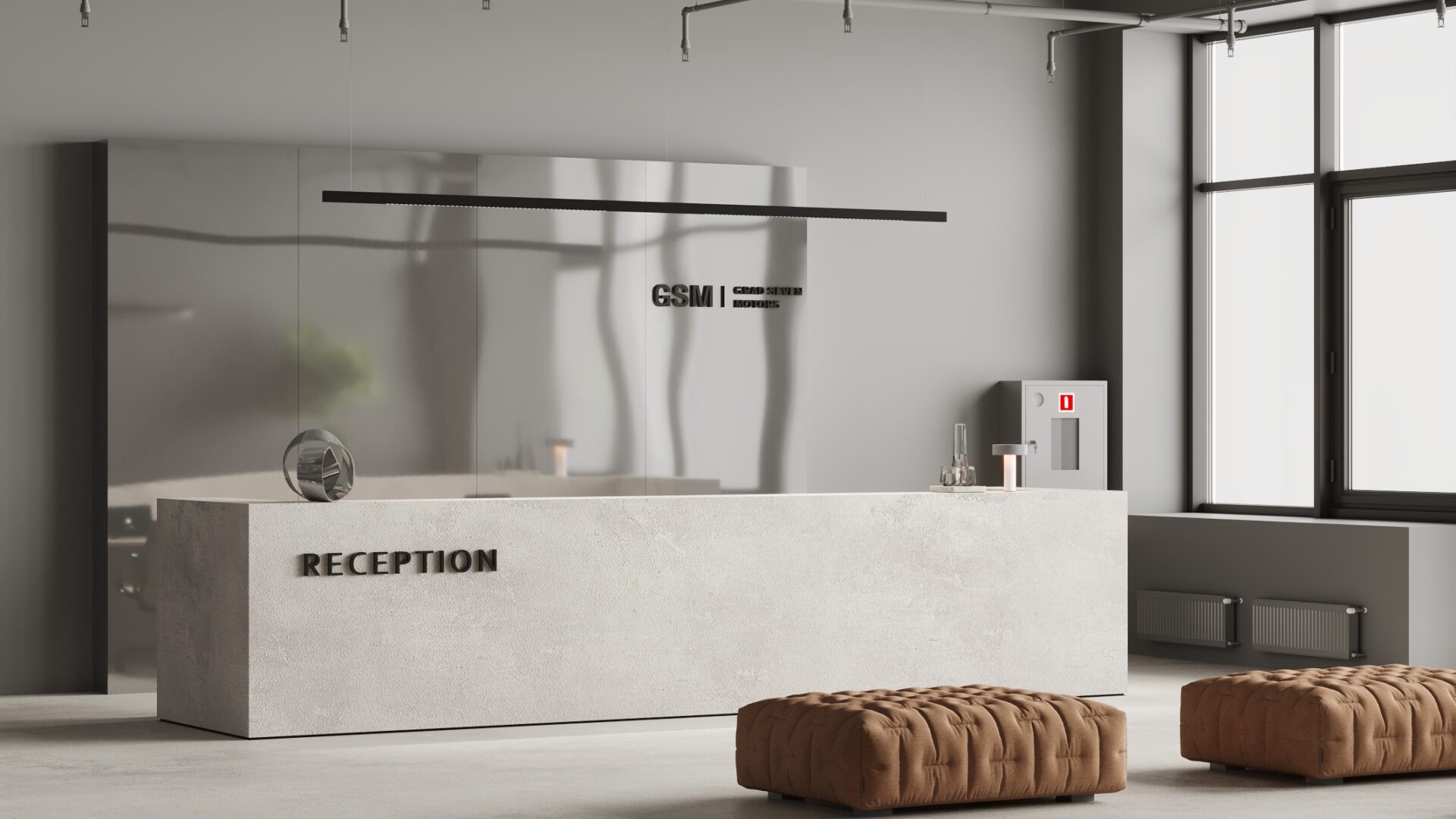 Зона рецепции и ожидания для клиентов является лакомым кусочком этого интерьера. Сочетание бетонной стойки на фоне алюминиевых панелей отражает характер владельцев компании, а также создаёт ощущение стабильности и устойчивости на фоне внешней волатильности. Цветовым акцентом служит мягкая мебель в зоне ожидания, которая мягко вписалась в интерьер.