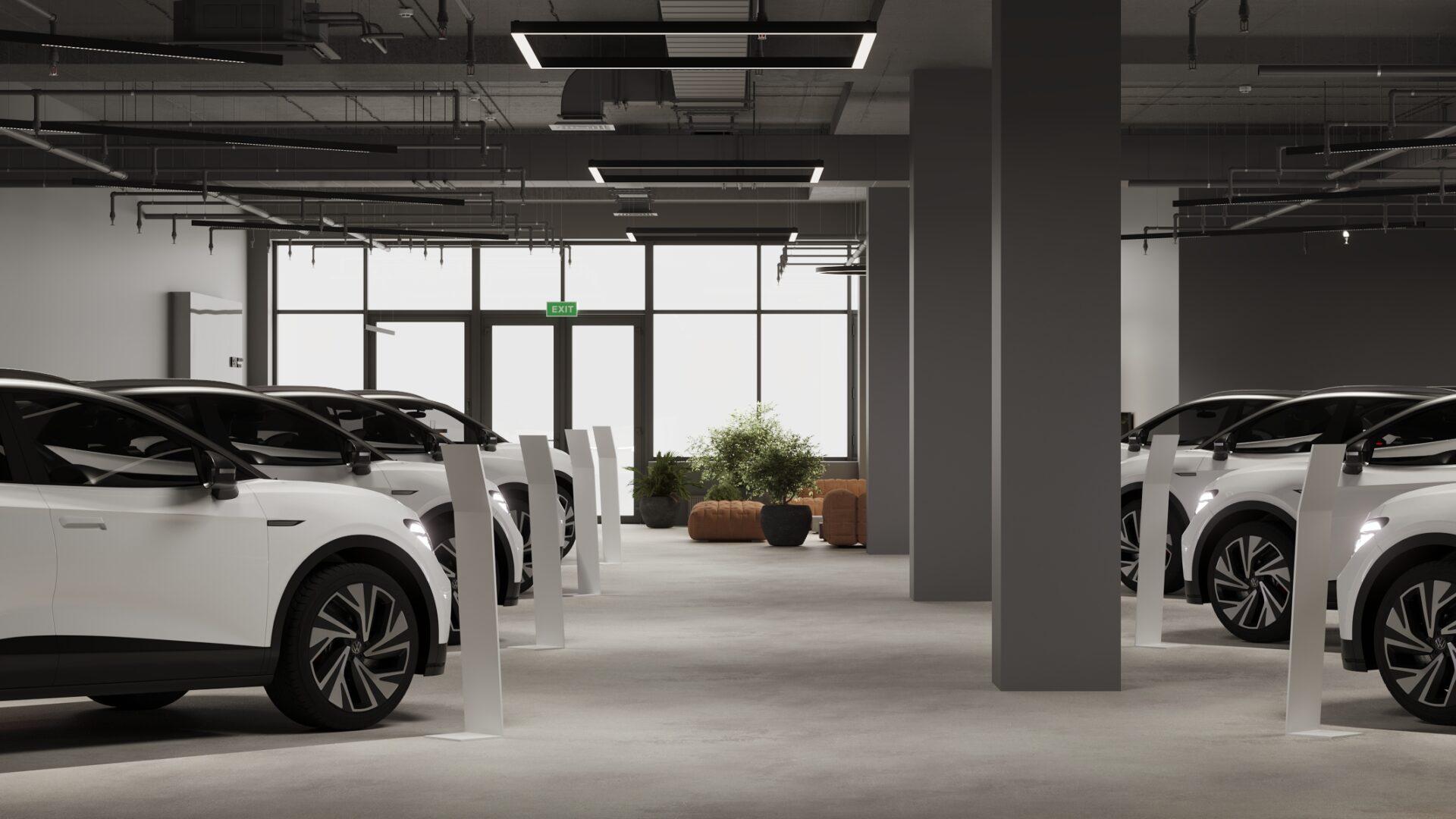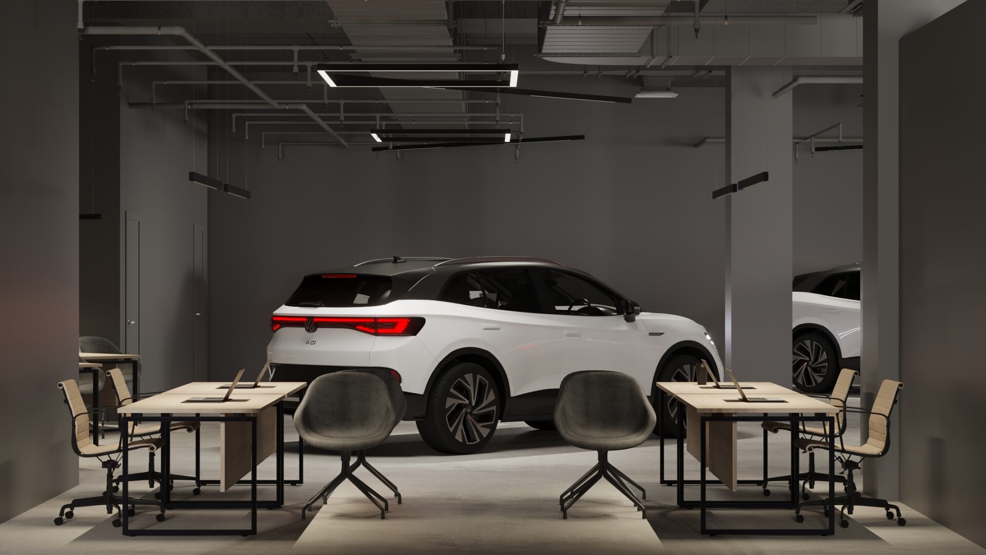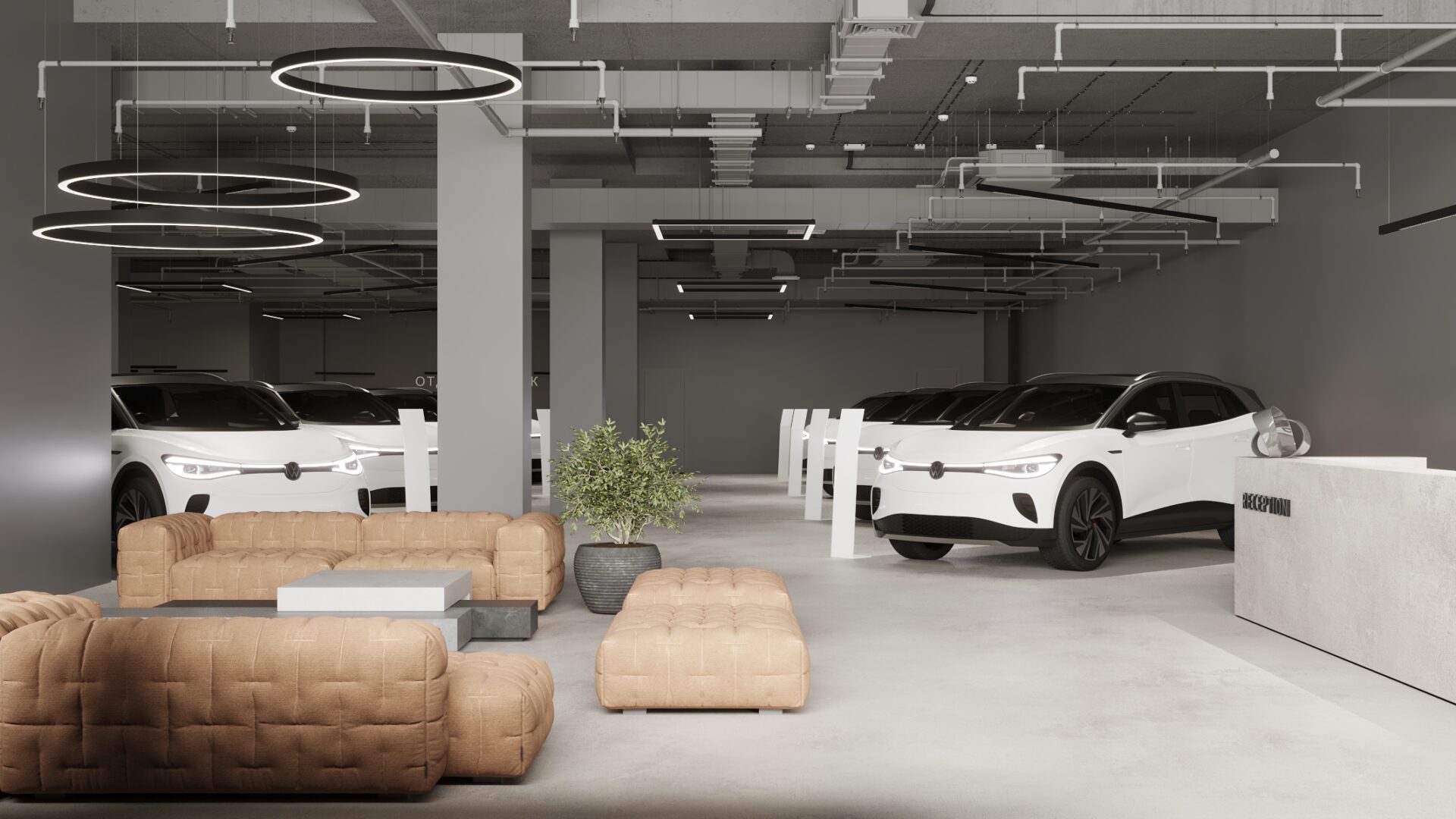 Задачей являлось создать пространство, соответствующее энергичности и современности владельцев компании в сочетании с инновационностью и динамикой электромобилей. Темно-серый оттенок в отделке создаёт премиальную атмосферу, а в сочетании с правильной системой освещения, ещё и подчеркивает детали автомобилей и выделяет их в любое время суток. Отличным решением было оголить инженерные системы под потолком и выкрасить их в цвет стен, создавая целостность пространства.