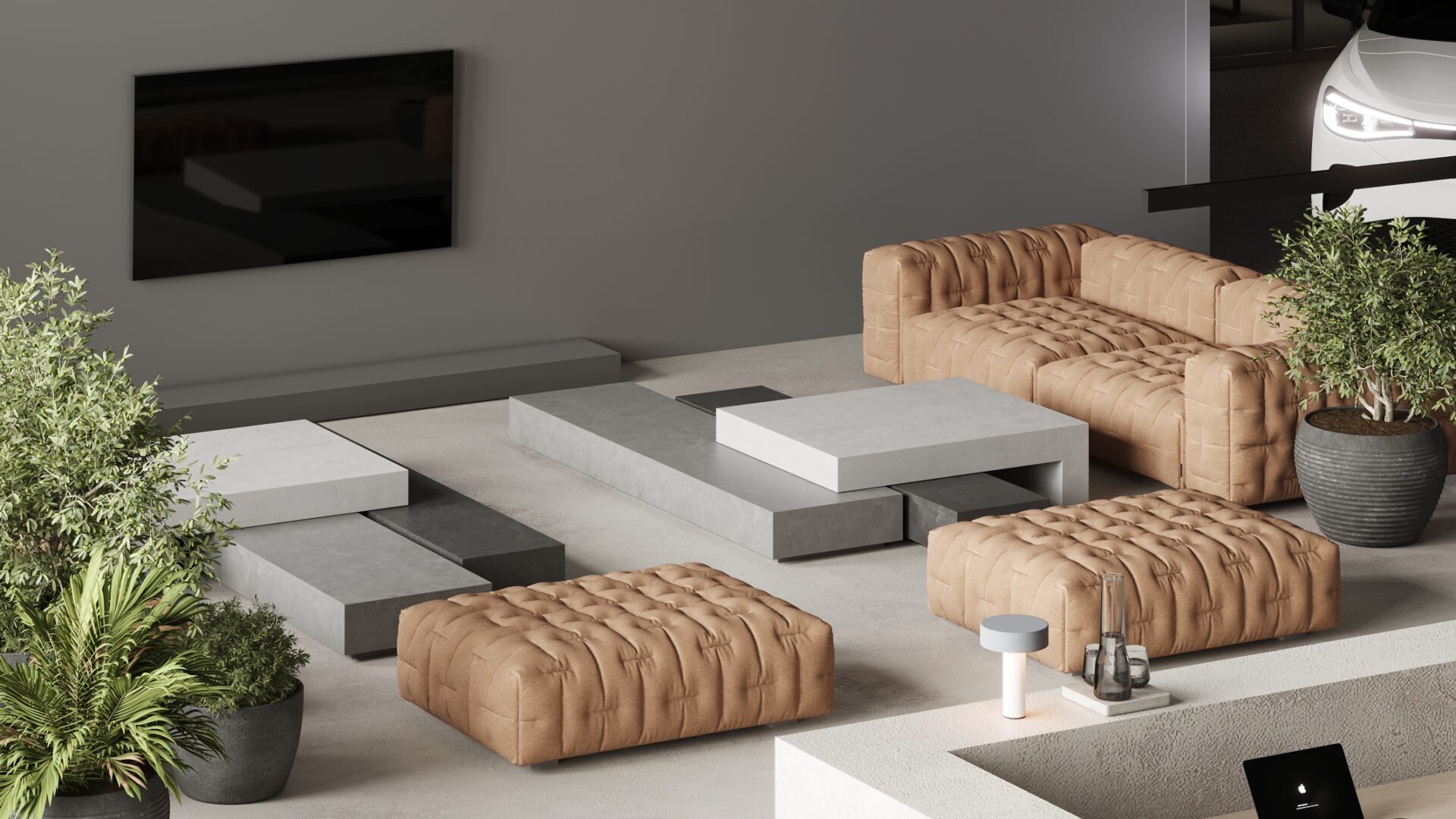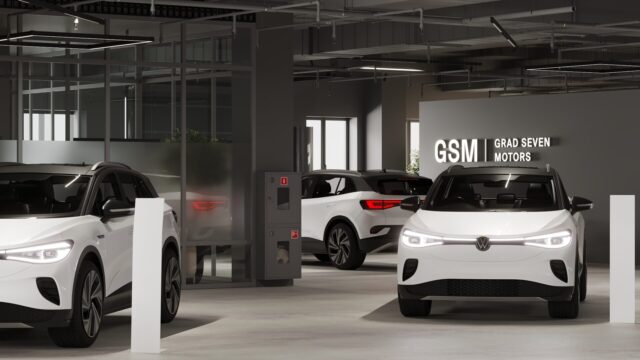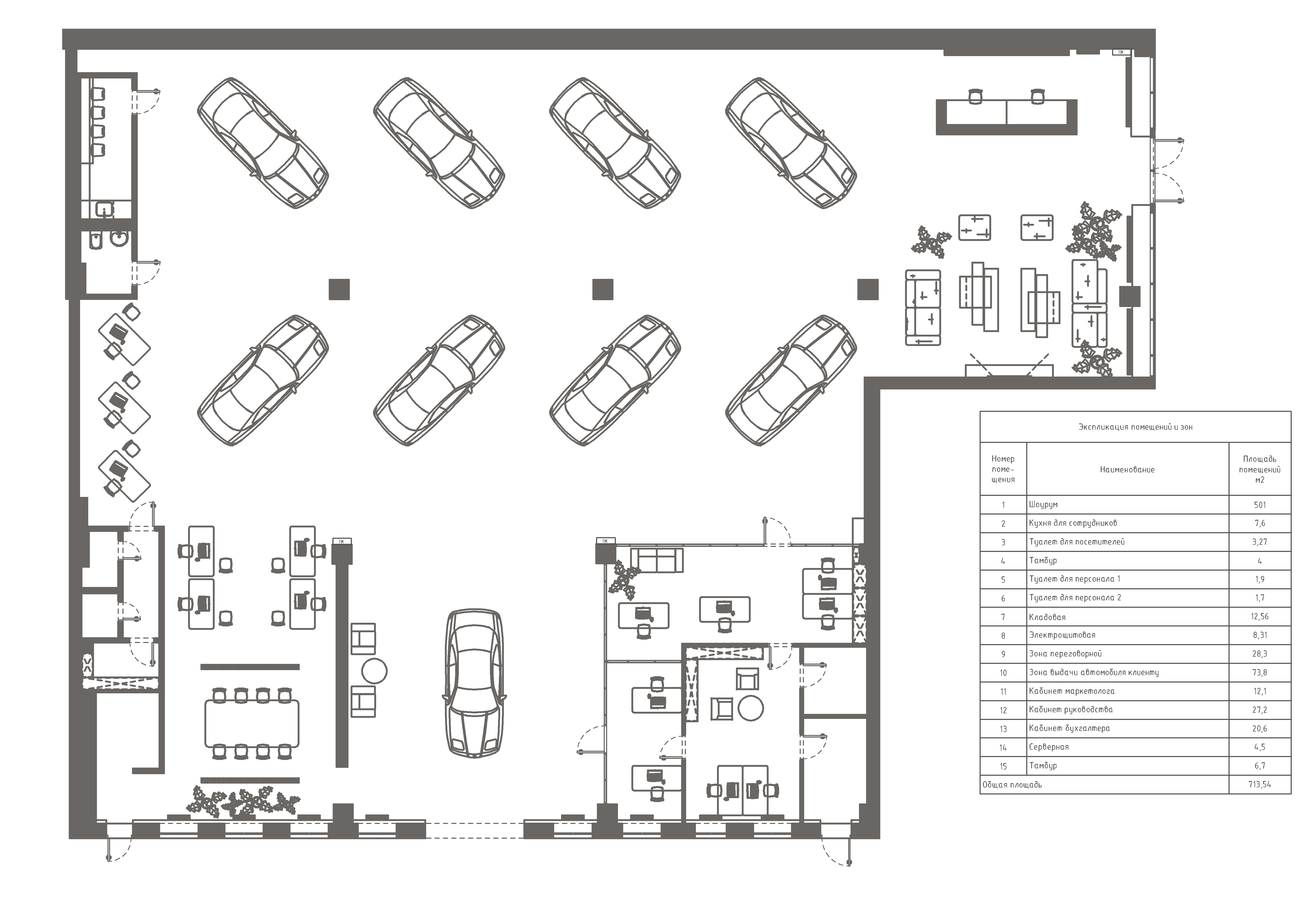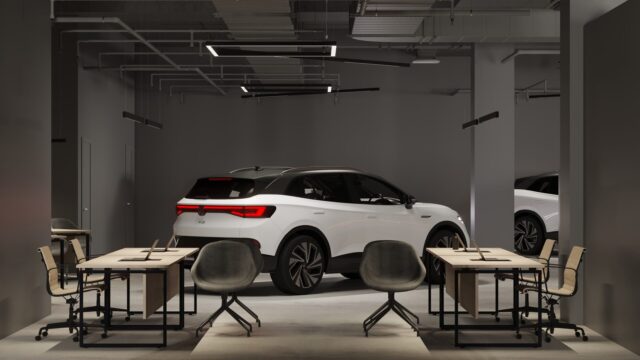 Задачей являлось создать пространство, соответствующее энергичности и современности владельцев компании в сочетании с инновационностью и динамикой электромобилей. Темно-серый оттенок в отделке создаёт премиальную атмосферу, а в сочетании с правильной системой освещения, ещё и подчеркивает детали автомобилей и выделяет их в любое время суток. Отличным решением было оголить инженерные системы под потолком и выкрасить их в цвет стен, создавая целостность пространства.