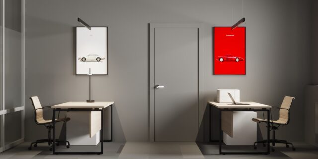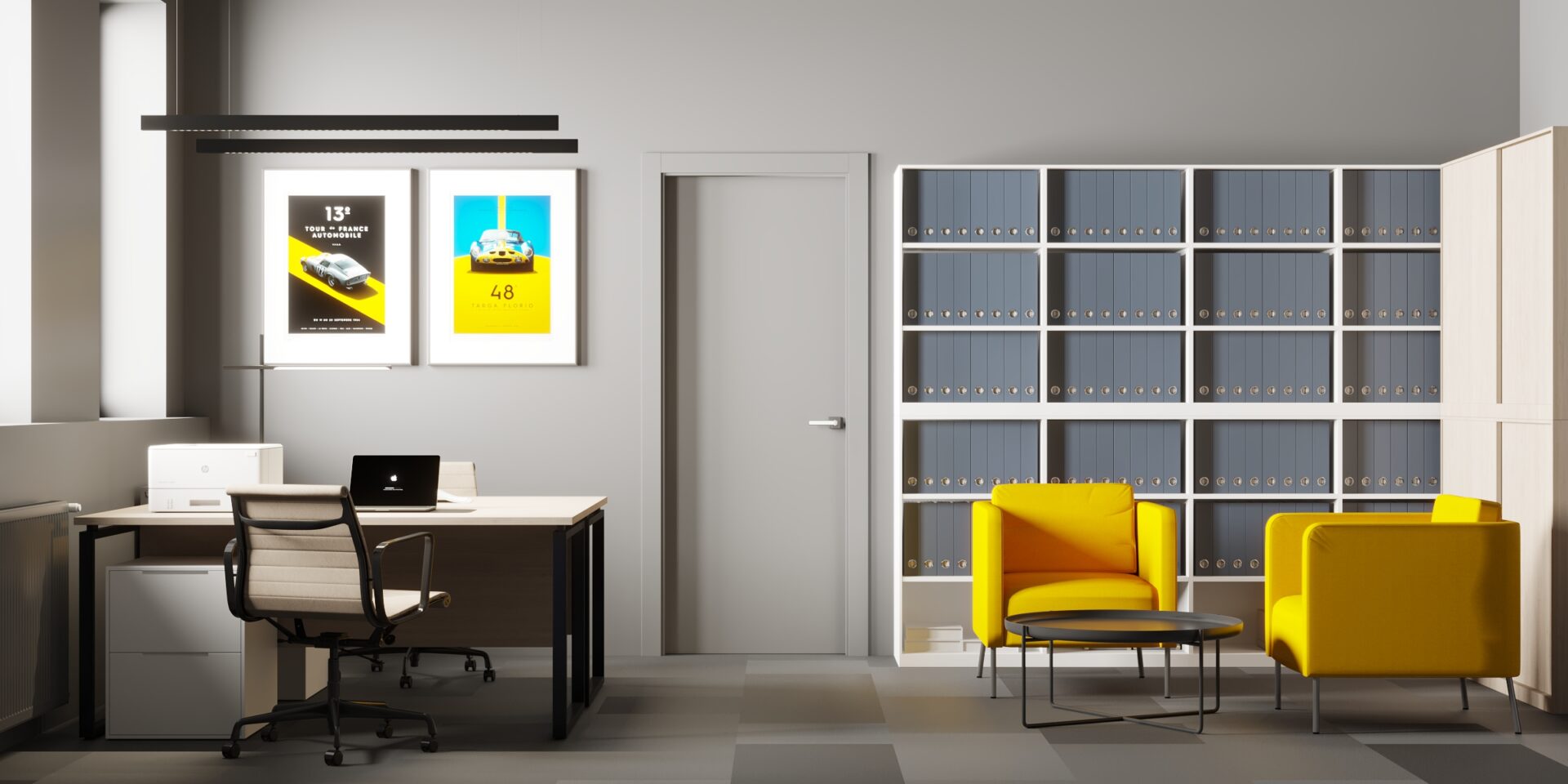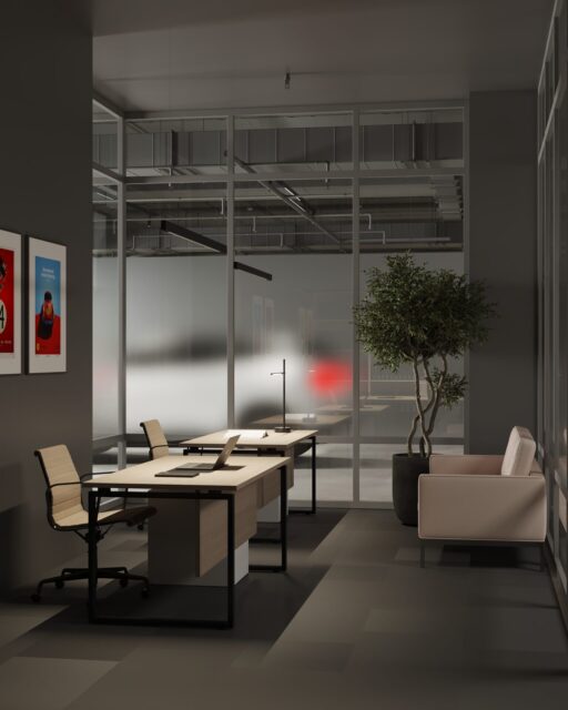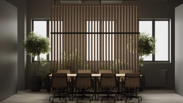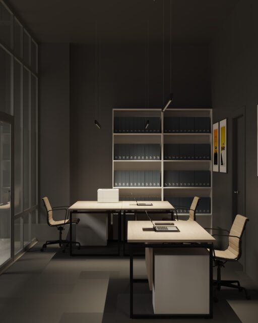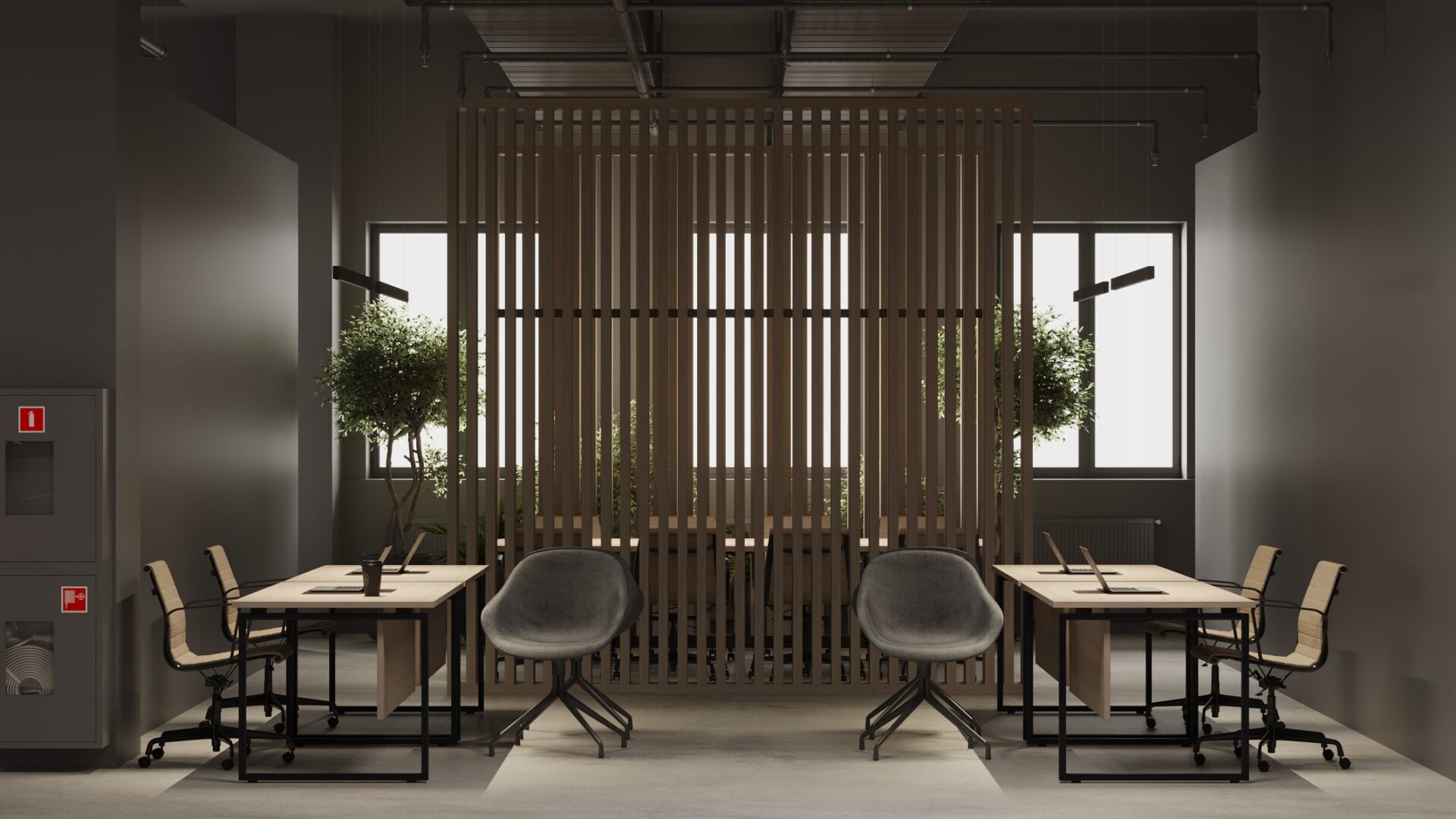 Зона работы менеджеров автосалона с клиентами наполнена деревянными спокойными текстурами для смягчения и успокоения, аккуратно вписываясь в строгие, тёмные оттенки интерьера. Профессиональная работа со светом создаёт дополнительный уют в этих зонах.