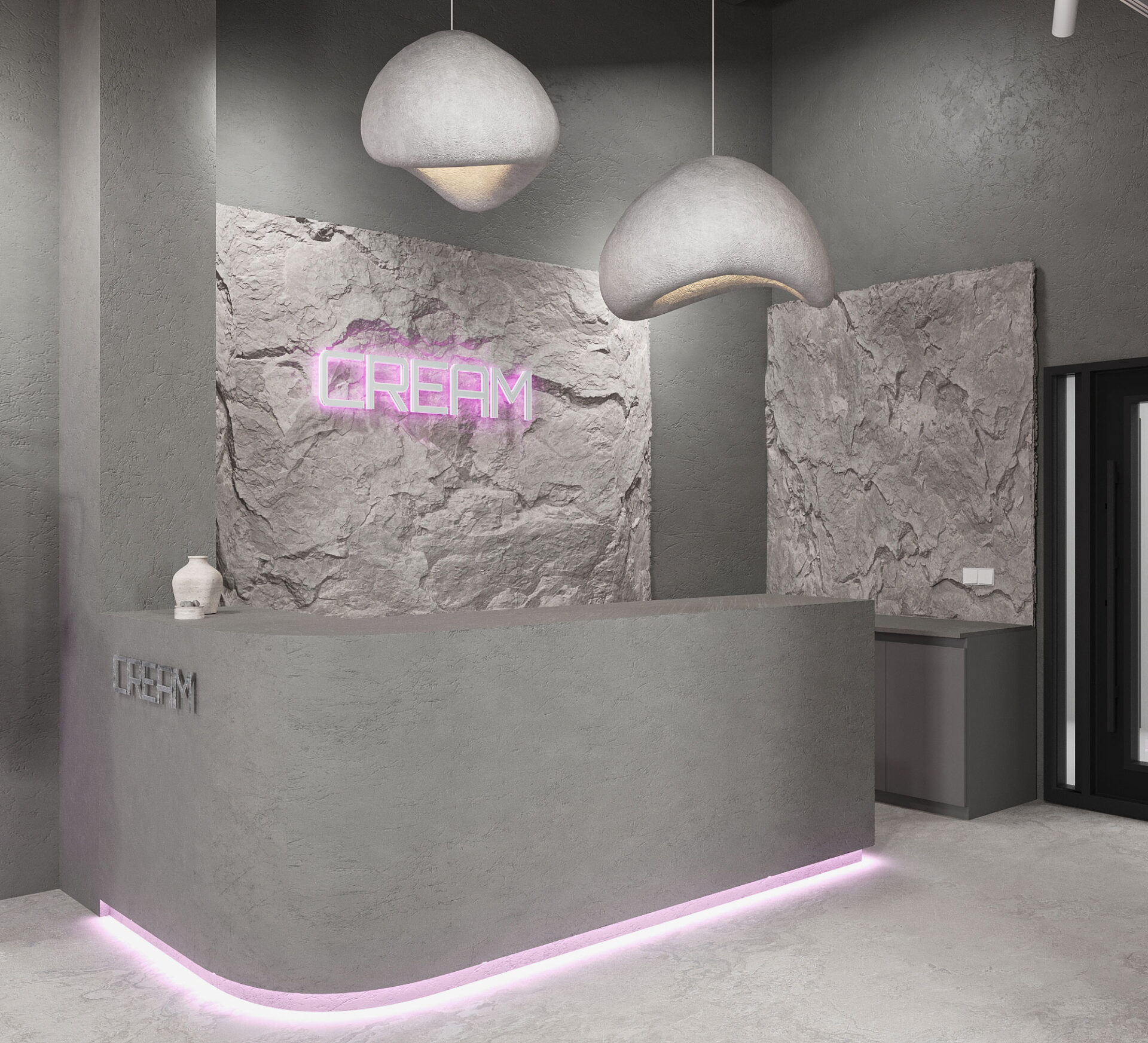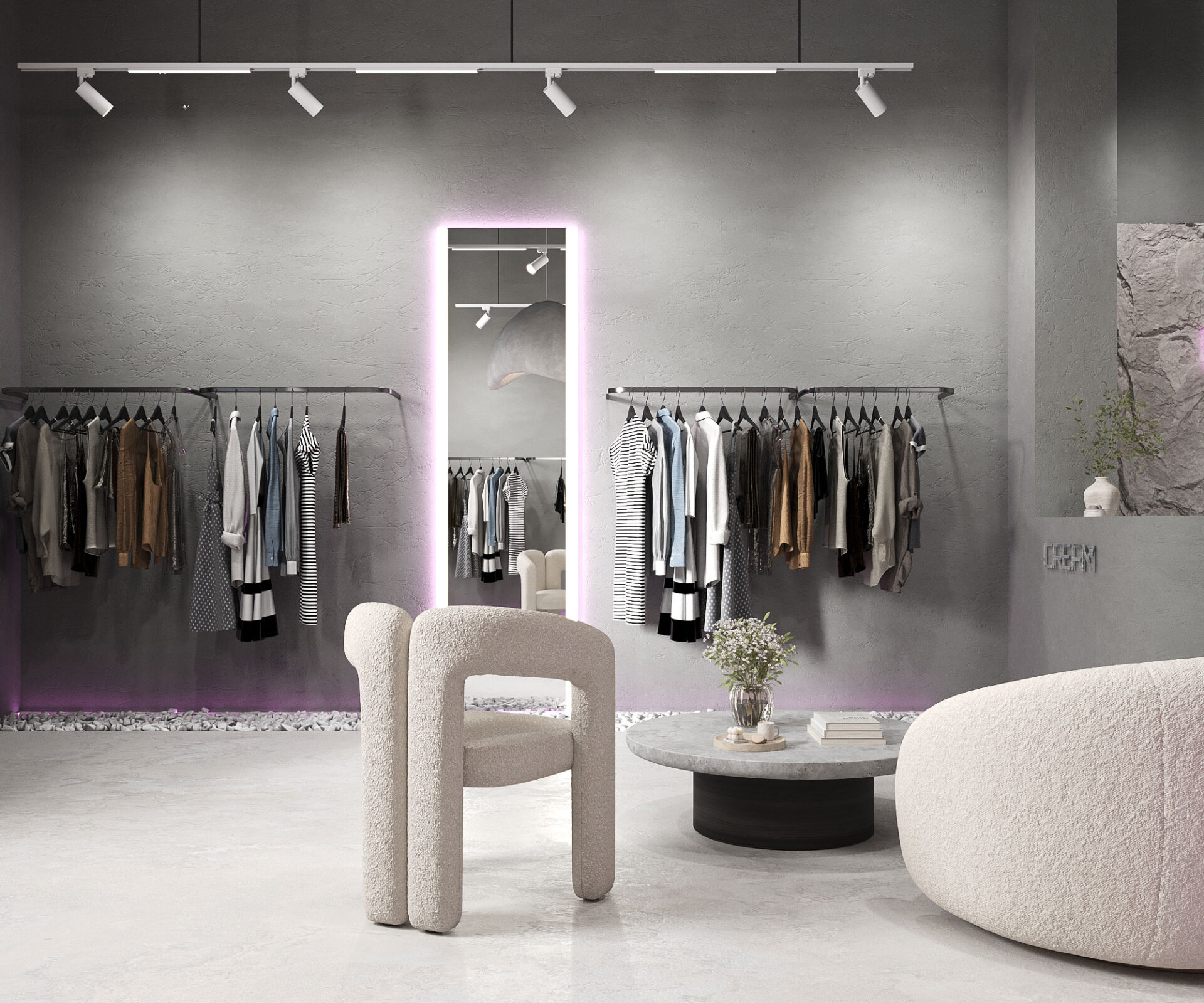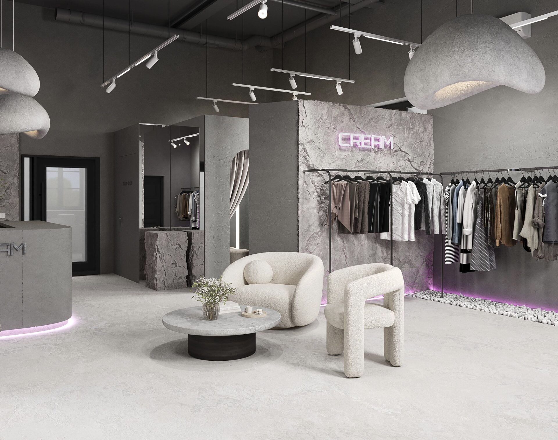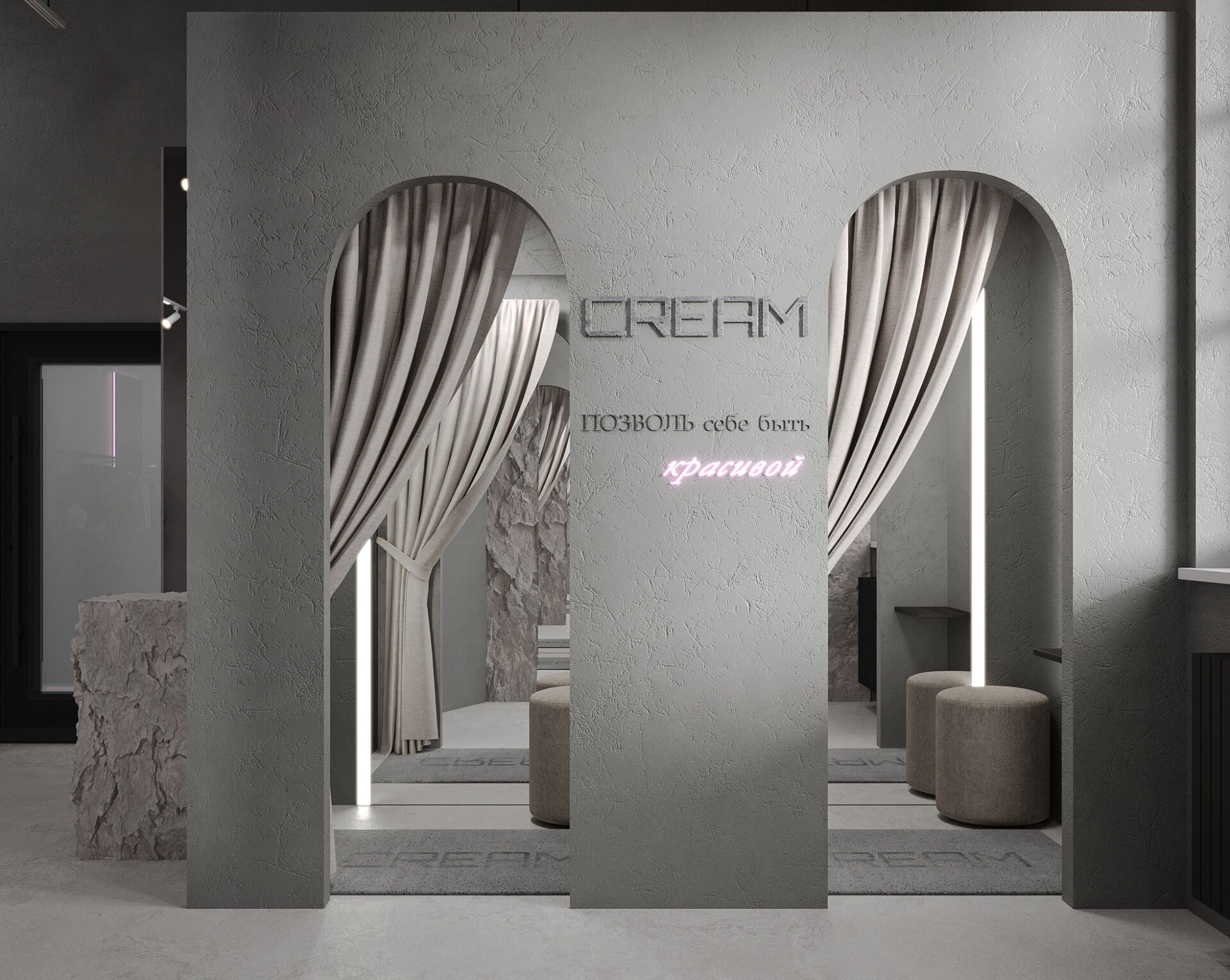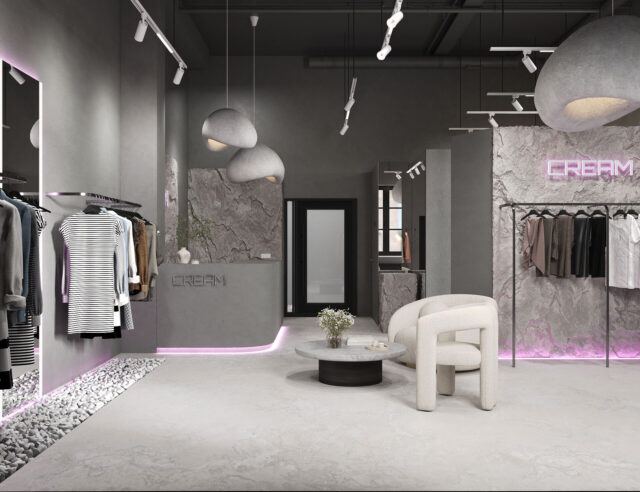 Добро пожаловать в шоурум “CREAM”. Это место, где грубость сочетается с изяществом, а серые тона создают атмосферу утонченного шарма.