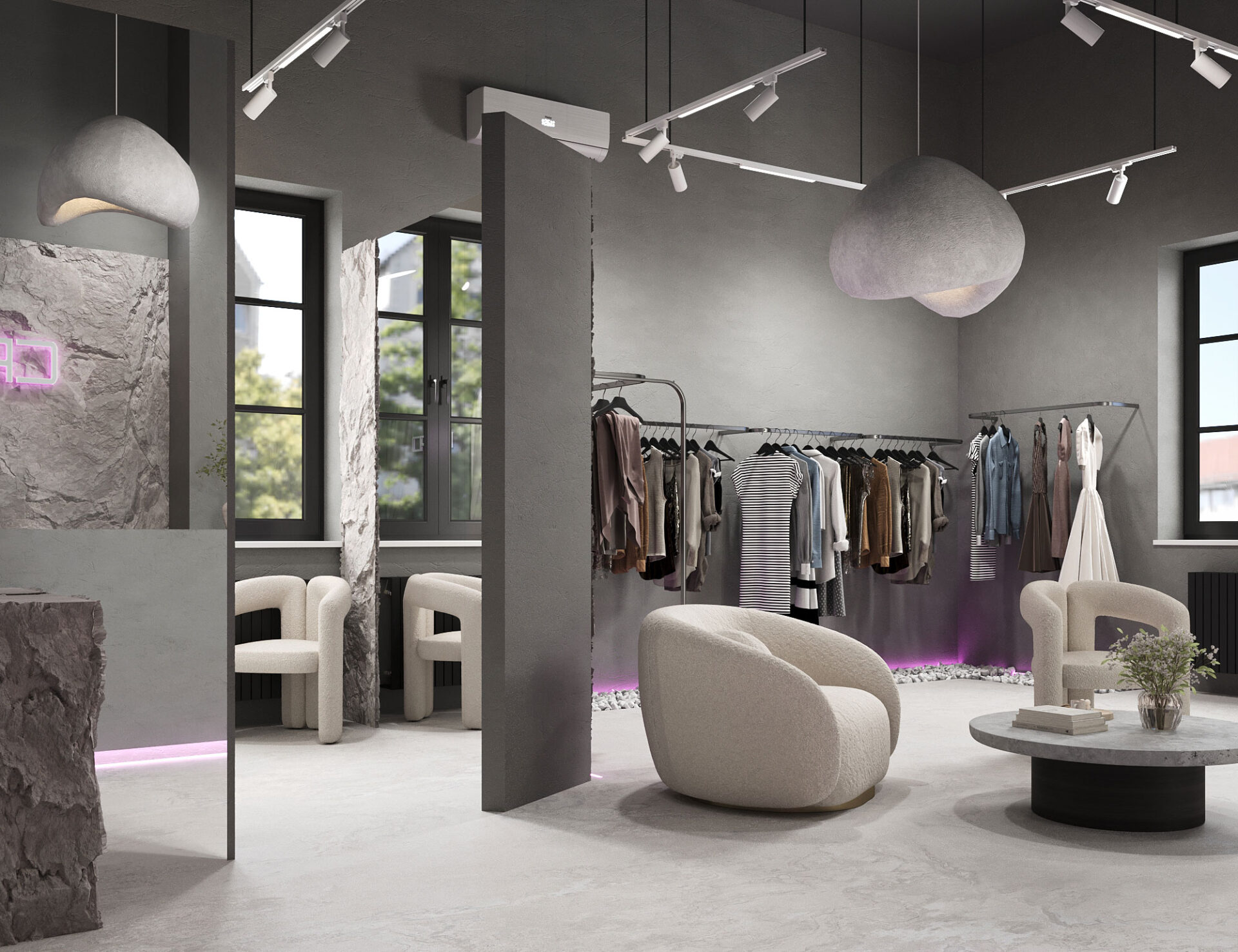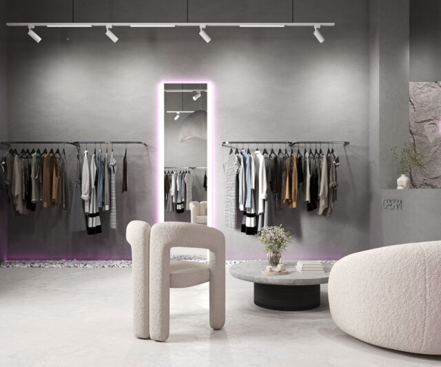 Стены, увенчанные брутальными скалами, придают пространству силу и энергию, в то время как элегантные арки в примерочных и розовая подсветка на сером фоне добавляют нотку «игривости».