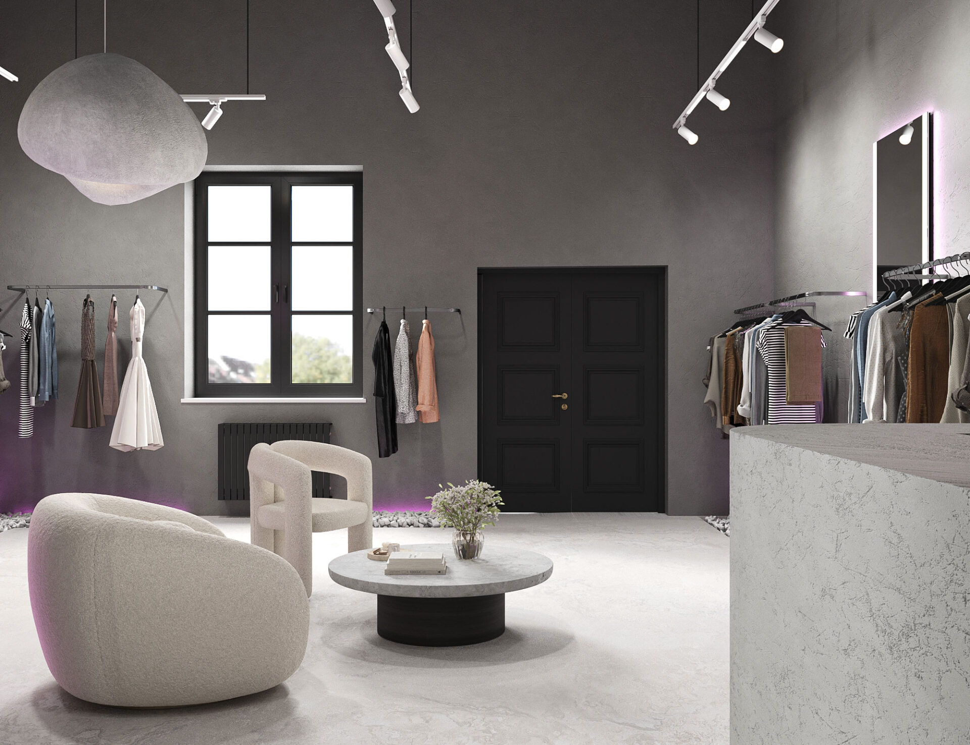 P.S. Это мой первый опыт работы с общественным пространством, где я старалась учесть пожелания подруги, как хозяйки шоурума и сделать пространство интересным, комфортным для посетителей и выгодно подчеркивающим женскую одежду как товар в магазине. И вот уже очень скоро в центре Гродно можно будет увидеть его интерьер, чему я безумно рада!