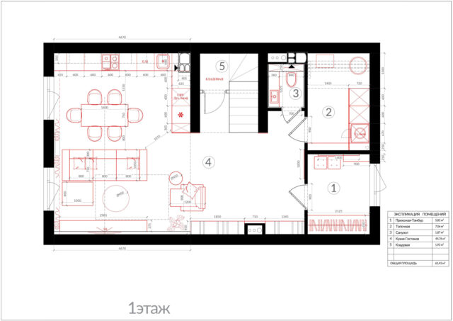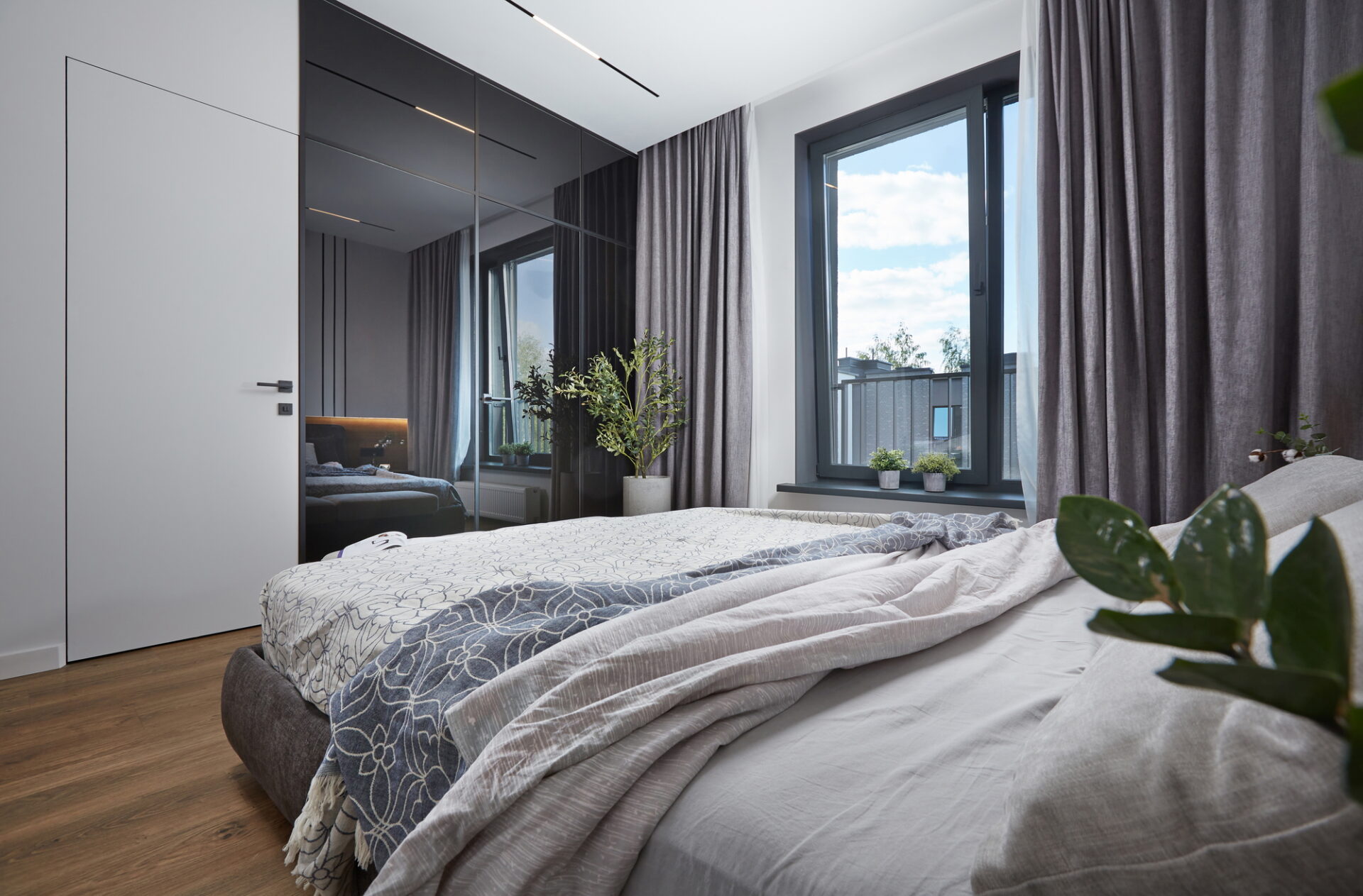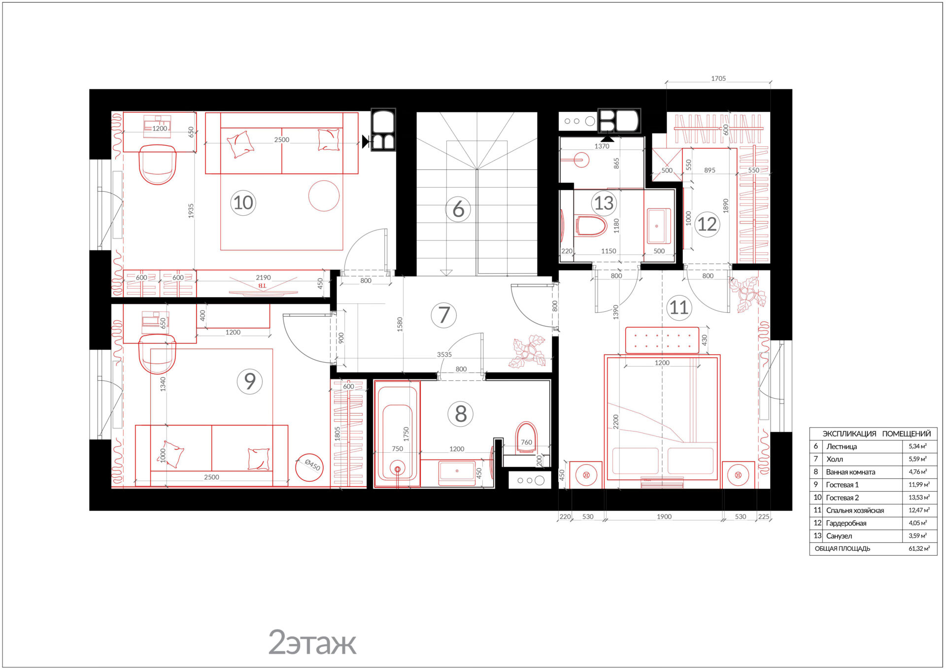 На первом этаже просторная кухня-гостиная, с отдельной прихожей. На втором этаже: мастер-блок со спальней, гардеробной и душевой. Также на втором этаже разместили 2 гостевые комнаты, которые в обыденное время используются как кабинеты.