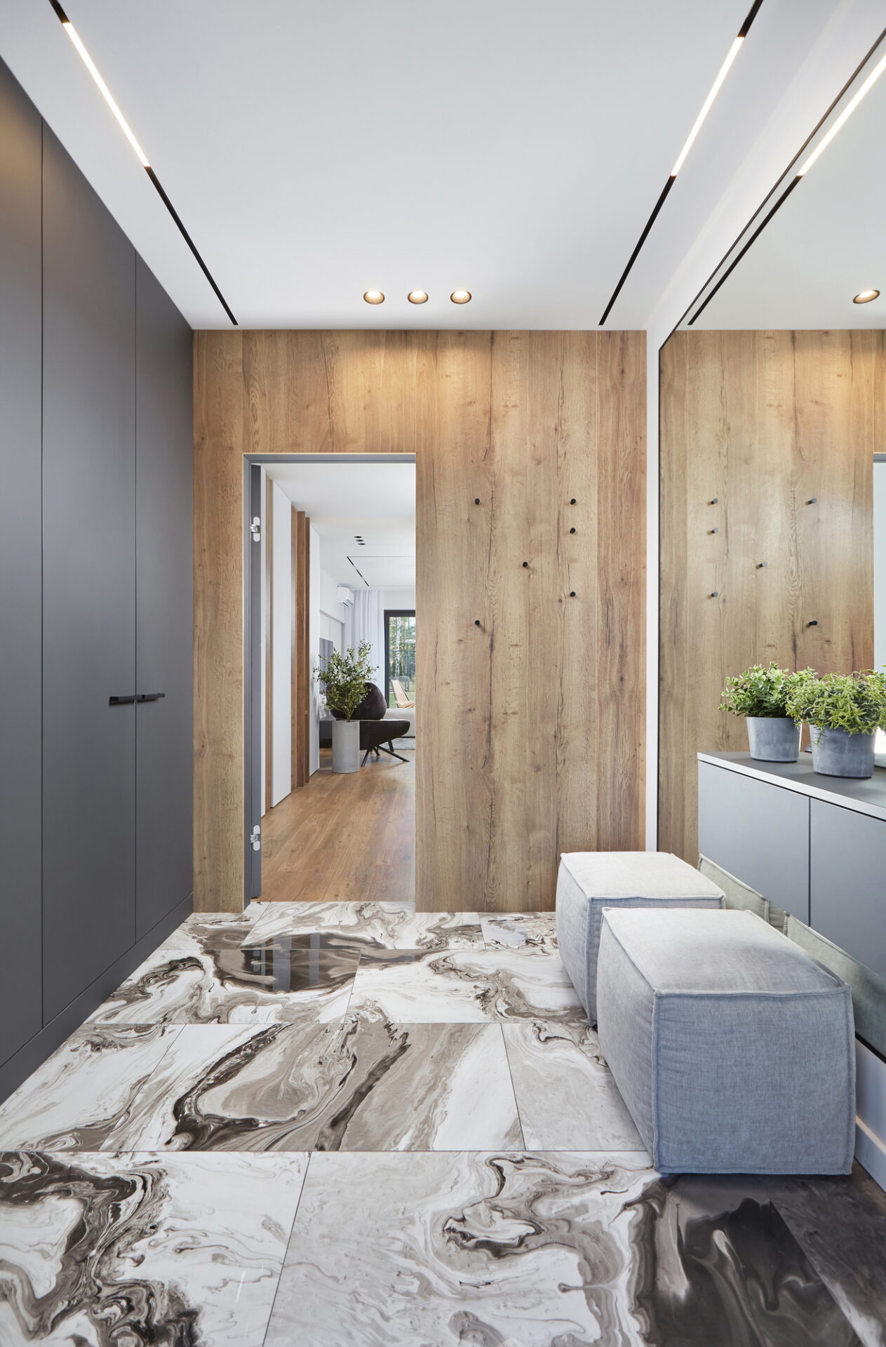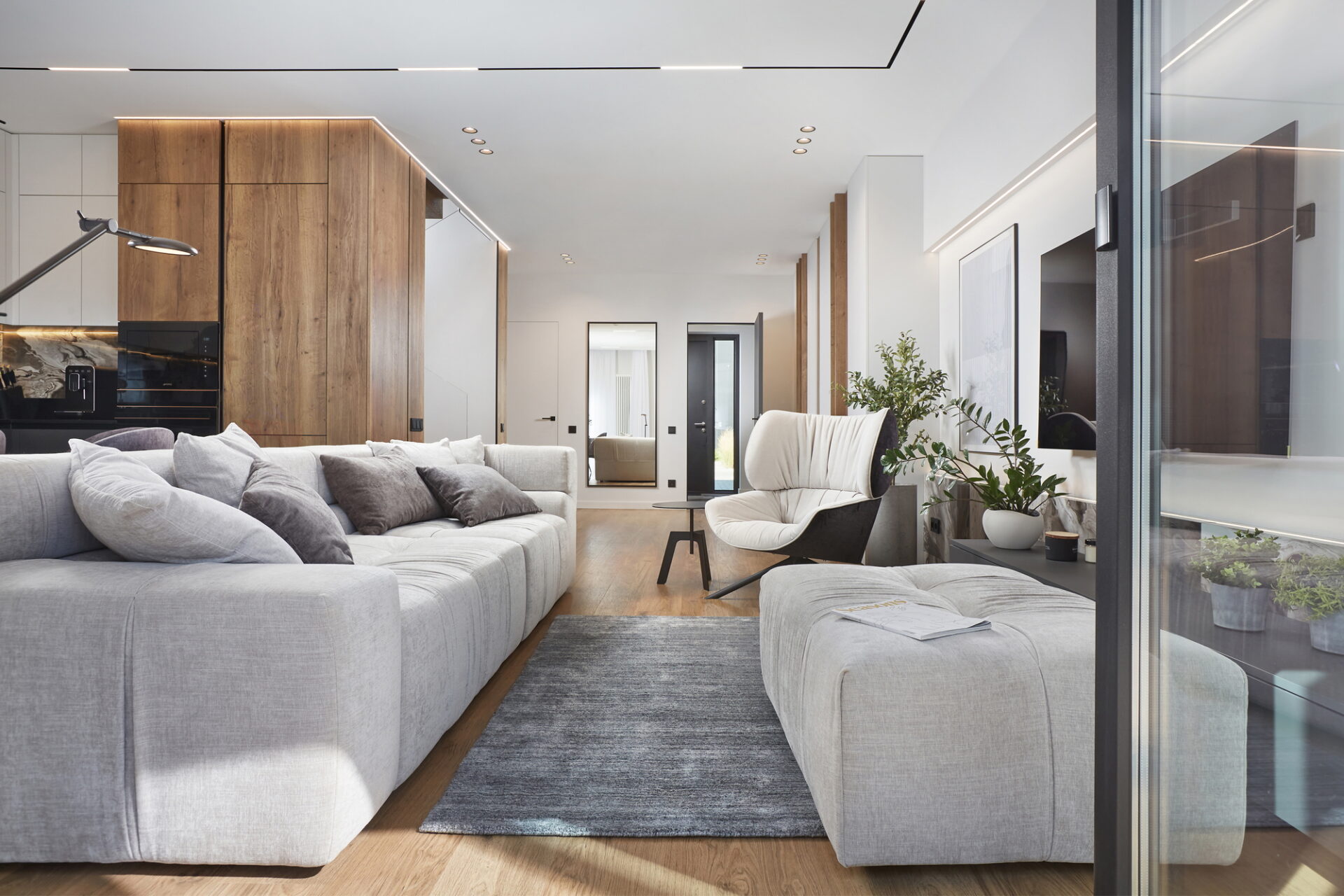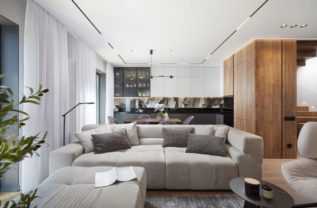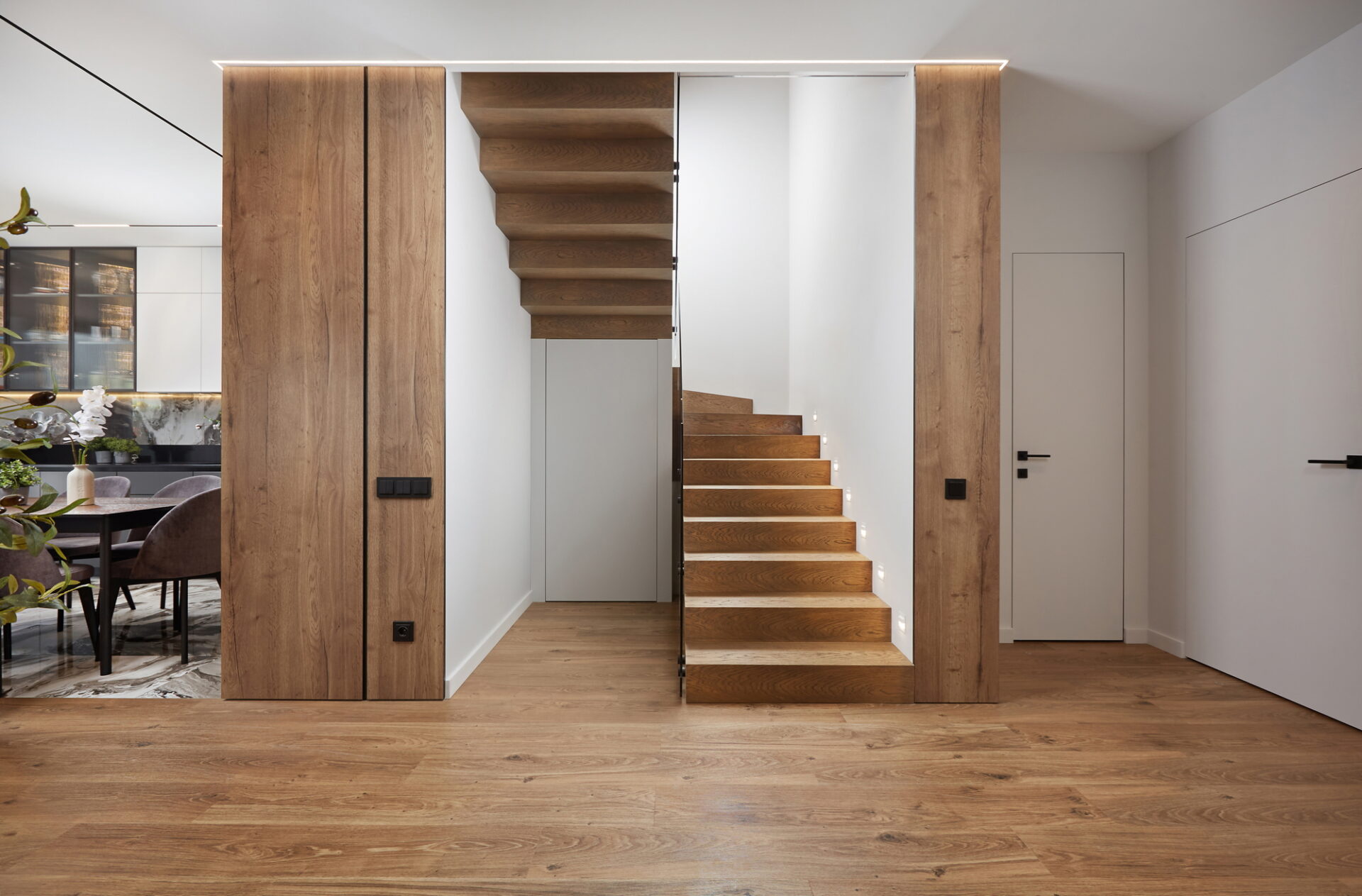Проект таунхауса для семьи из 2-х человек. По концепции, это светлый интерьер, с нотами минимализма, лёгкости. В целом интерьер монохромный и и без большого кол-ва оттенков и цветов. Призван не перегрузить человека находящегося в нем. Основным акцентом является древесноподный цвет, привносящий теплоту. Фактура «жидкого» камня, графитового камня насыщенного, соседствует с гладкими плоскостями.