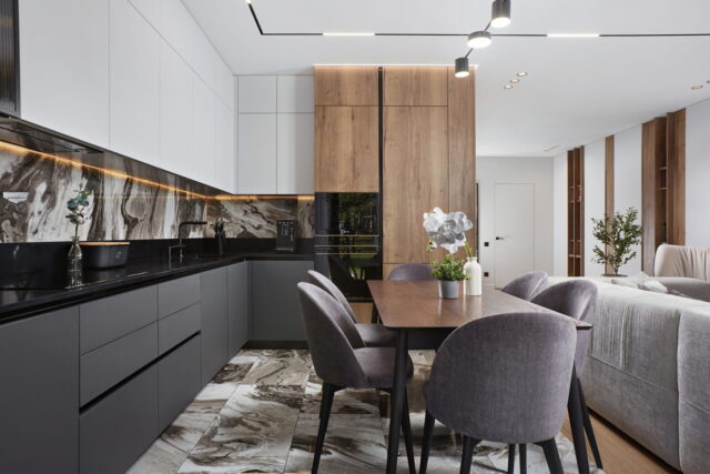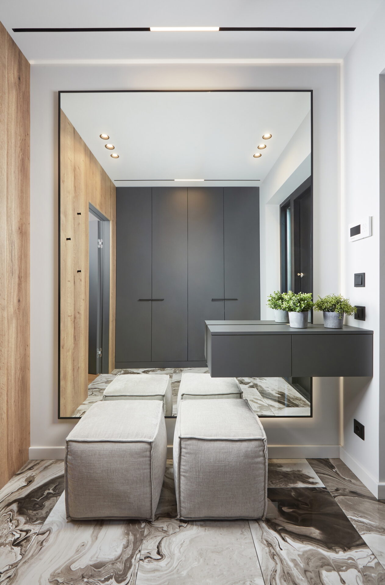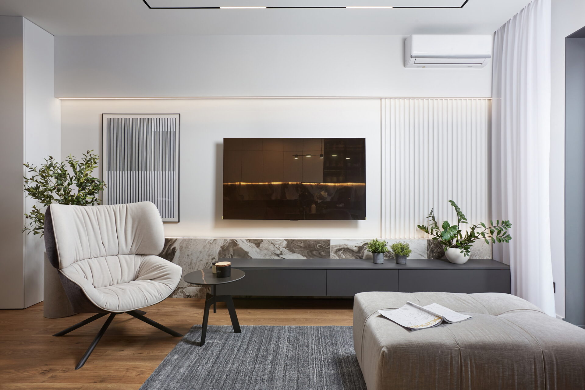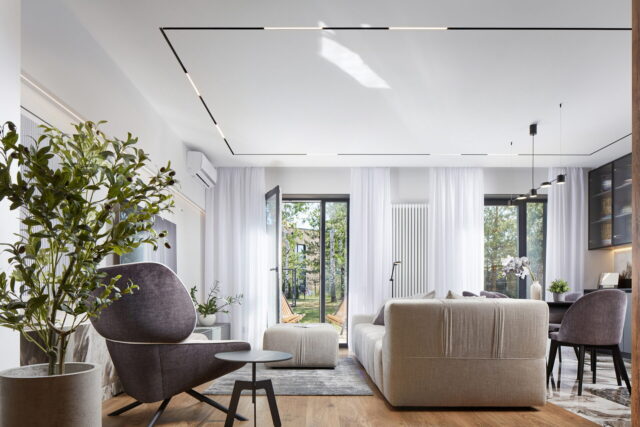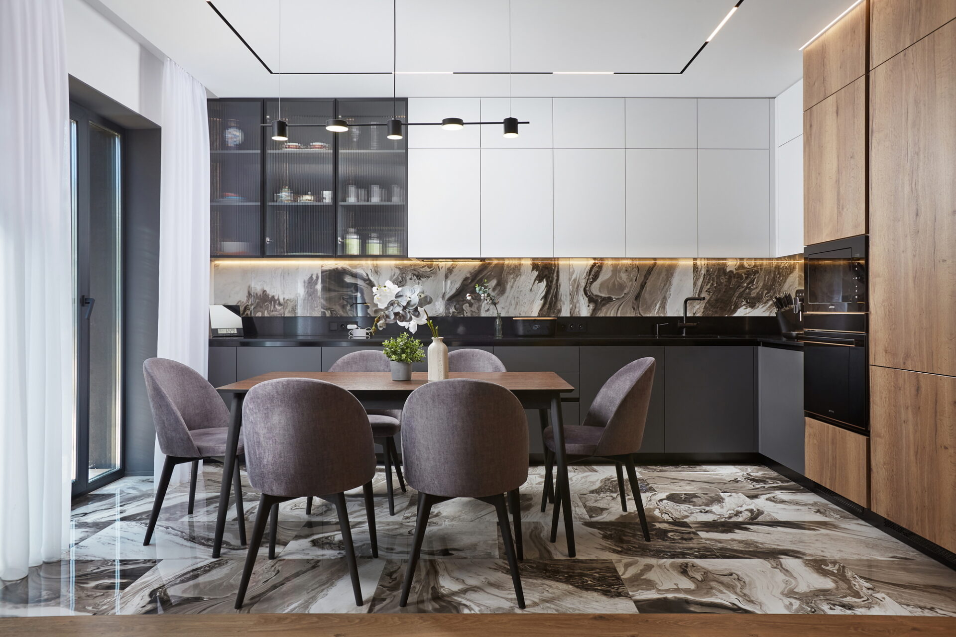 Проект таунхауса для семьи из 2-х человек. По концепции, это светлый интерьер, с нотами минимализма, лёгкости. В целом интерьер монохромный и и без большого кол-ва оттенков и цветов. Призван не перегрузить человека находящегося в нем. Основным акцентом является древесноподный цвет, привносящий теплоту. Фактура «жидкого» камня, графитового камня насыщенного, соседствует с гладкими плоскостями.
