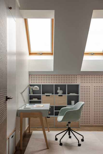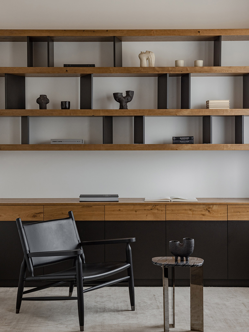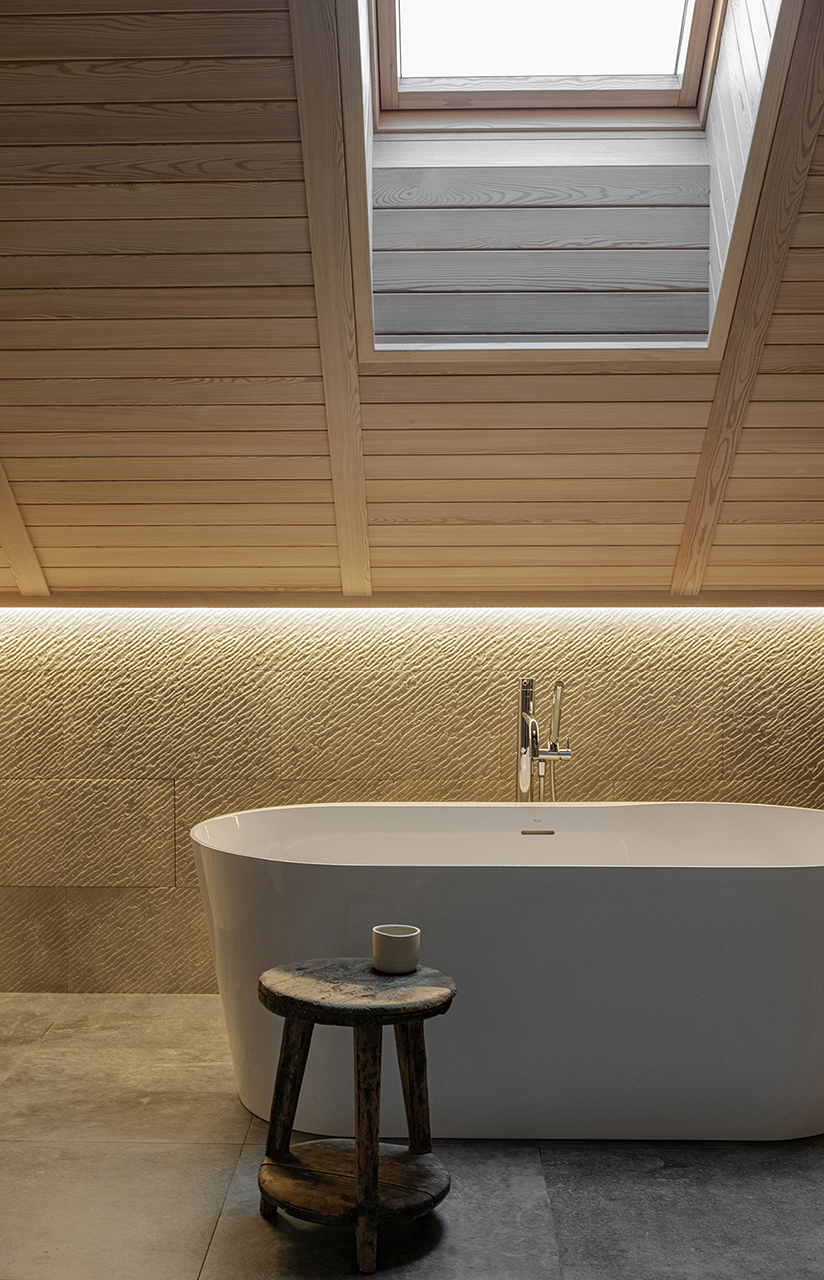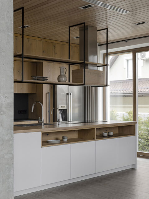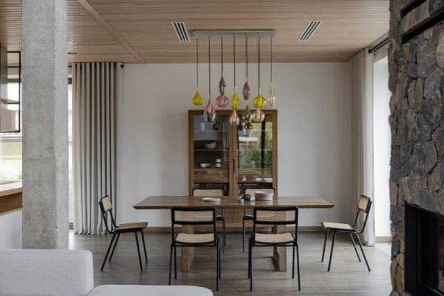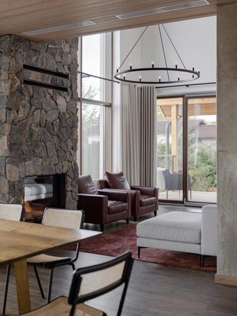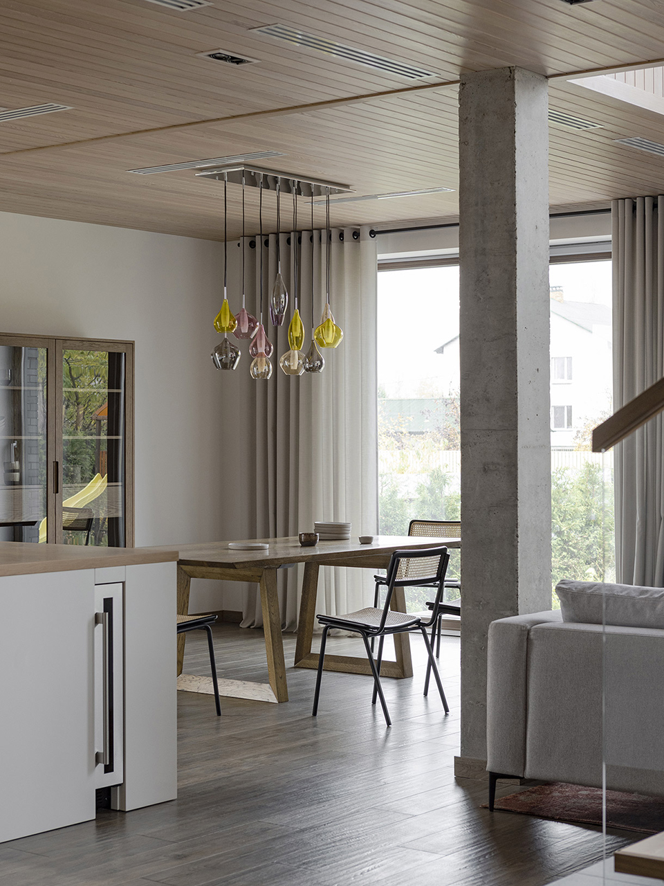 Работая над проектом, мы постоянно балансировали на грани современного сдержанного стиля и уютного деревянного дома. Грубый камин из камня на фоне минималистичных белых стен, дерево на потолке и современная кухня с грубой текстурой дубового шпона, огромный обеденный стол в компании со стульями и современной люстрой с цветными плафонами — все элементы играют на контрасте стилей, но при этом идеально гармонируют между собой.