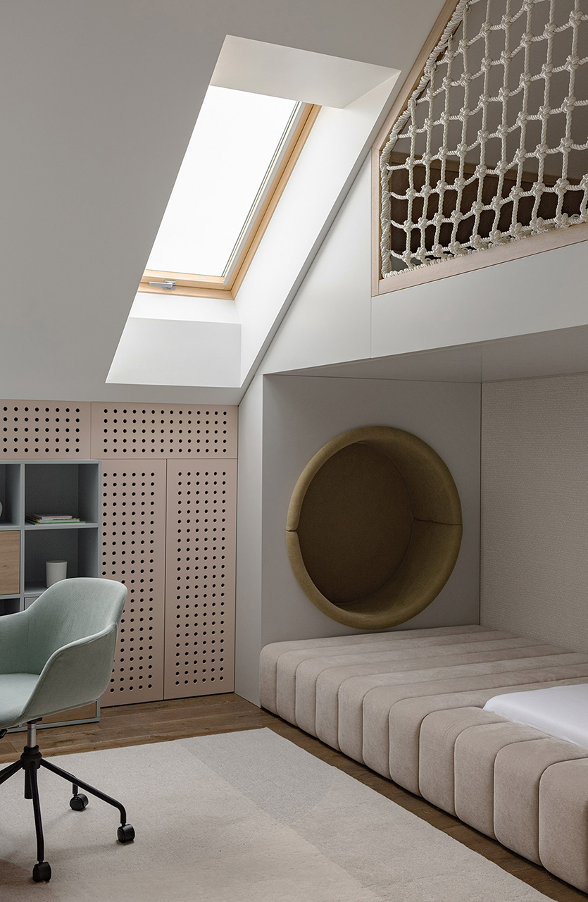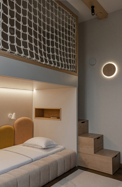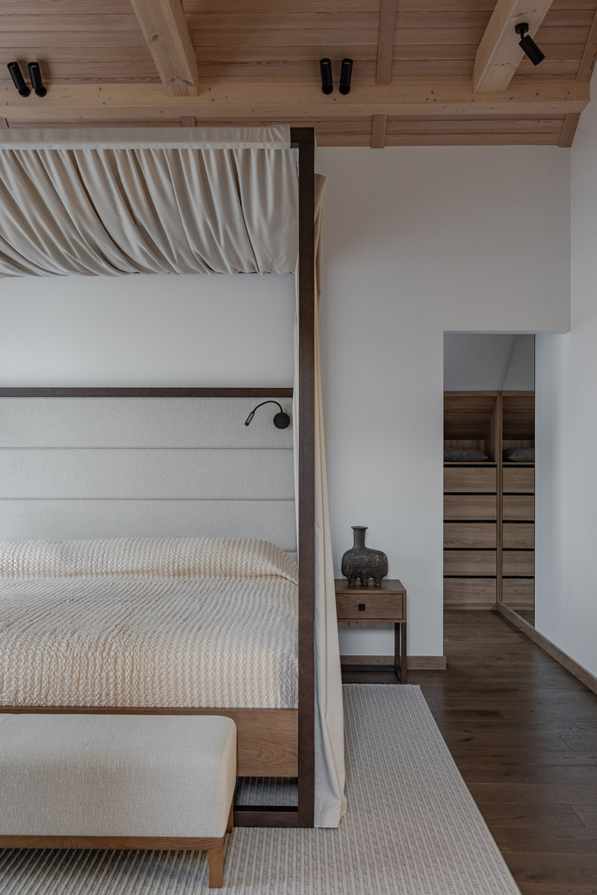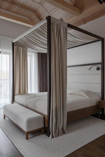 Второй этаж дома традиционно был отдан под приватную зону для хозяев. Большая часть этажа была отведена под спальный блок, состоящий из мастер-спальни, гардеробной и просторной мансардной ванной комнаты. Центральным элементом спальни можно по праву считать большую «королевскую» кровать с балдахином. Очень полюбившаяся нам идея с балдахином исходила от самих хозяев дома из-за довольно высоких потолков (более 3,5 м). Также на втором этаже расположилась детская комната для энергичной девочки. Высокий потолок позволил реализовать здесь мечту каждого ребенка — огромную двухъярусную кровать. Второй ярус полностью отдан под игровую зону — любимое место хозяйки комнаты и её маленьких гостей.