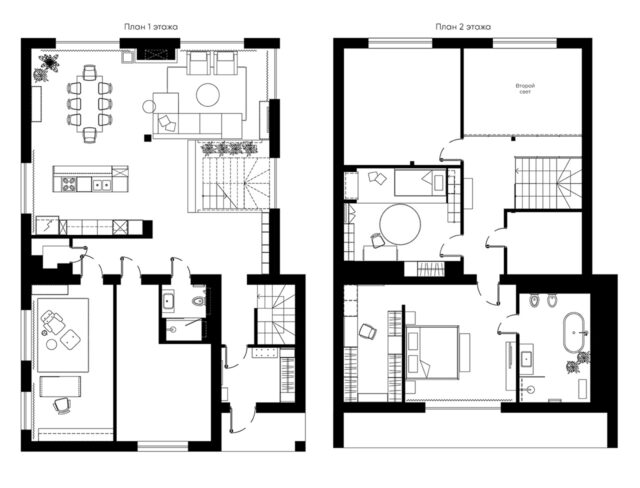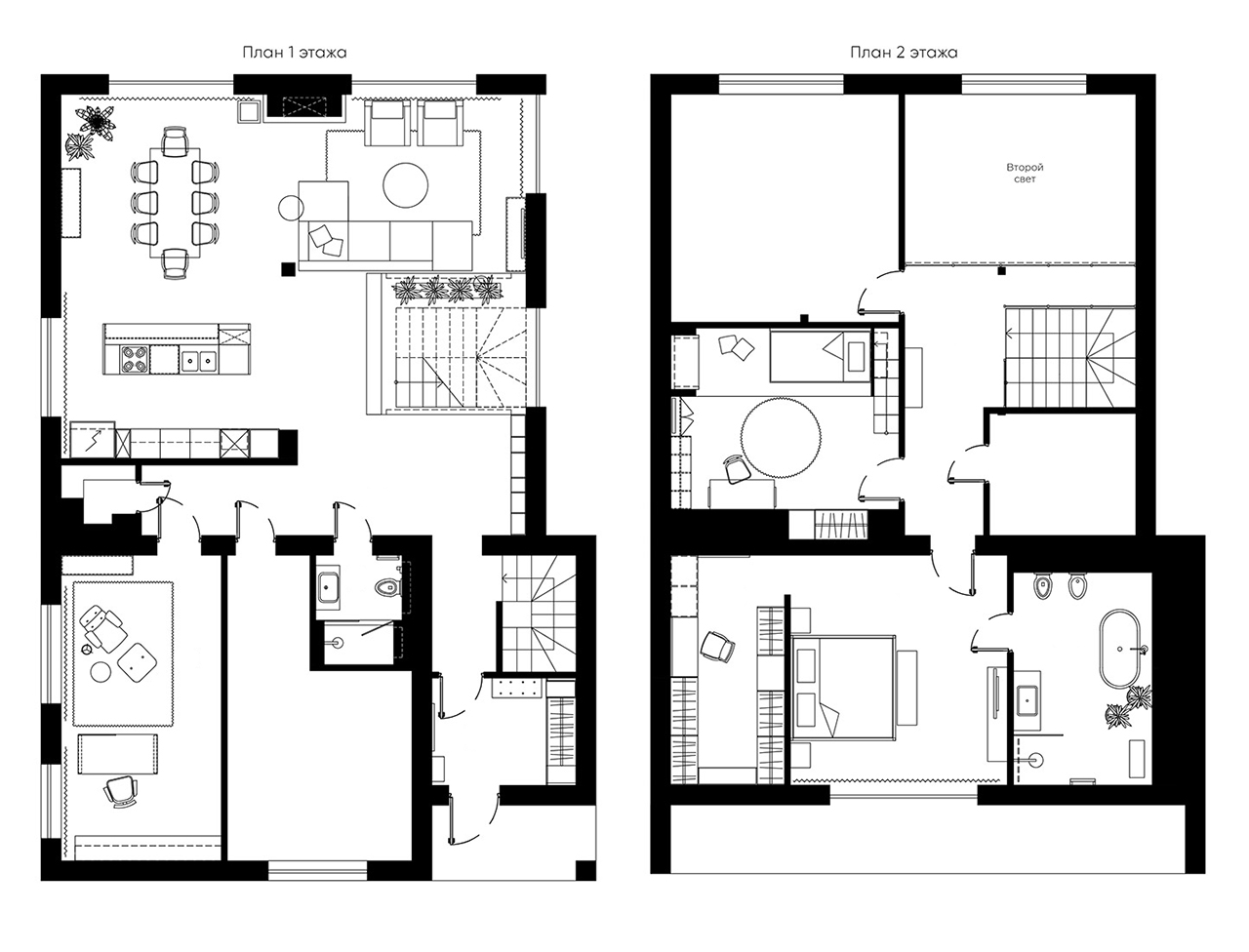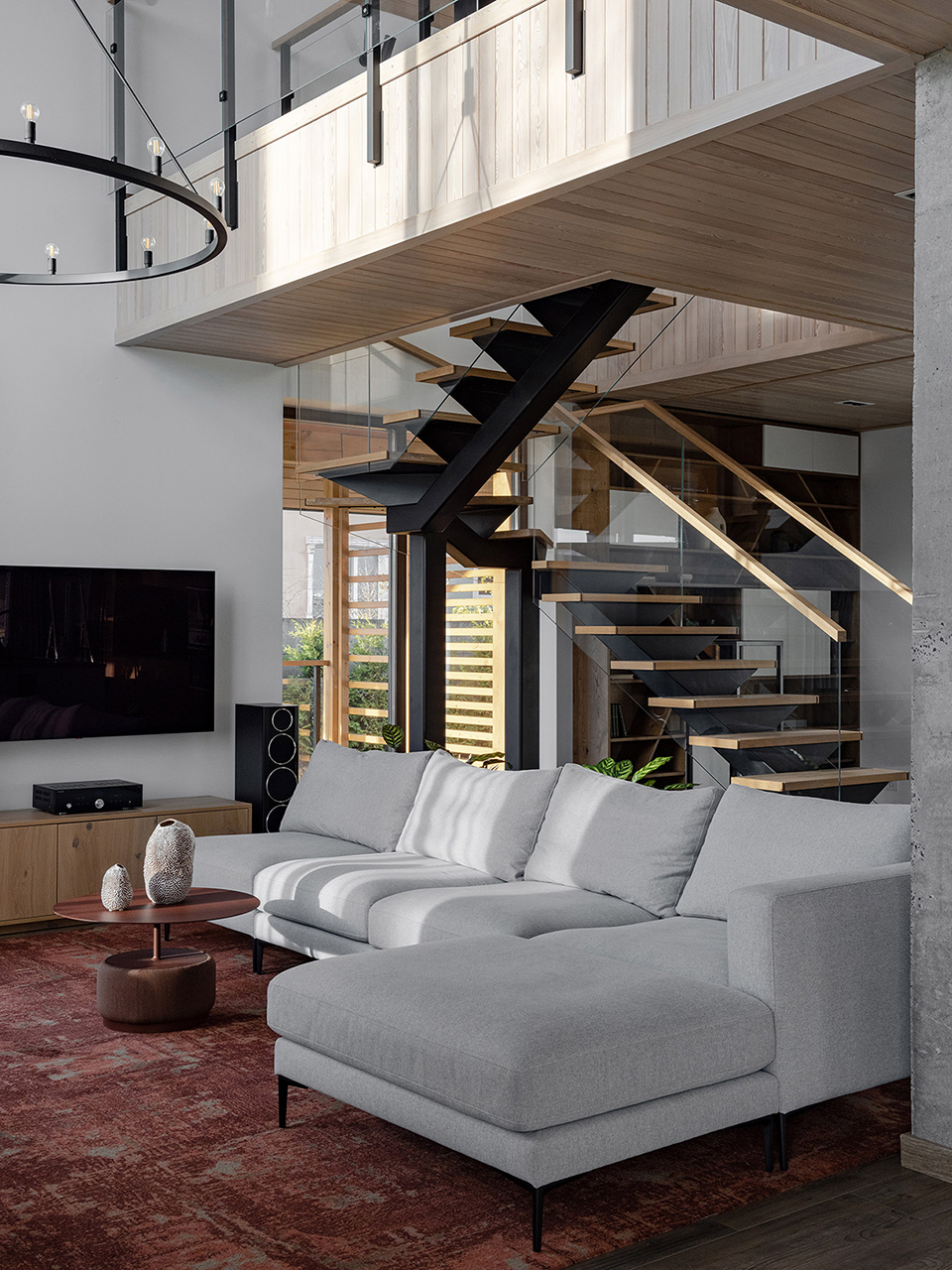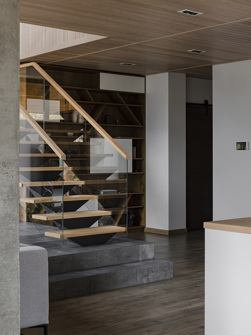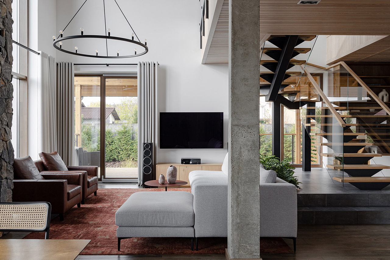 Центром дома и его сердцем стало одно общее пространство гостиной, кухни и столовой. Безусловно неотъемлемой частью и украшением гостиной стала современная легкая лестница, стоящая на подиуме. В подиуме мы предусмотрели нишу для растений, идею которой заказчики приняли с восторгом.