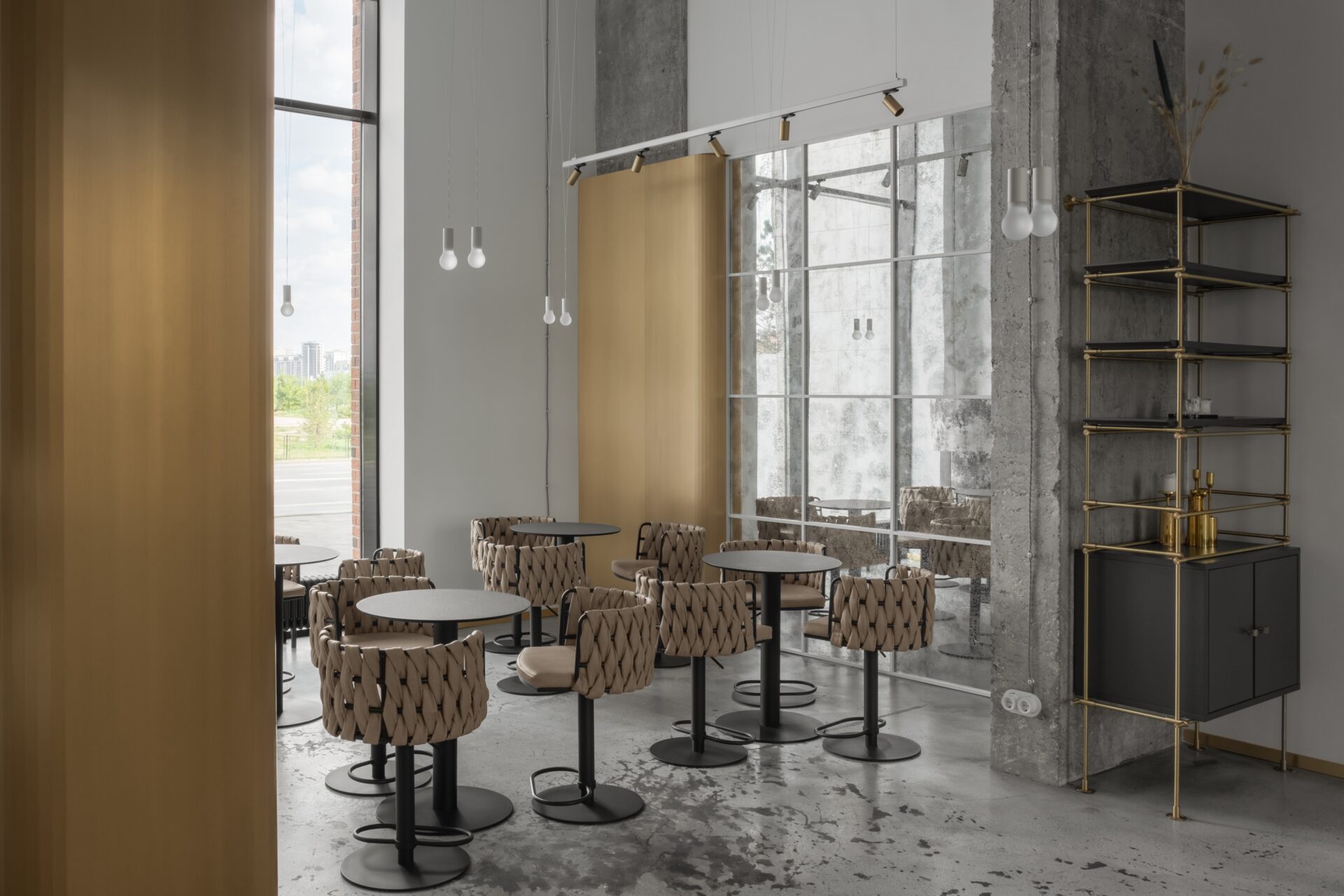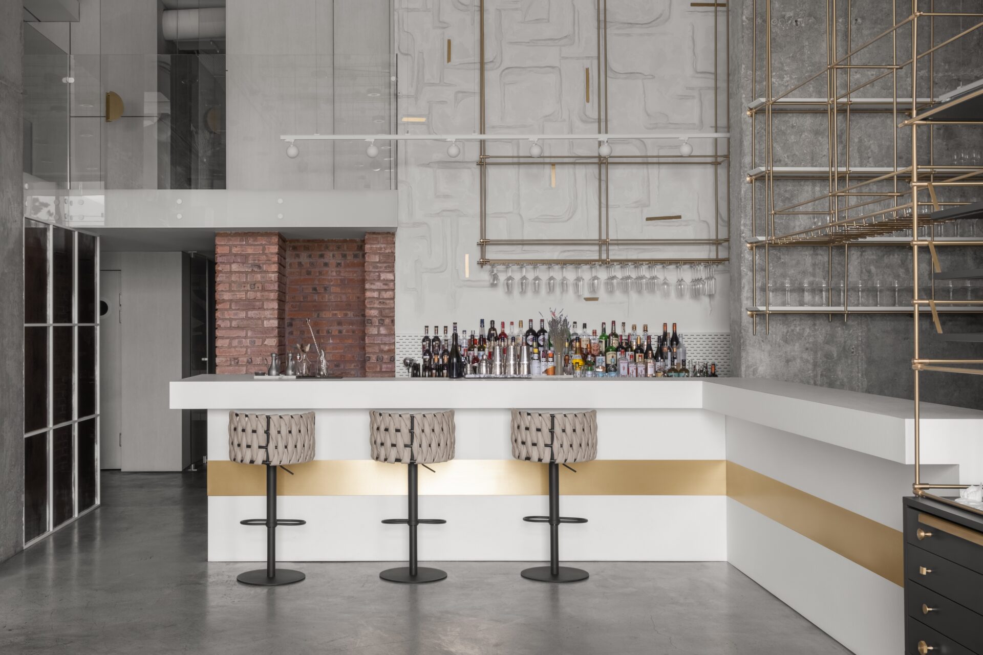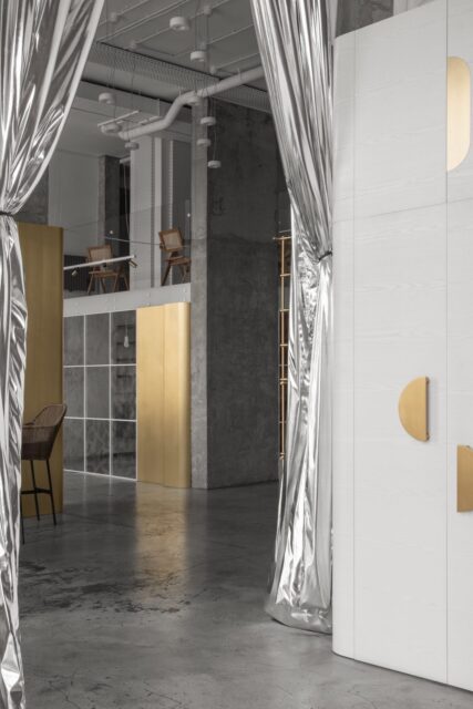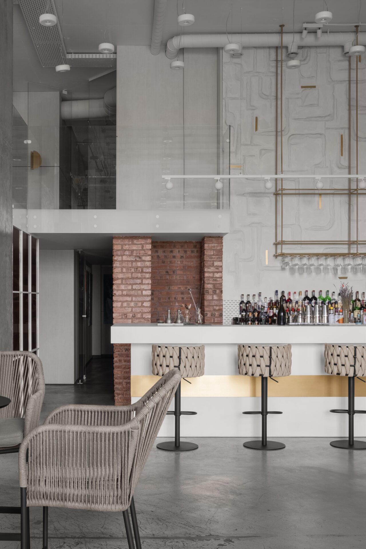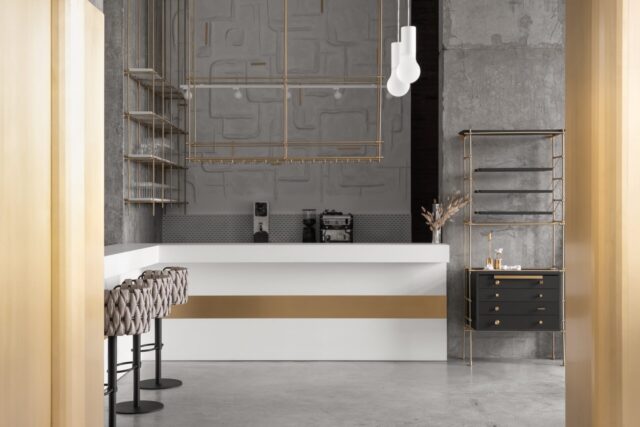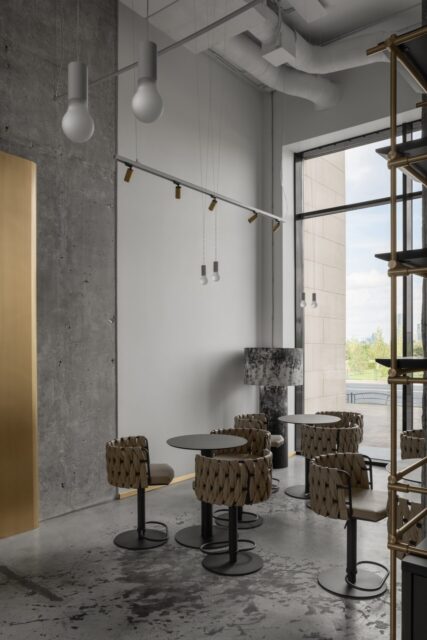 Это событийное место имеет концепт минималистичного стиля, но наполненного стильными и нетривиальными деталями. Например мы применили обычные, перфорированные, металлические лотки, которые используются в черновых работах, как декор, покрасили в белый цвет и подсветили изнутри скрытой подсветкой, получился wow эффект! Также авторский барельеф на стене очень органично вписался в пространство и придал нотки популярного ныне стиля New Nomad style, также этническое панно на стене добавило национального колорита помещению. Латунные колонны придали интерьеру шика и премиальности, а также тепла.