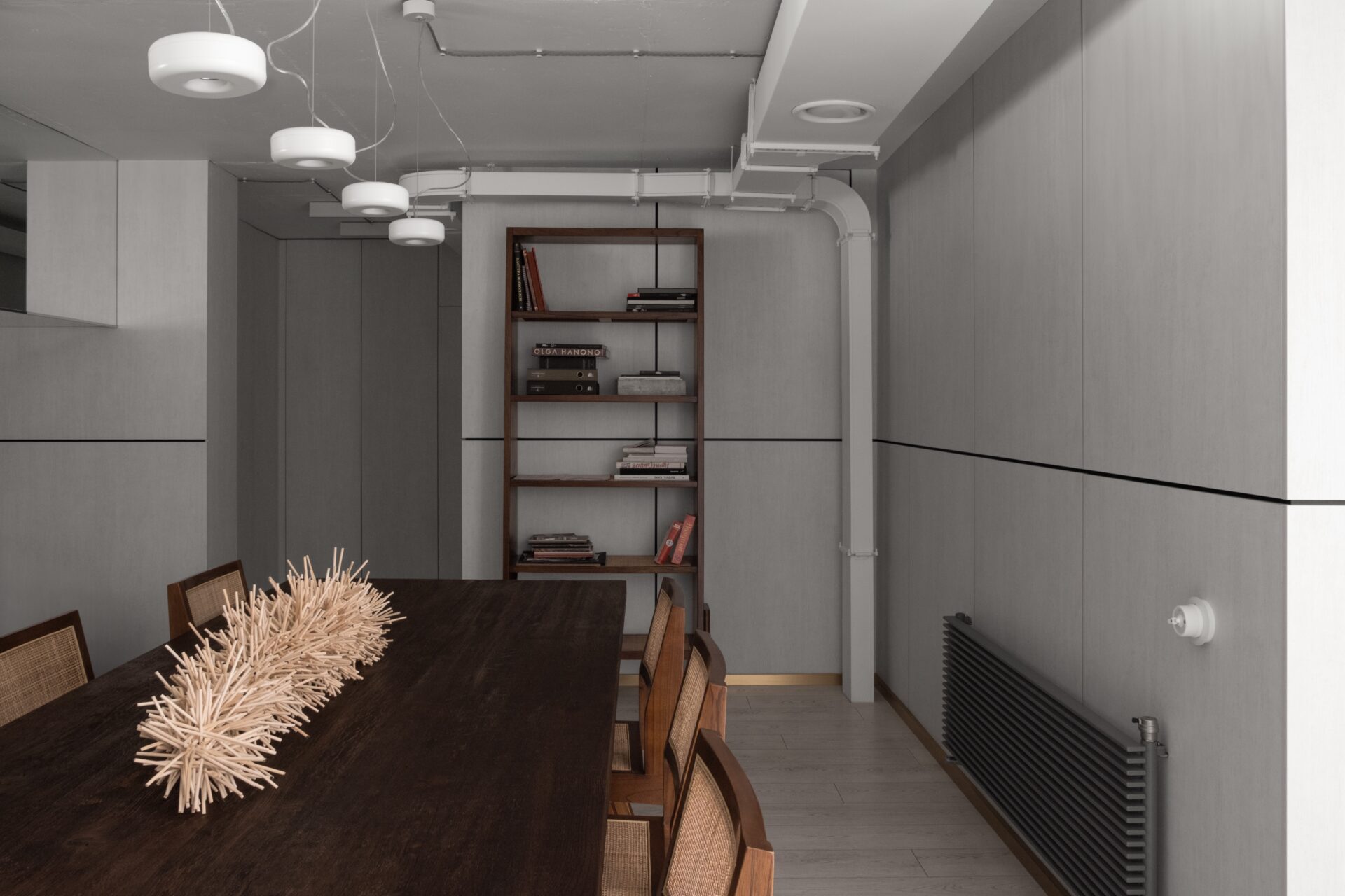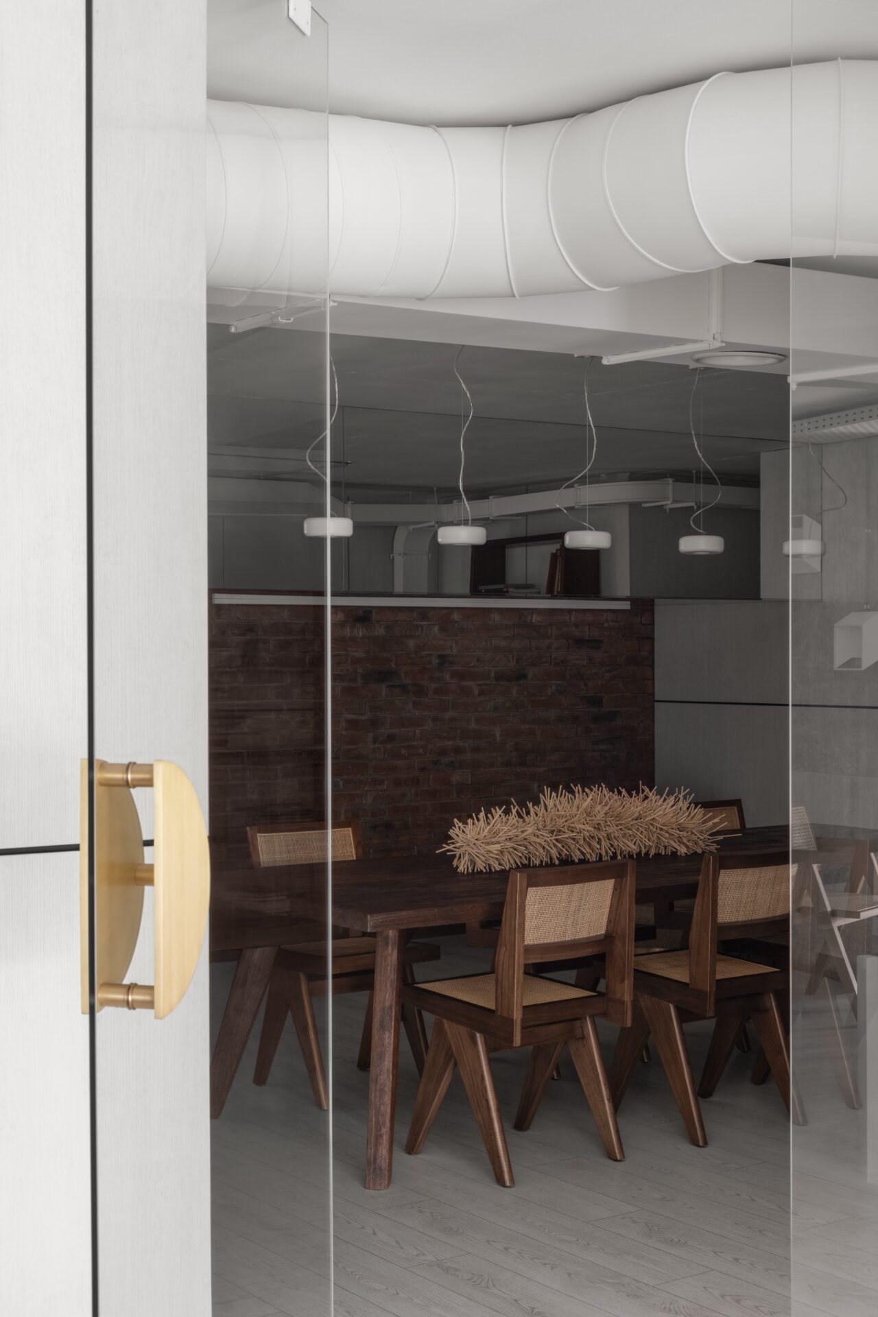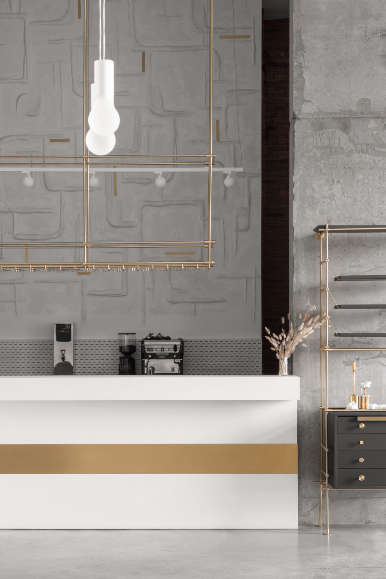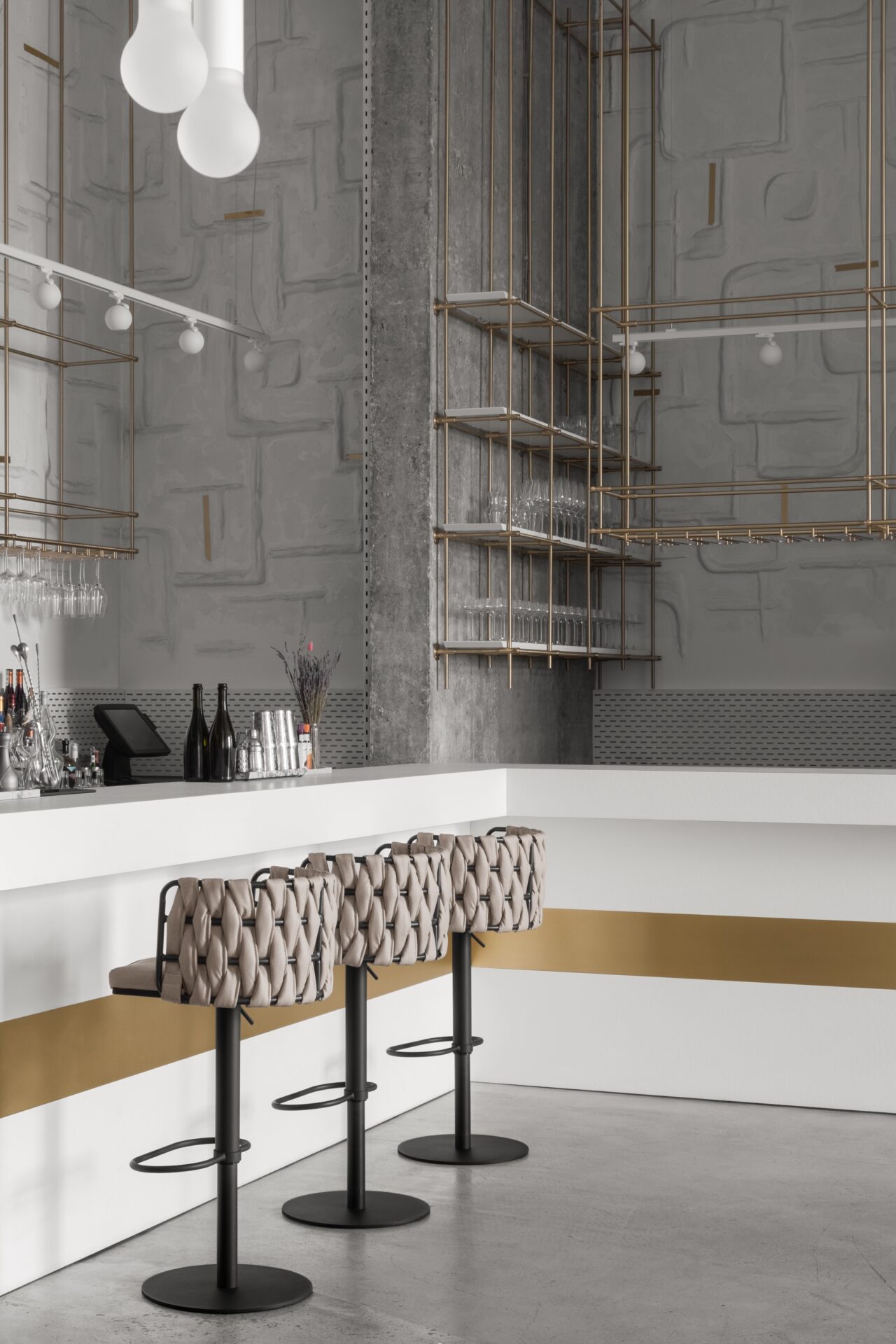 Это событийное место имеет концепт минималистичного стиля, но наполненного стильными и нетривиальными деталями. Например мы применили обычные, перфорированные, металлические лотки, которые используются в черновых работах, как декор, покрасили в белый цвет и подсветили изнутри скрытой подсветкой, получился wow эффект! Также авторский барельеф на стене очень органично вписался в пространство и придал нотки популярного ныне стиля New Nomad style, также этническое панно на стене добавило национального колорита помещению. Латунные колонны придали интерьеру шика и премиальности, а также тепла.