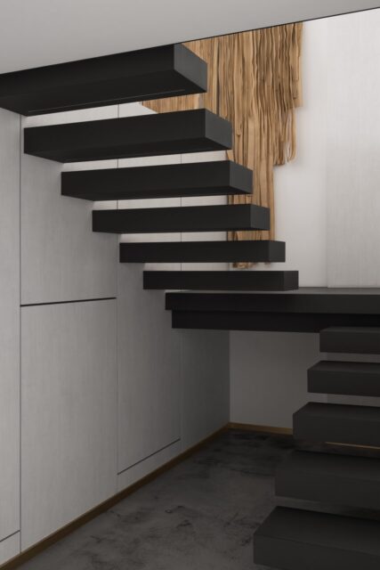 При проектировании и строительстве мы возвели частично мезонин и на нём расположился наш дизайнерский офис. Очень маленькое помещение с массивным, несущим ригелем мы обсутроили так, что оно стало уютным и стильным, а ригель мы обшили зеркальными полотнами и буквально «растворили» в воздухе. Парящая лестница с подсветкой, прекрасные состаренные зеркала, олицетворяющие собой дворцовый шик и неожиданные марморные полы тераццо в санузлах.