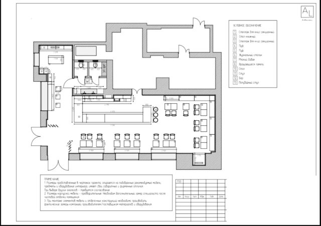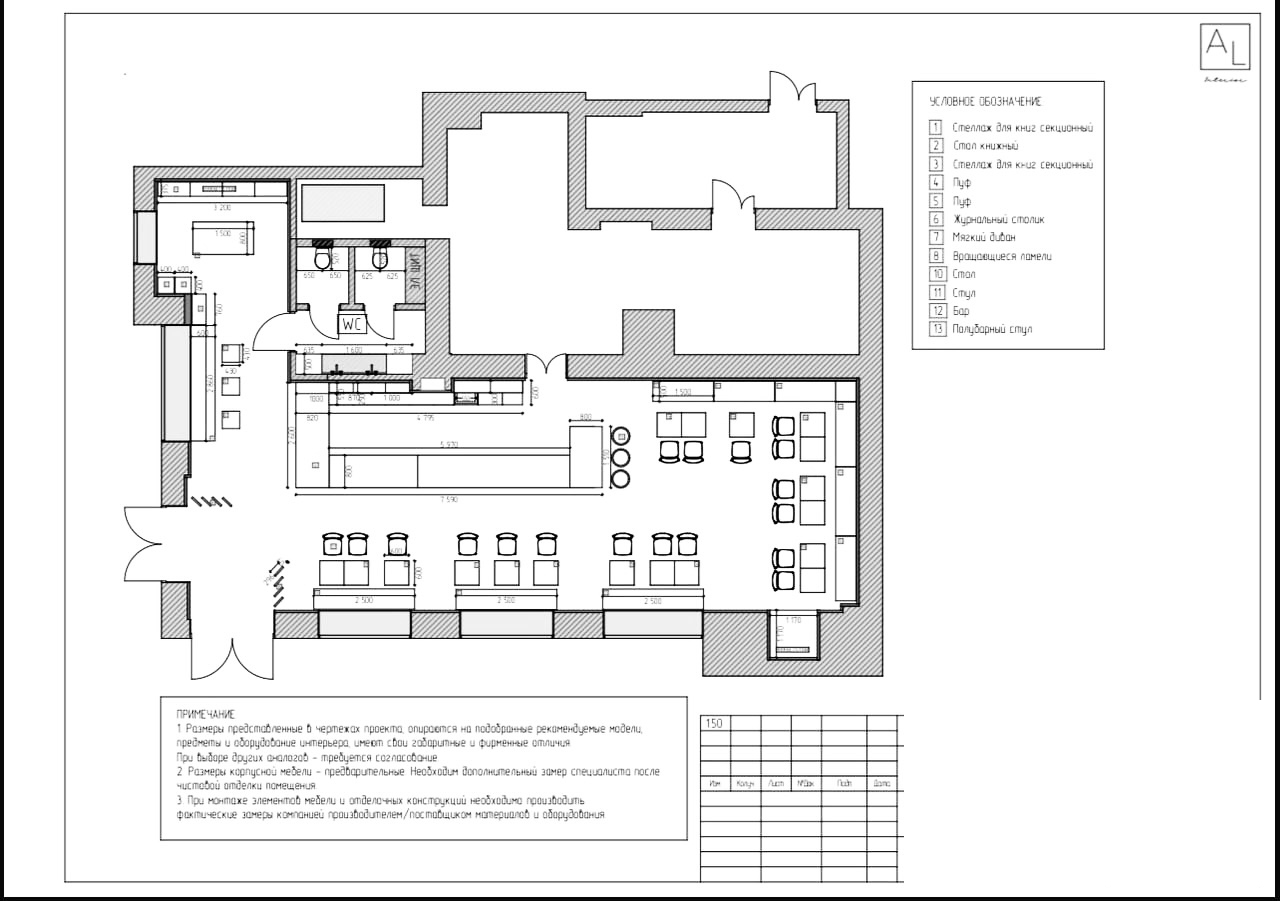 Исходное помещение в 200 м2, доставшееся после универсама, унаследовало не только въевшийся аромат овощного магазина, но и имело крайне «давящее» настроение. Негативные стороны оставим, будем говорить только о плюсах ). Потенциал оказался велик, большие окна с видом на театральный сквер, правильная геометрия и даже возможность форматирования планировки в нашу пользу. Зону кофейни и книжного мы расположили на 126 м2, оставив возможнрость для полноценного технического пространство кухни.