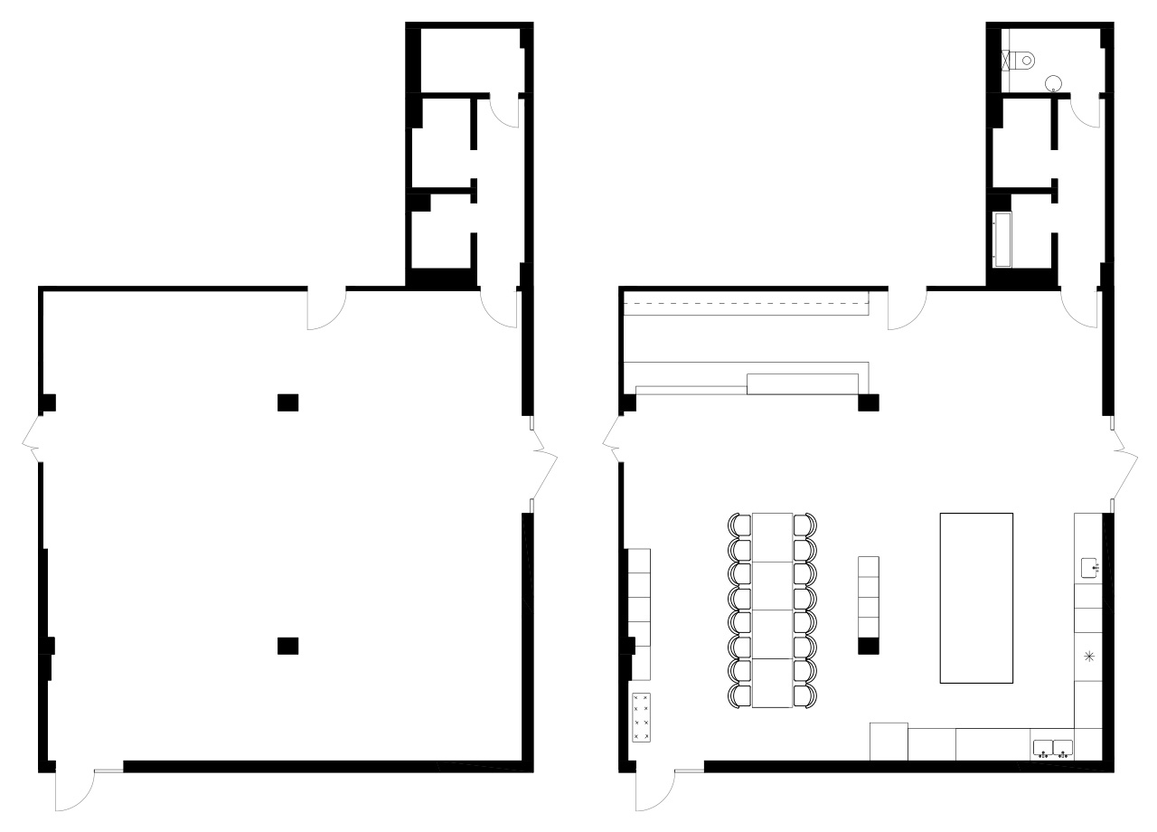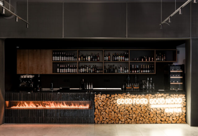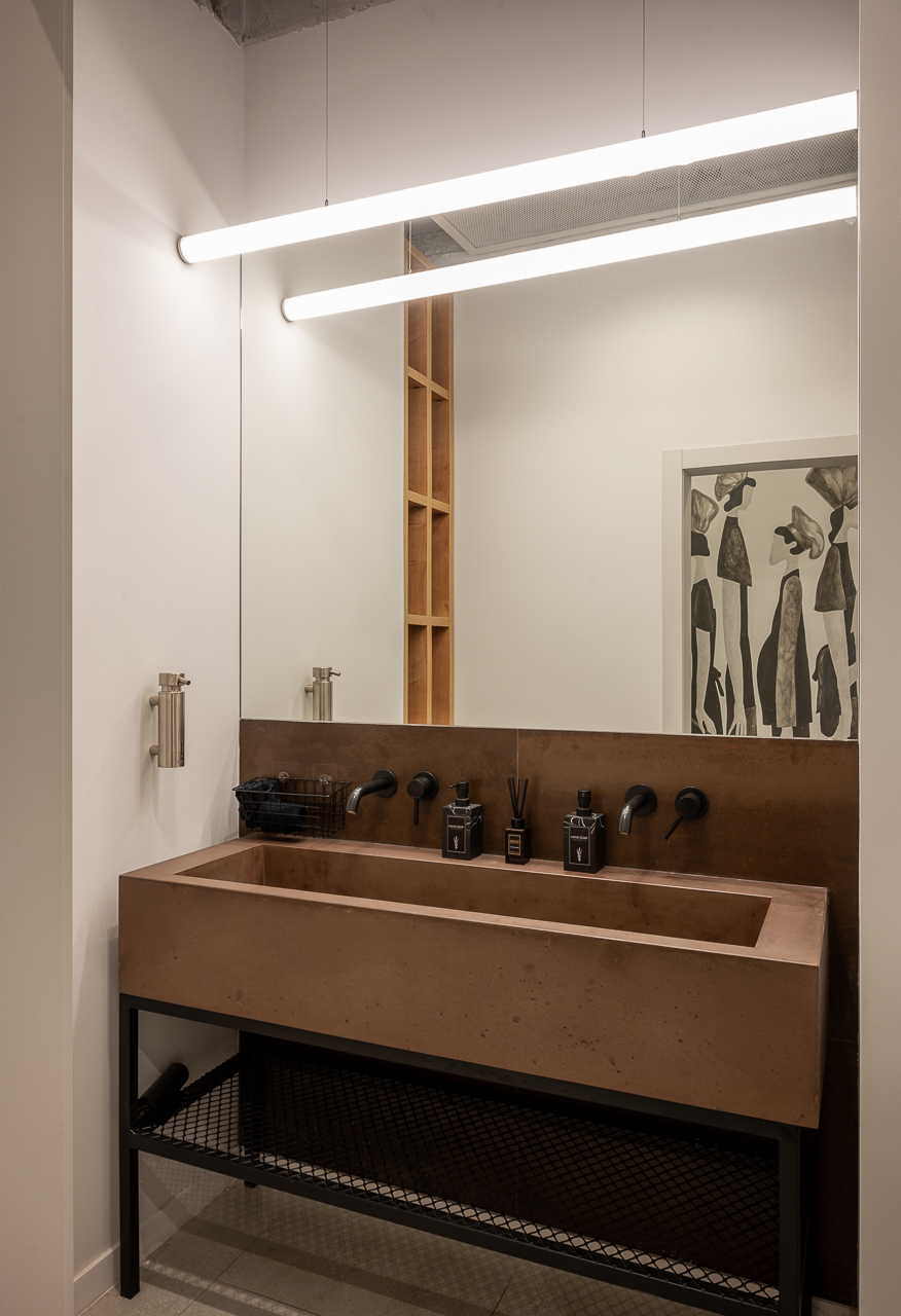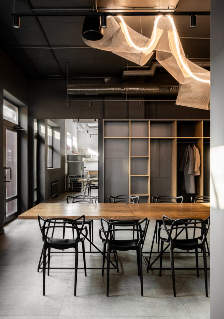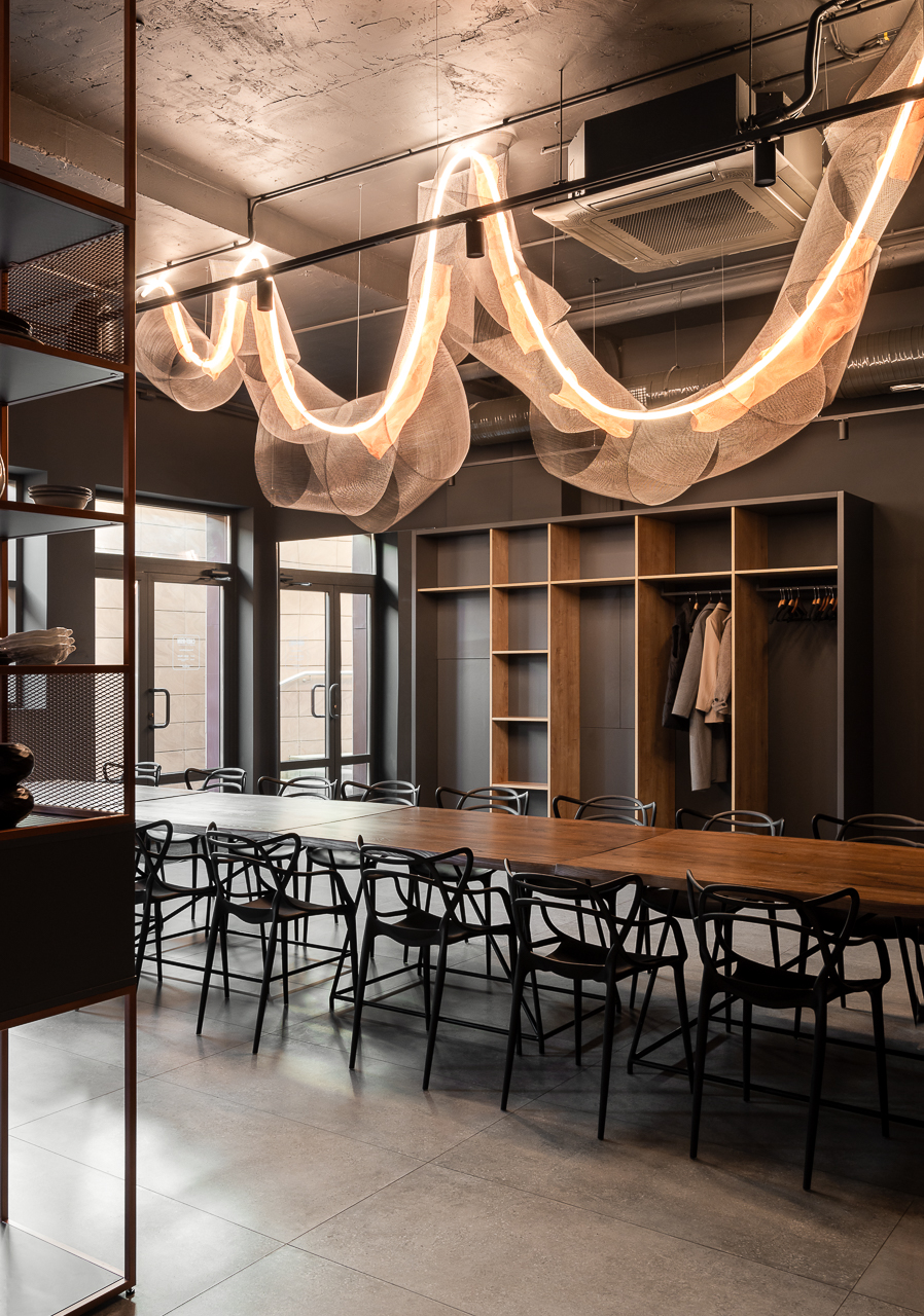 Цветовая палитра довольно классическая для промышленной кухни, это два металла, медь и нержавейка, дерево, белый и черный цвет и бетон. Зонирование помещения на производственную зону — поварской стол и зону ресторана. Эти зоны было решено разделить условно на белую — для готовки и черную, камерную, для отдыха. Промышленную вытяжку для поварского стола облицевали медными панелями, которые визуально находятся на белом фоне и притягивают к себе внимание, а светильники вмонтированные внутрь вытяжки, светят как будто из ниоткуда, прямо на стол, делая его самым главным в помещении. Зона отдыха вмещает в себя бар и огромный стол с неоновым светильником над ним, который мы также обыграли металлической сеткой, чтобы создать камерность и интимное свечение.