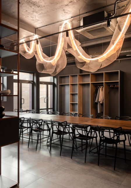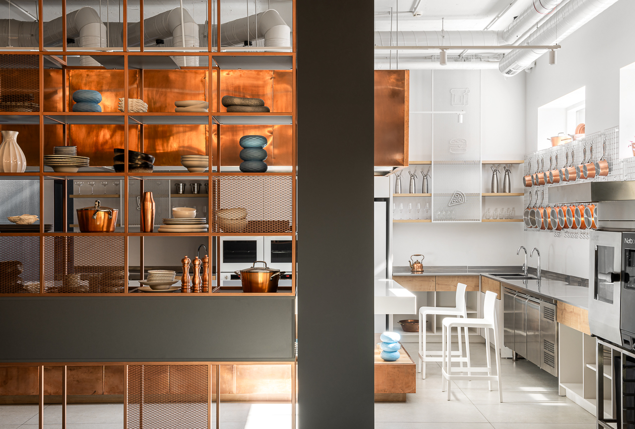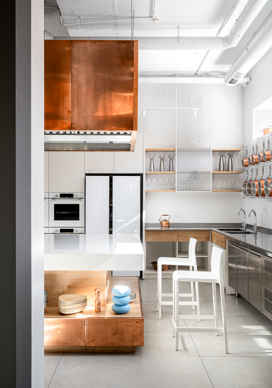 Кулинарная студия в Минске. На стадии разработки проекта заказчики дали полную свободу, что позволило использовать смелые решения, которые и создают необычную атмосферу.
