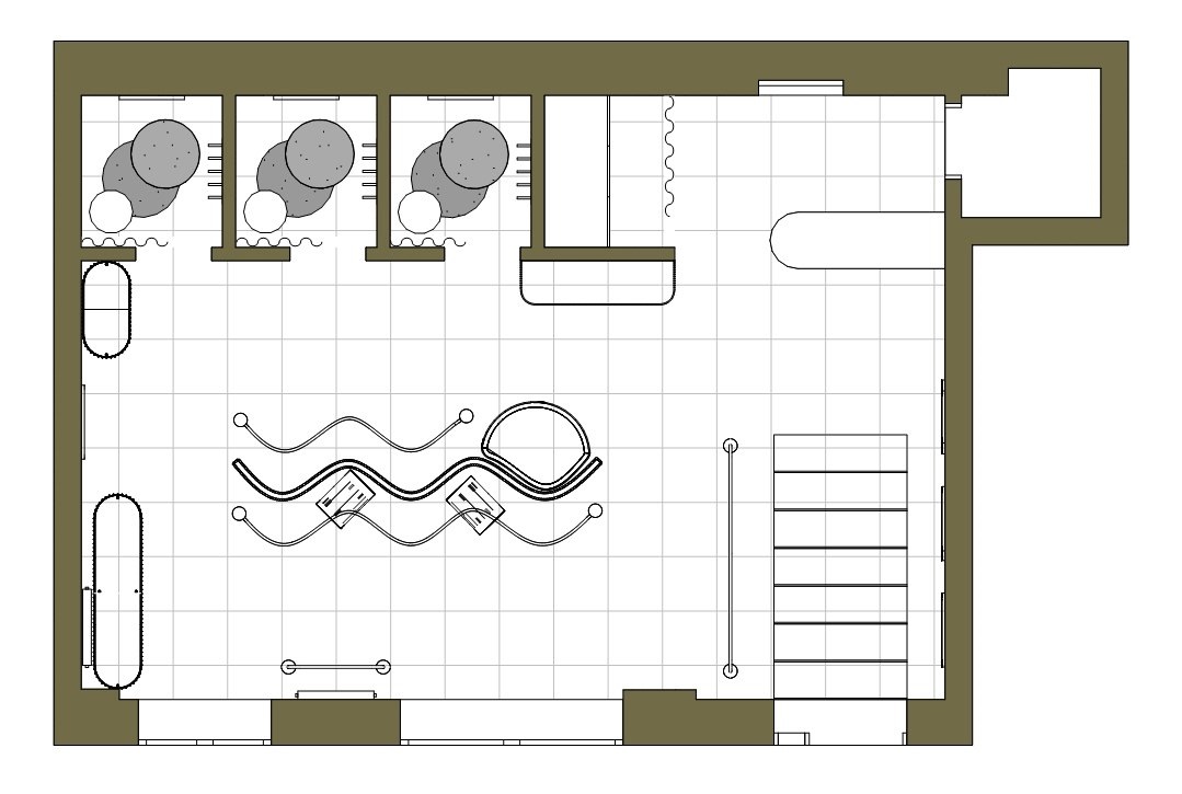 Зал разделен центральной перегородкой, которая разделила поток посетителей шоу-рума и добавила места для одежды и аксессуаров. Также такое разделение сделало зону примерочной более приватной и создало красивый фон для товаров, которые мы видим с улицы через панорамные окна. Перегородка имеет волнообразную форму, эту же форму дублируют подвесные вешалки для одежды в зоне перегородки и светильник над стойкой администратора.