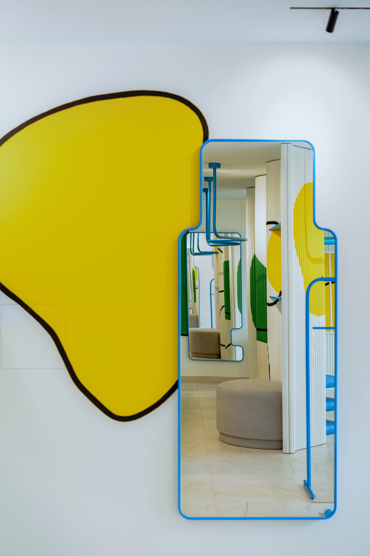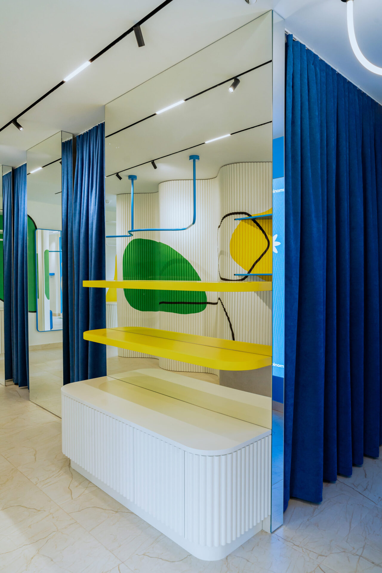 В интерьере использованы фирменные цвета. Основной задачей было визуально увеличить помещение и эффектно разделить пространство на зоны. Чтобы решить эту проблему, блок с примерочными был полностью декорирован зеркалами, что создает иллюзию «зеркального куба», интегрированного в помещение.