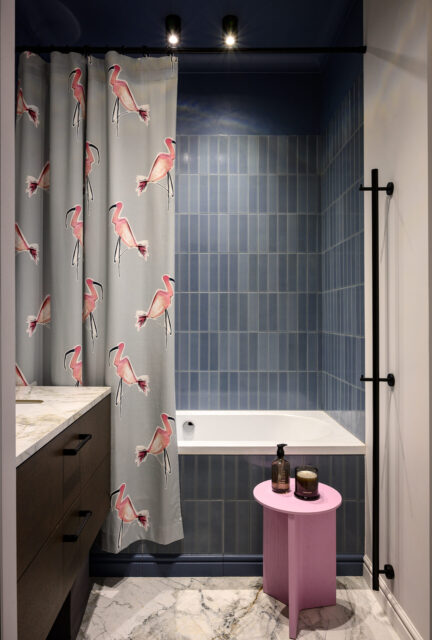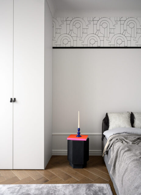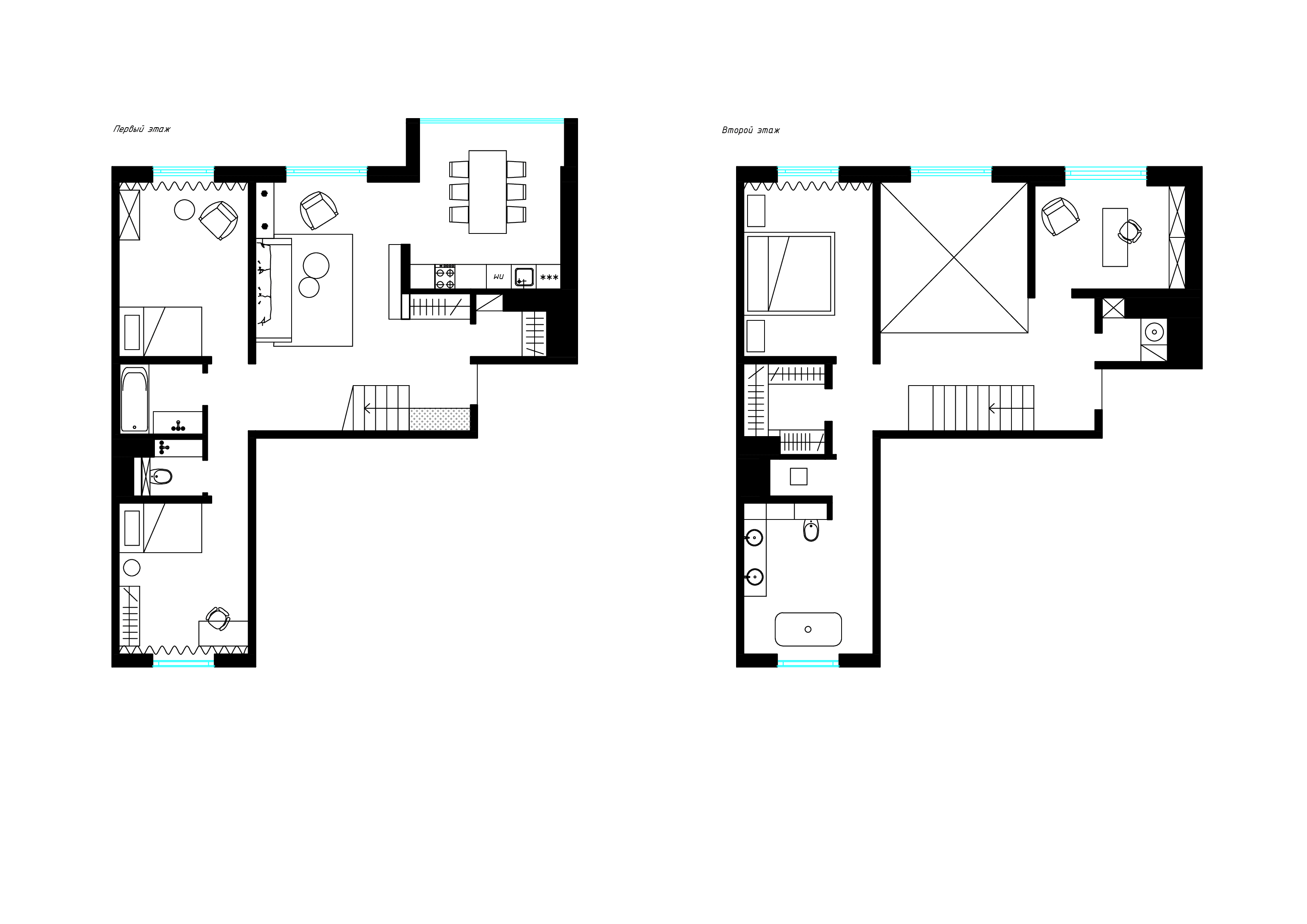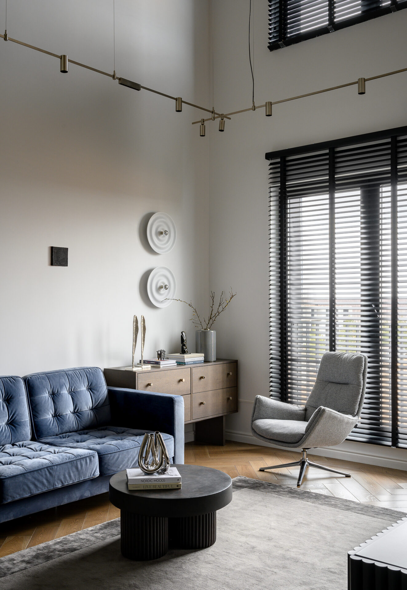 Планировка квартиры создана исходя из потребностей и образа жизни ее жителей. Вся квартира 130 кв. м. разделена на две зоны. Верхний этаж полностью отдан под распоряжение взрослых — изысканная ванна, уютная спальня, гардеробная и кабинет, все создано для уединения и неспешного наслаждения жизнью. Нижний этаж — общие зоны: гостиная, кухня и две детские комнаты. Здесь семья проводит время за совместными ужинами, играми и просмотром кино.