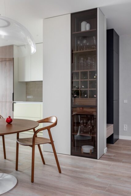 Большой светильник с прозрачным плафоном делает интерьер воздушным, а вечером излучает мягкий и рассеянный свет по всему куполу. Его форме вторит круглое бра в коридоре, создавая создавая вместе со столом композицию кругов.