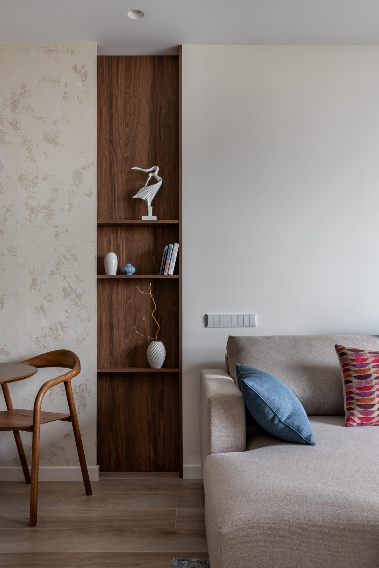 Декоративные полки в гостиной отделяют обеденную зону от зоны отдыха, а также являются дополнительной вертикалью.