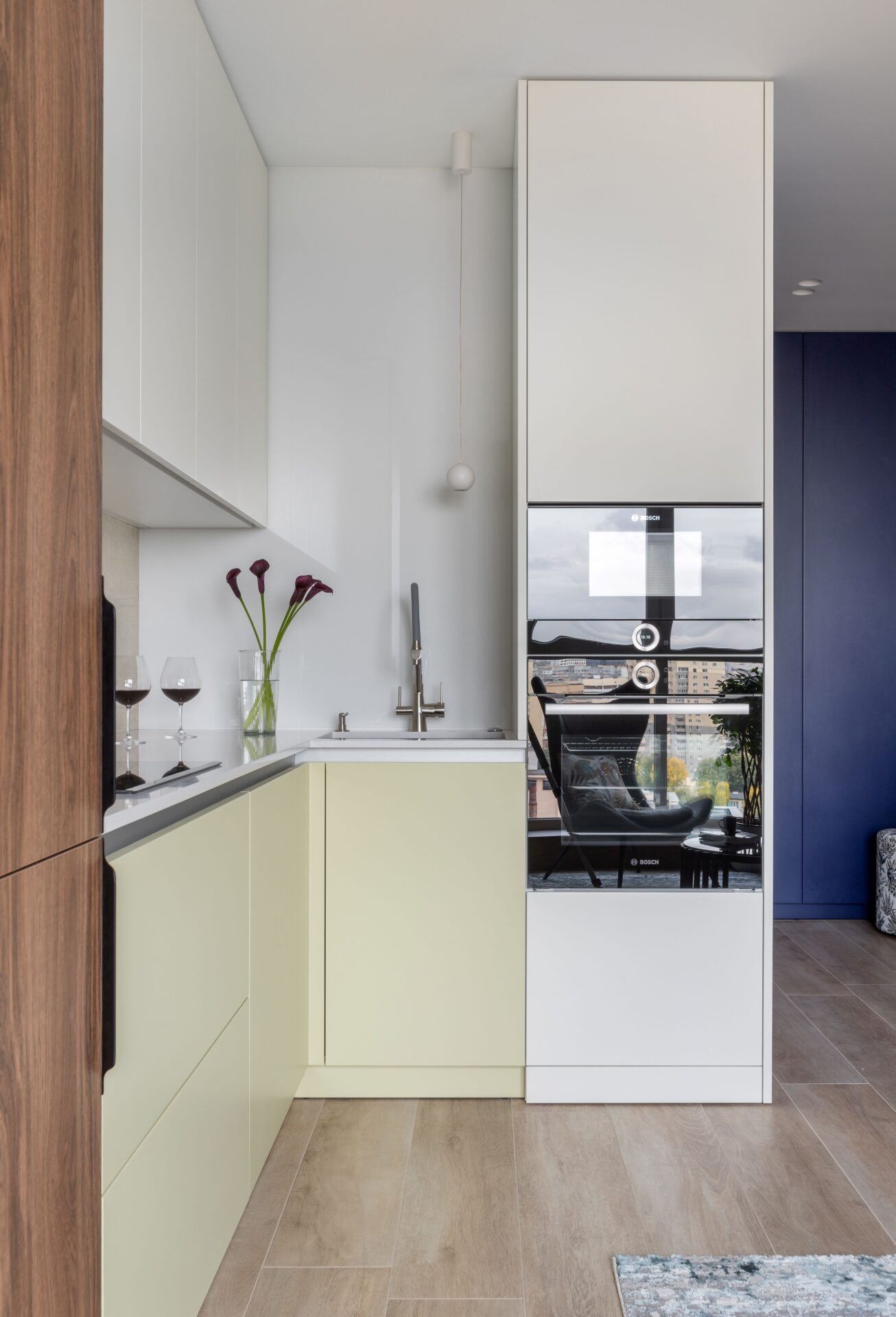 Окна кухни-гостиной выходят на северную сторону, поэтому я постаралась максимально запустить естественный свет во все уголки. Для зоны прихожей выделена небольшая часть, которая «расширена» большим ростовым зеркалом слева от входа. При этом весь необходимый функциональный набор есть.