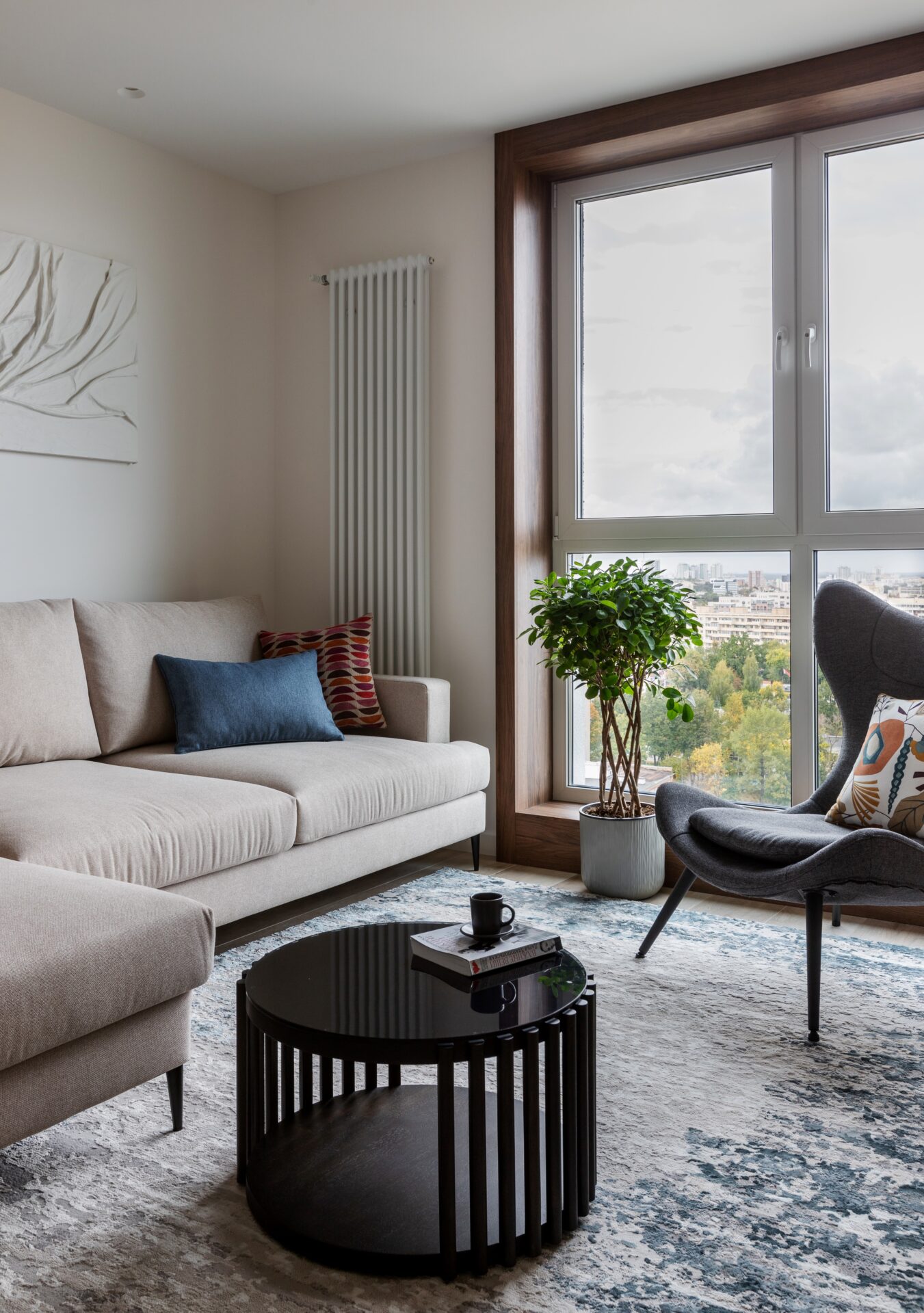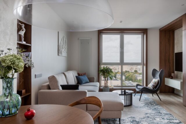 Большое окно гостиной оставили открытым, уютно обернув его теплым деревом. Зону кухни визуально уменьшила. Холодильник визуально является частью гостиной — он встроен в П-образную конструкцию, которая создает нишу для ТВ-зоны и имитирует второе окно.