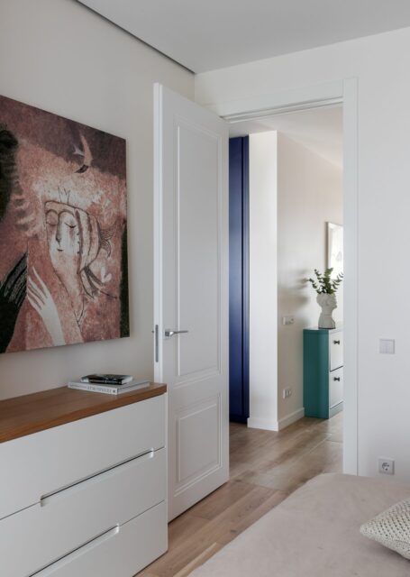 Заказчики просили много мест для хранения. Так в спальне разместились два шкафа и комод при этом не утяжеляя комнату. Шкаф выкрашен в цвет стен и выведен в одну плоскость с комодом.