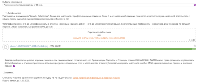 18. Если вы подаётесь в номинацию ДИЗАЙН-ДЕБЮТ — поставьте галочку в поле «Дизайн-дебют». В эту номинацию могут подаваться те, у кого стаж работы не более 3-х лет в сфере дизайна интерьера.